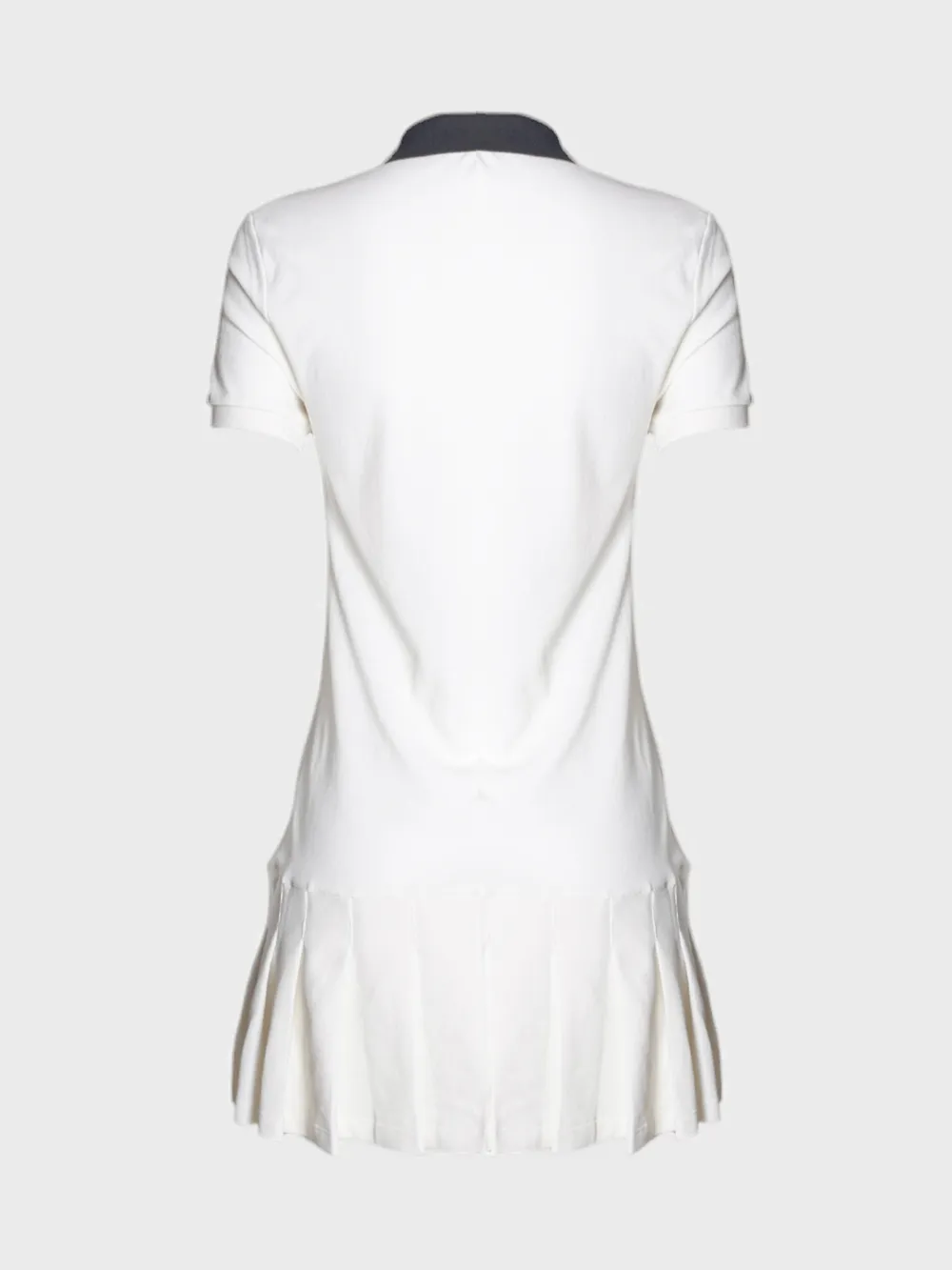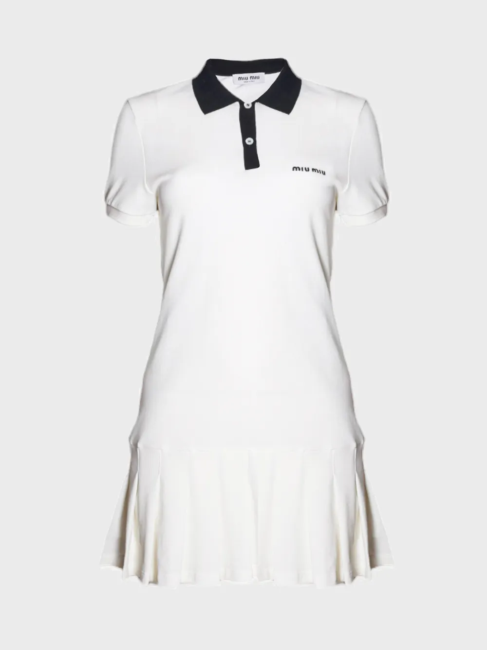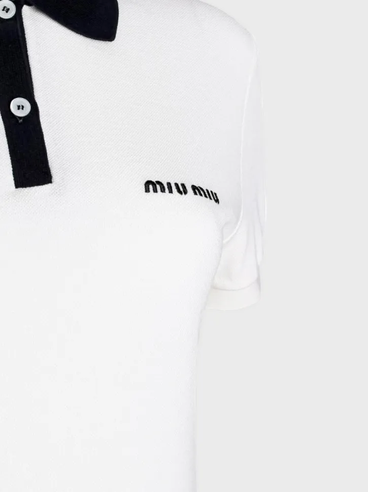 Платье Miu Miu выполнено из белой ткани с контрастным черным воротником-стойкой. Модель имеет короткие рукава и застежку на пуговицы спереди, придающую классический поло-стиль. Юбка платья оформлена складками, добавляющими объем и элегантность. Дизайн сочетает спортивный и женственный элементы, идеально подходящий для повседневной носки или активного отдыха.