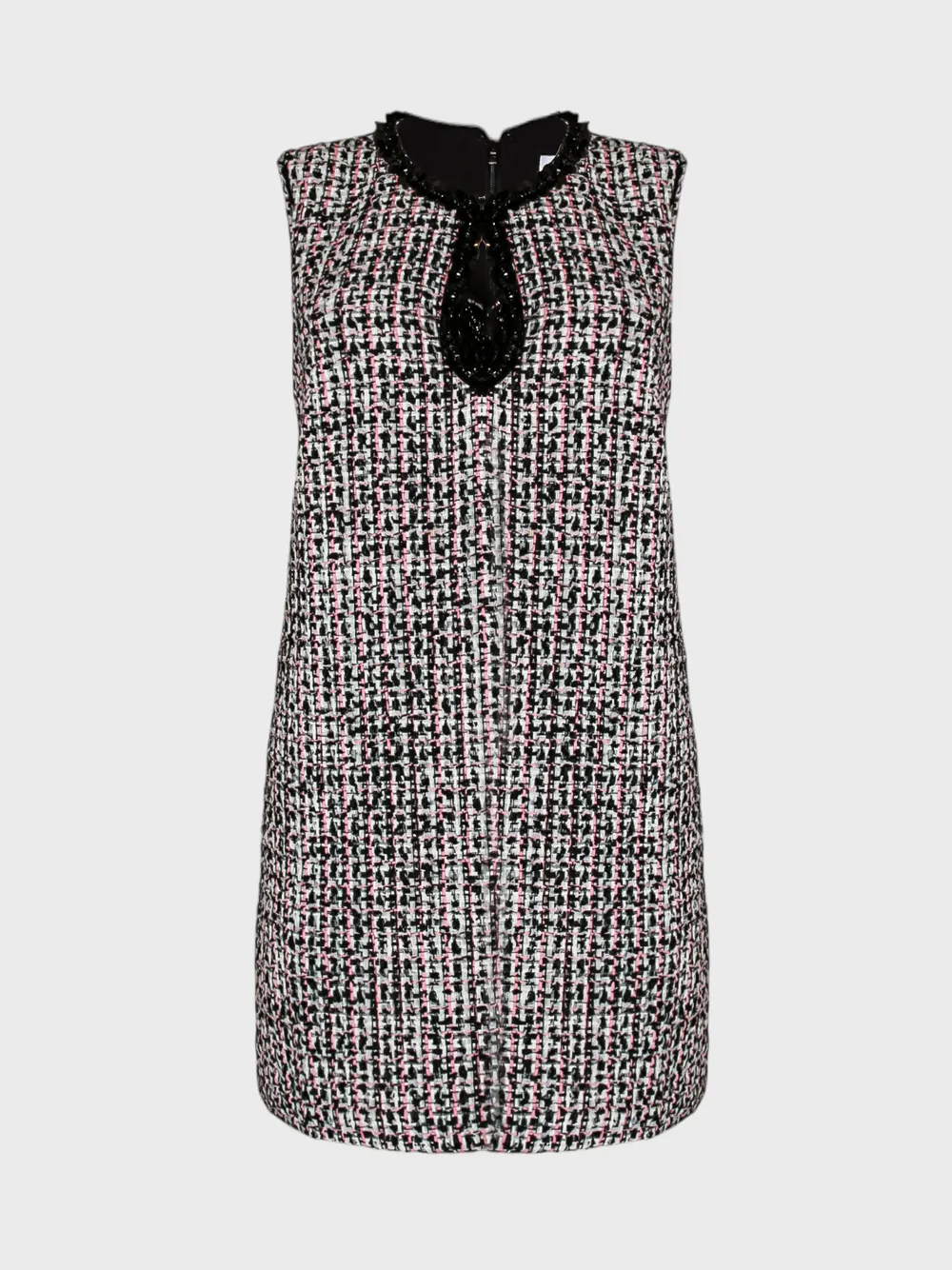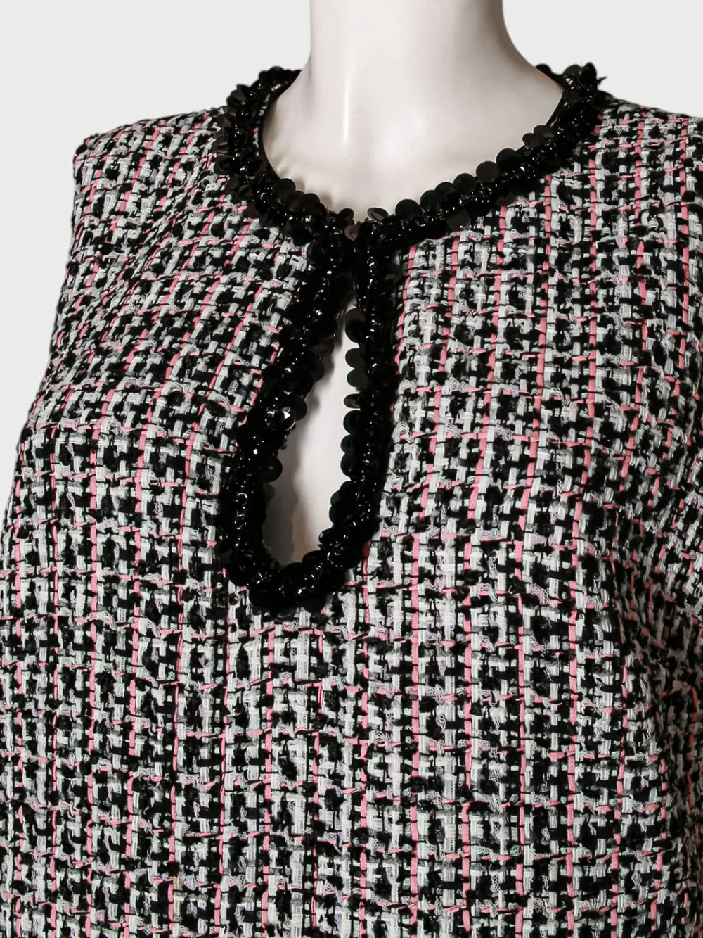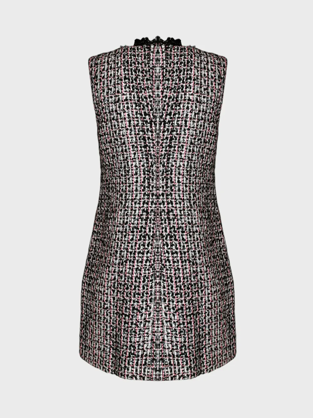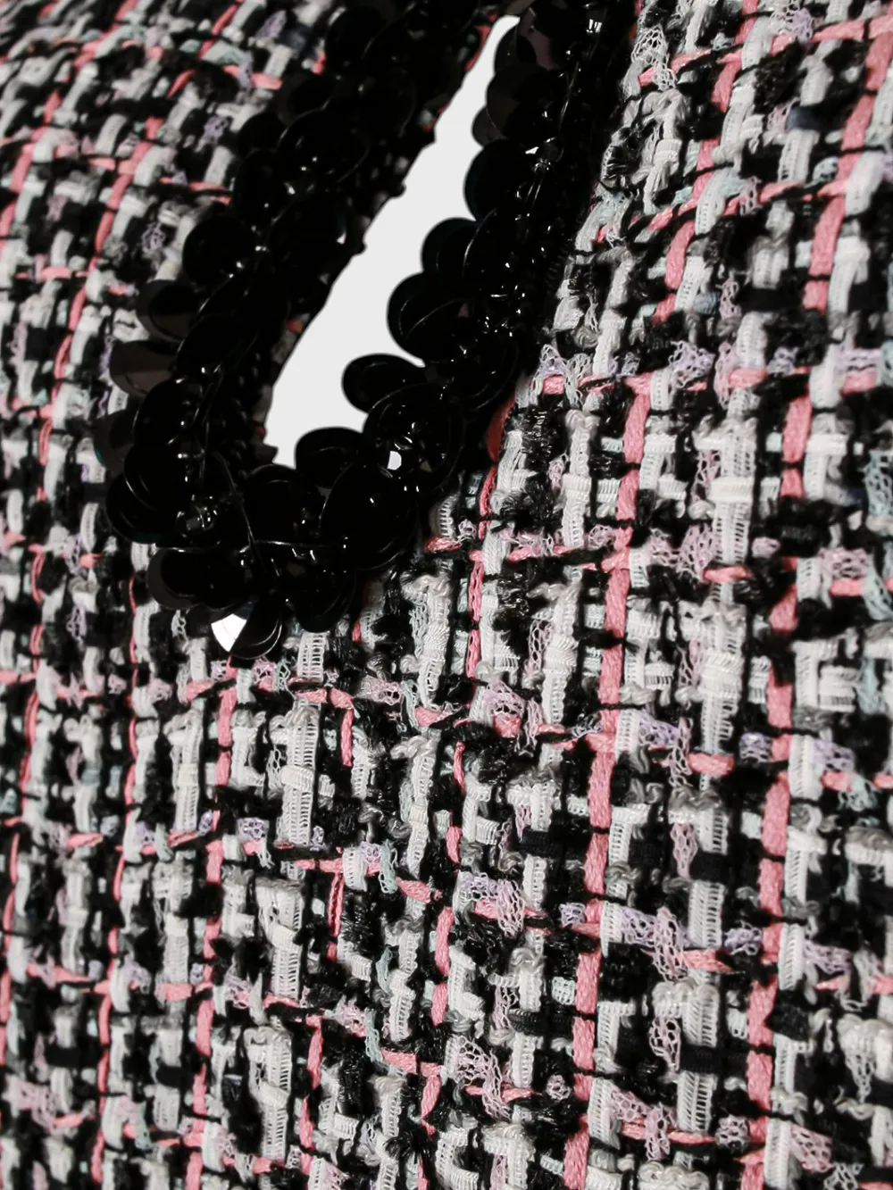Платье Self-Portrait выполнено из высококачественного твида в черно-белую клетку с яркими розовыми акцентами, создавая современный и элегантный образ. Модель без рукавов с V-образным вырезом и завышенной талией идеально подчеркивает фигуру. Особое внимание привлекает декоративная отделка — контрастные черные пайетки по горловине и спинке, добавляющие блеск и изысканность. Ткань отличается фактурным плетением, придающим изделию уютный и дорогой вид. Прямой силуэт и длина до колена делают этот наряд универсальным для вечерних мероприятий или деловых встреч, где требуется сочетание стиля и комфорта.