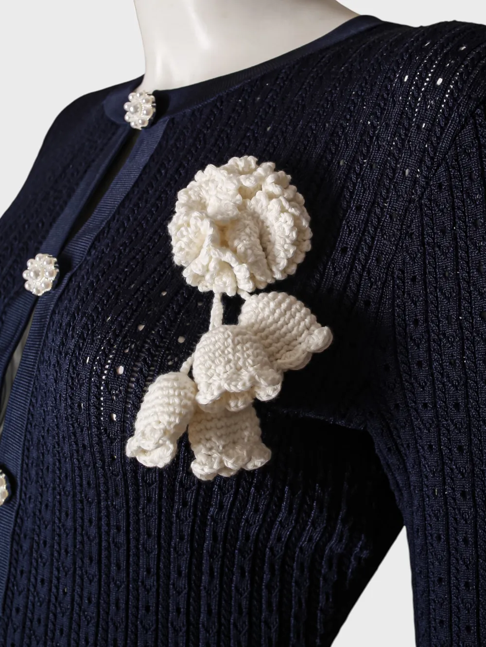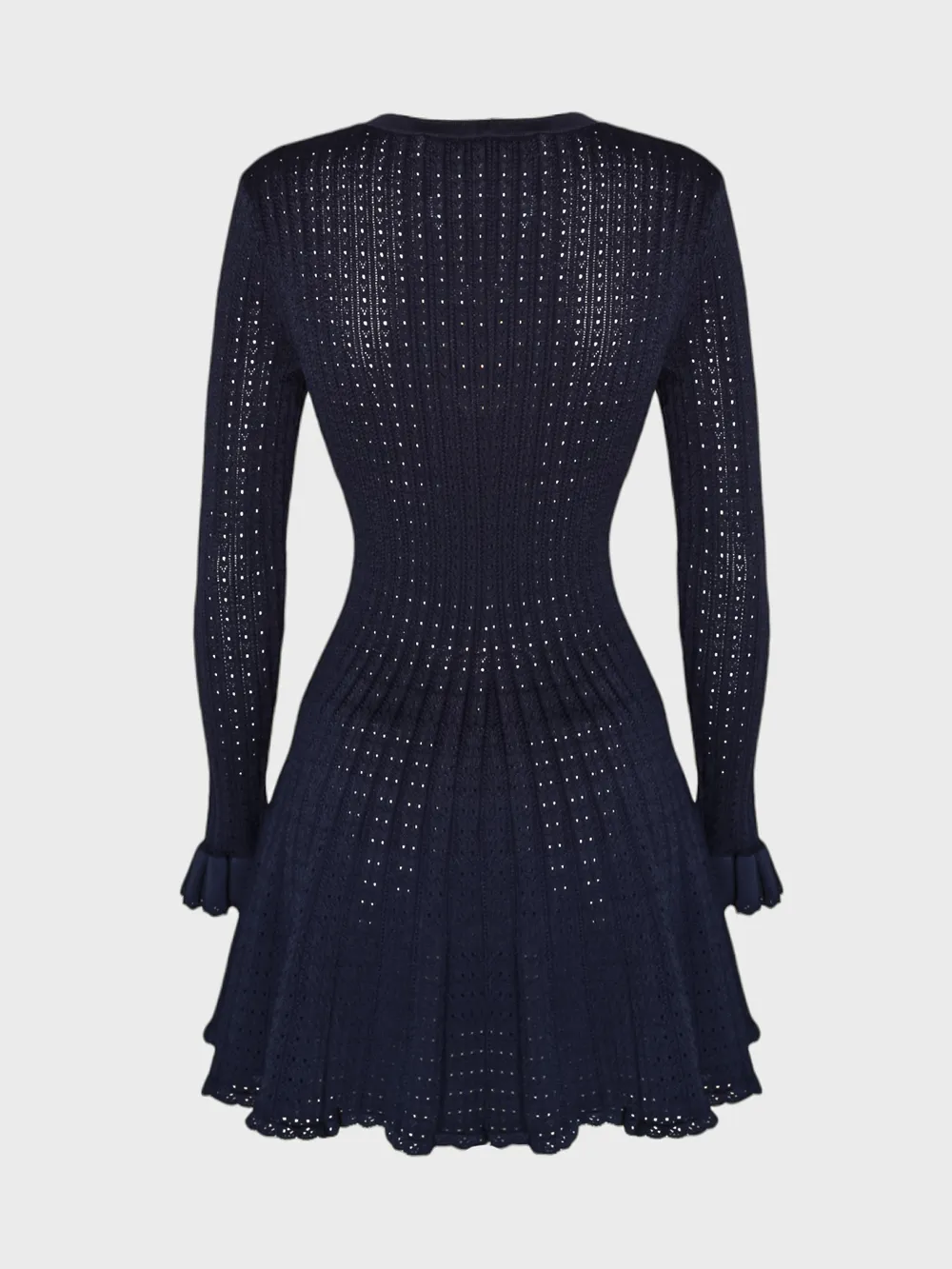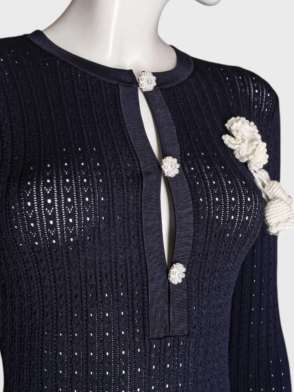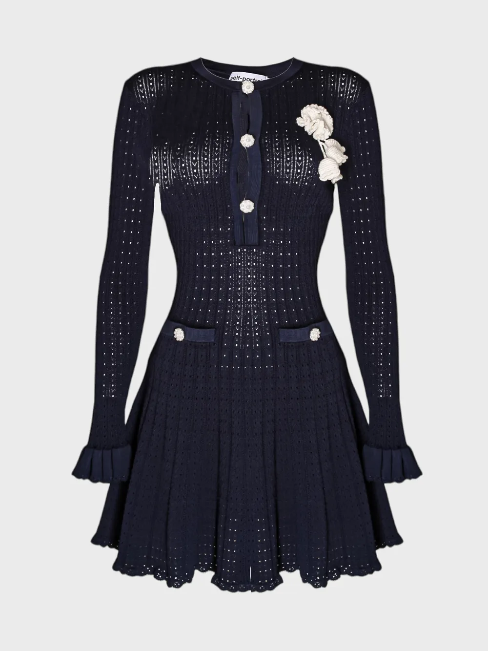 Платье Self-Portrait выполнено из плотного темно-синего трикотажа с фактурной перфорацией, сочетает облегающий силуэт, длинные рукава с воланами и пышную юбку; декорировано объемным крючком цветком и жемчужными пуговицами — элегантный и роскошный образ в стиле современной романтики.