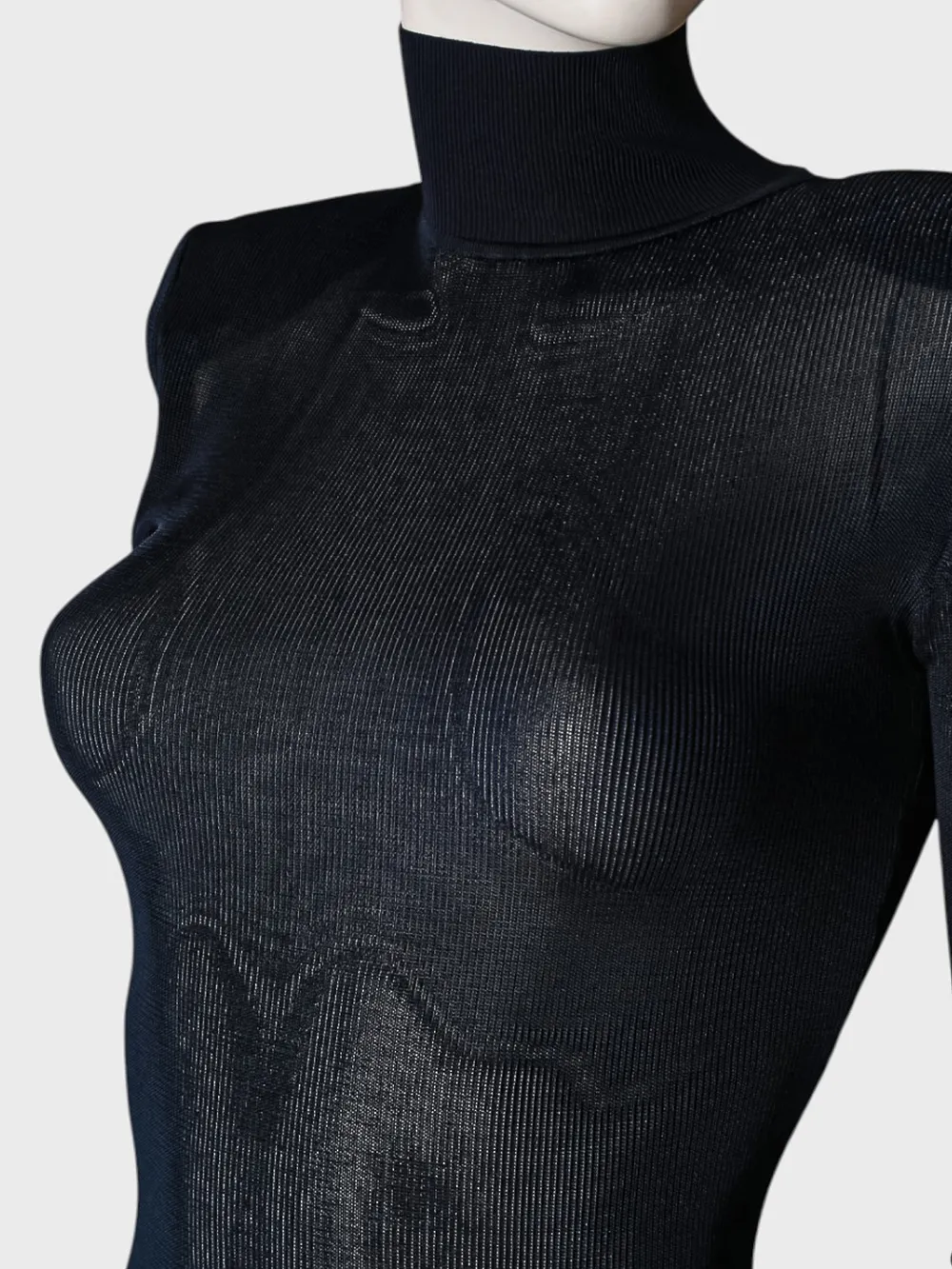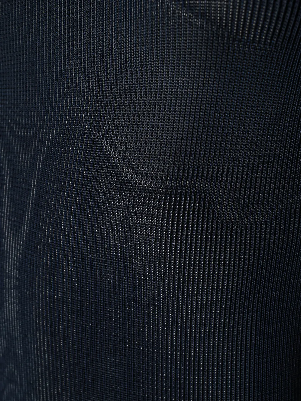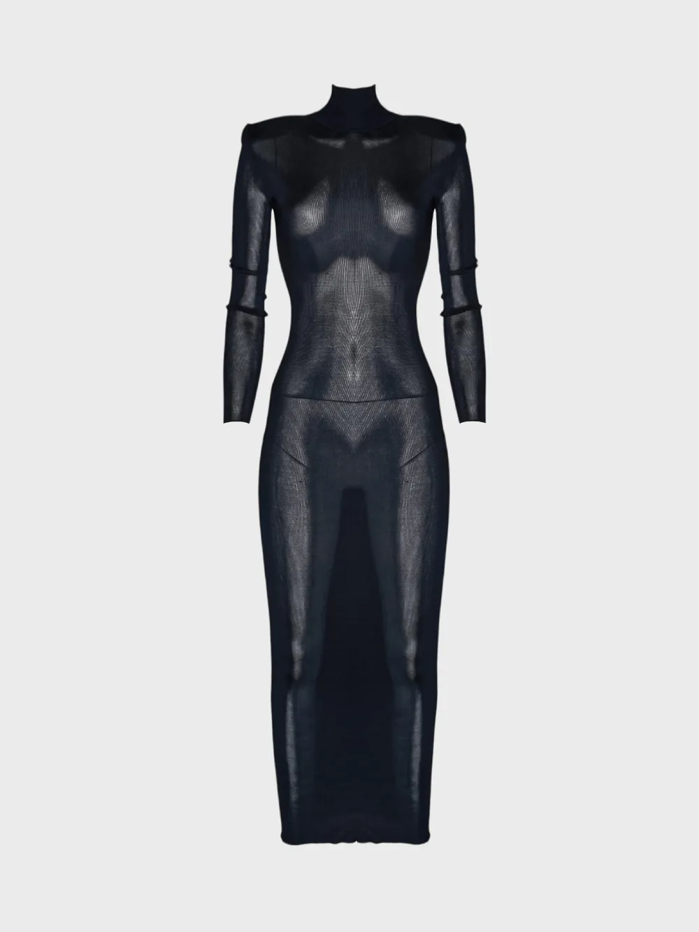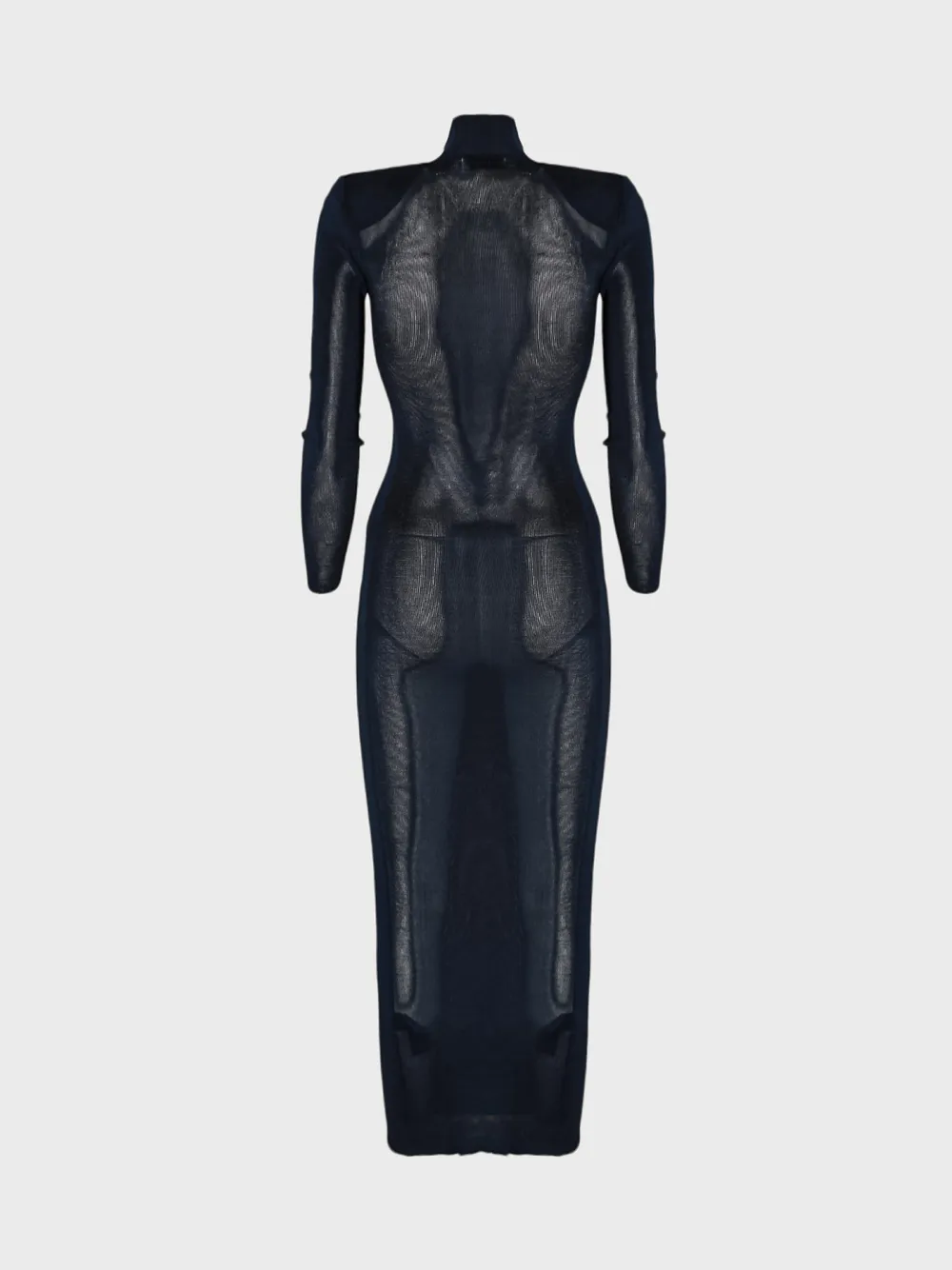 Платье Self-Portrait выполнено из темно-синей фактурной ткани с прозрачным эффектом, создавая современный и элегантный образ. Модель прямого кроя с длинными рукавами и высоким воротником подчеркивает стройность фигуры благодаря облегающему силуэту. Особое внимание привлекают детали — резиновые манжеты на запястьях и текстурная отделка, добавляющие изысканности и контрастности. Ткань отличается плотностью и структурой, придавая изделию уютный и дорогой вид. Простой силуэт и длина до колена делают этот наряд универсальным для вечерних мероприятий или особых случаев, где требуется сочетание стиля и комфорта.