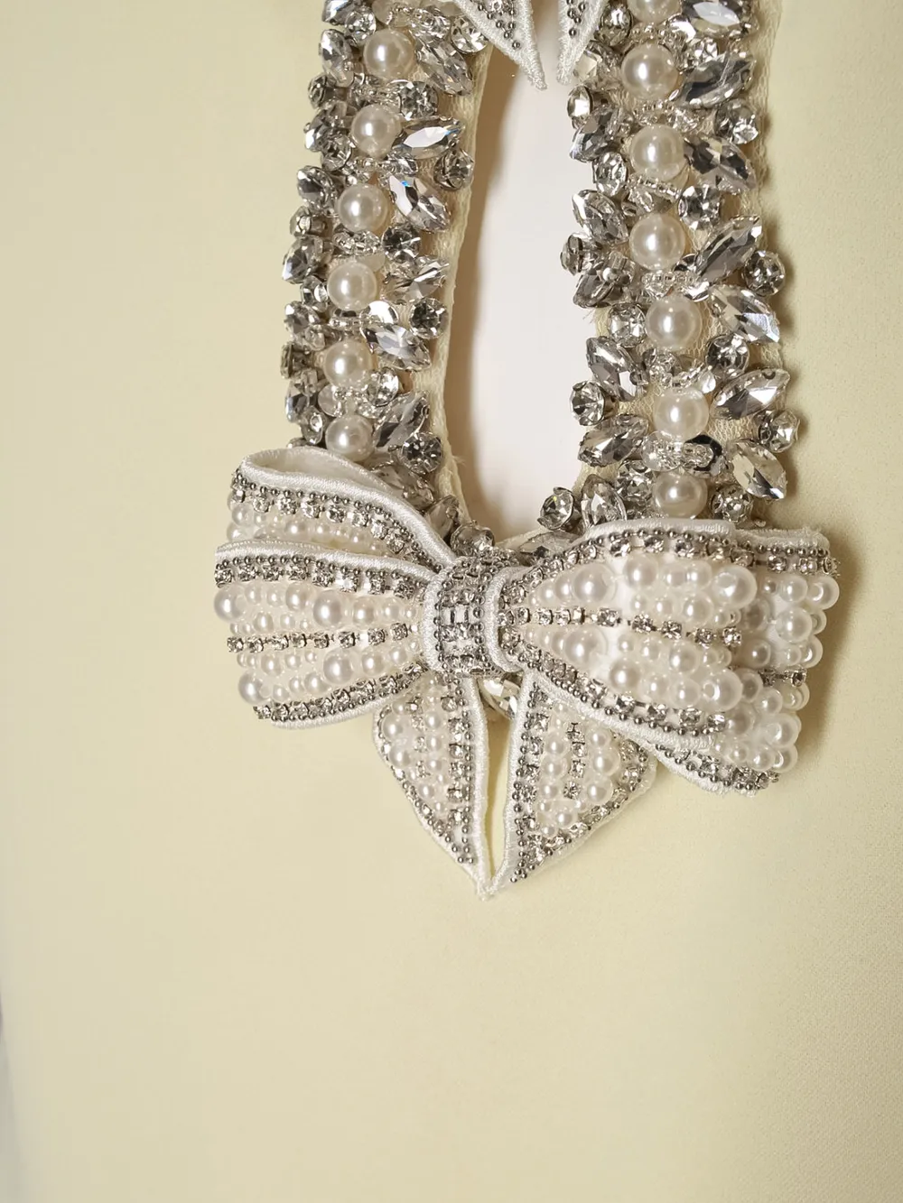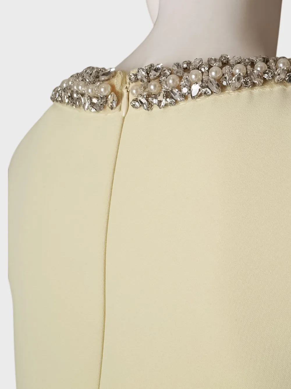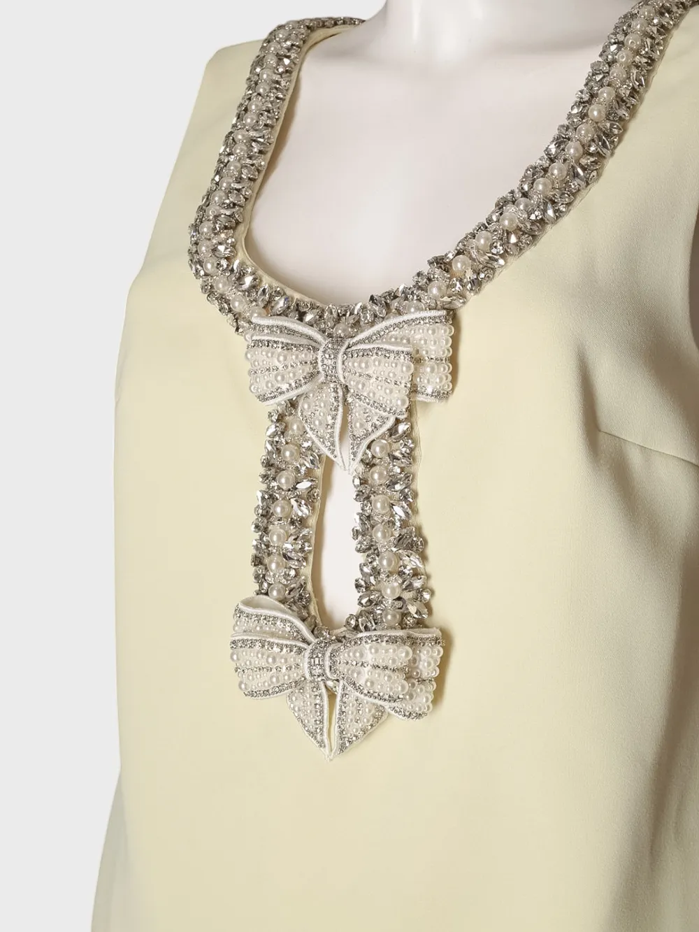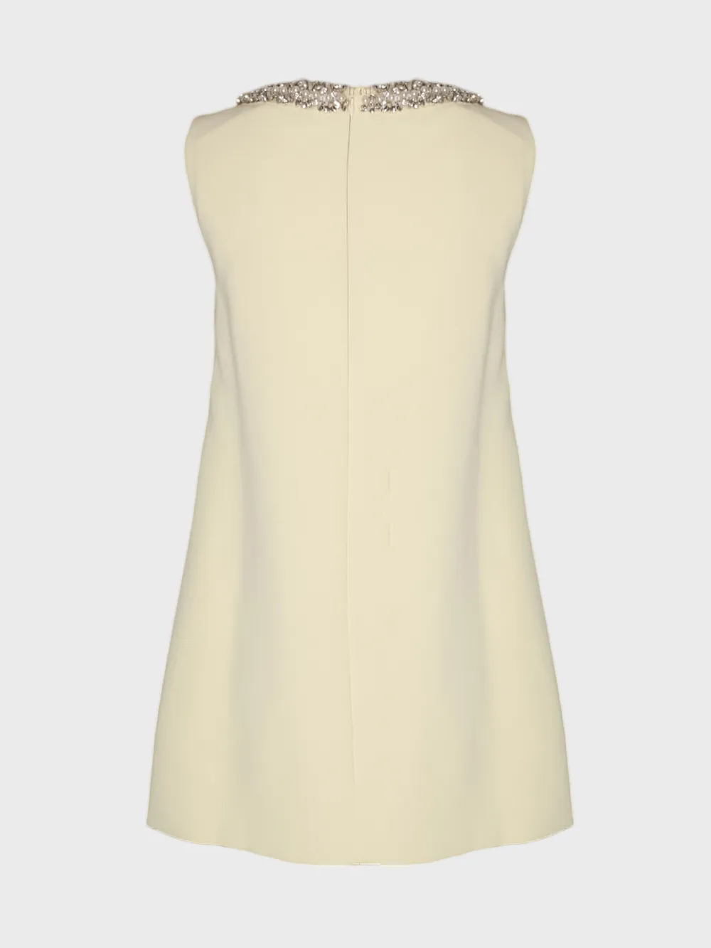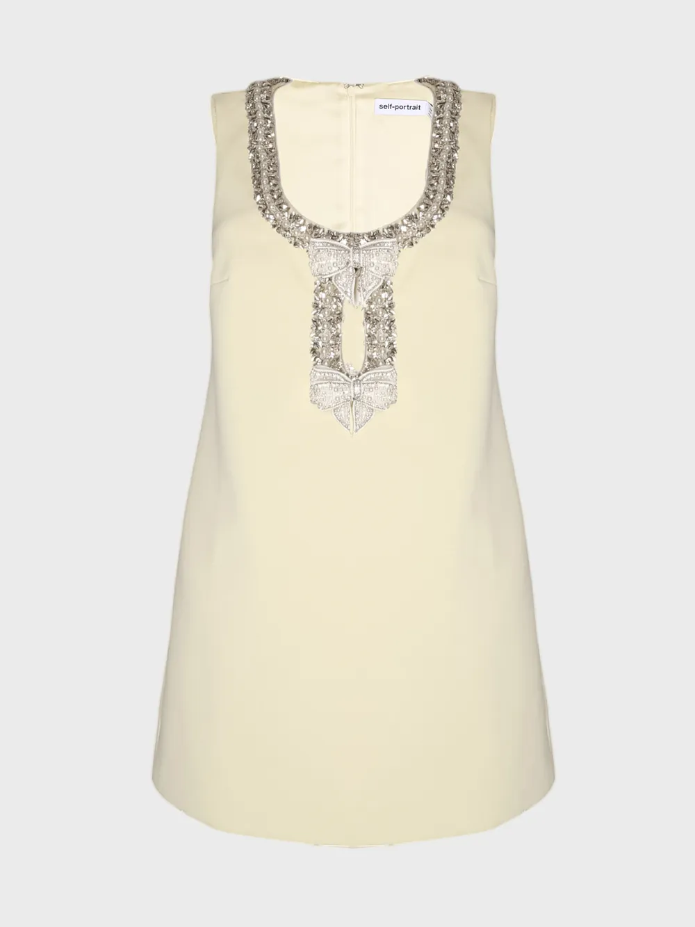 Платье Self-Portrait выполнено из качественного светло-желтого материала с безрукавным кроем и приталенным силуэтом. Модель дополнена декоративными элементами в виде вышивки на горловине, которая создает элегантный акцент. Простой дизайн и комфортная посадка делают платье идеальным выбором для повседневной носки или как базовый элемент в гардеробе.