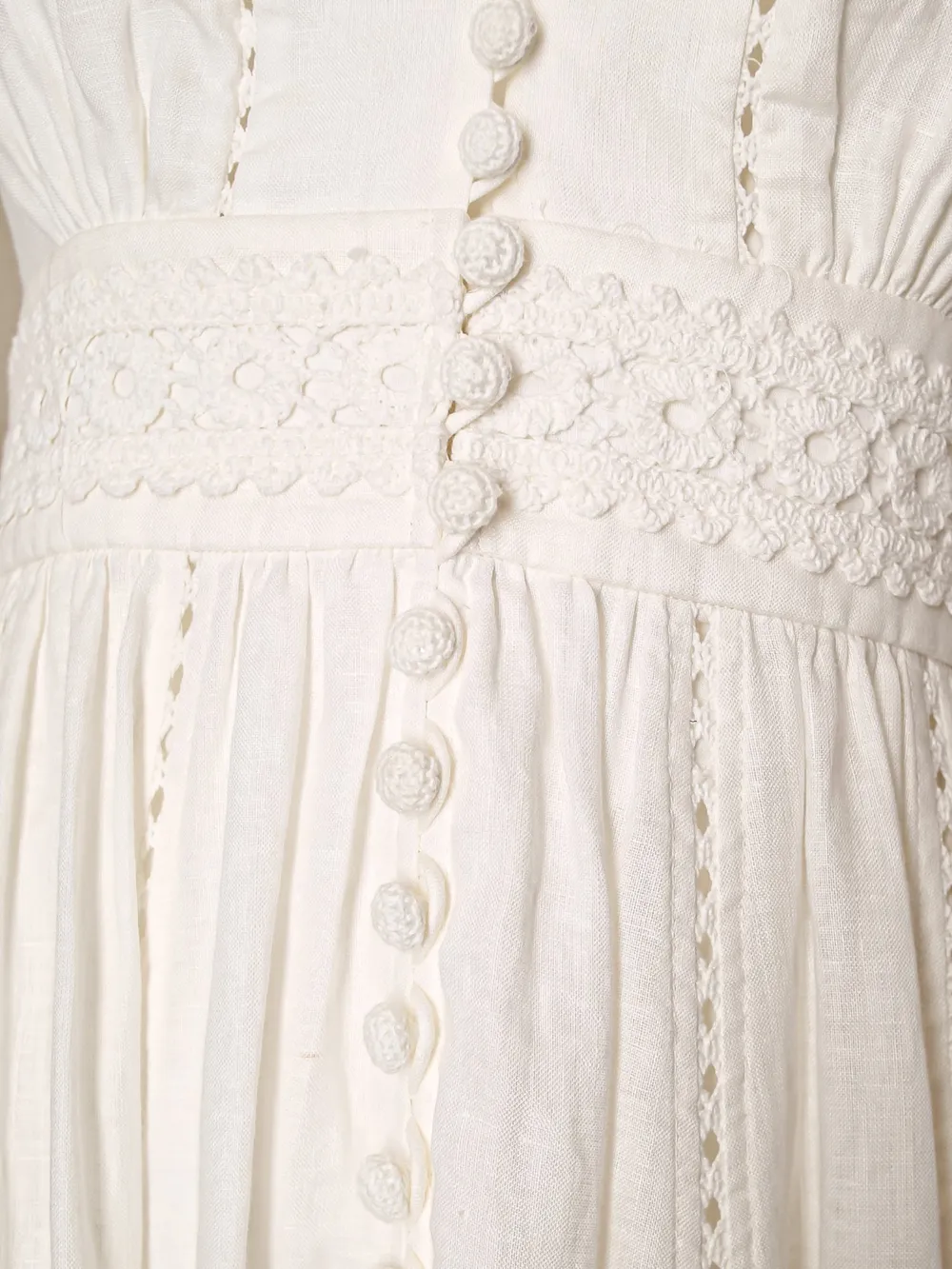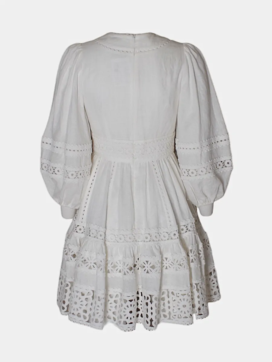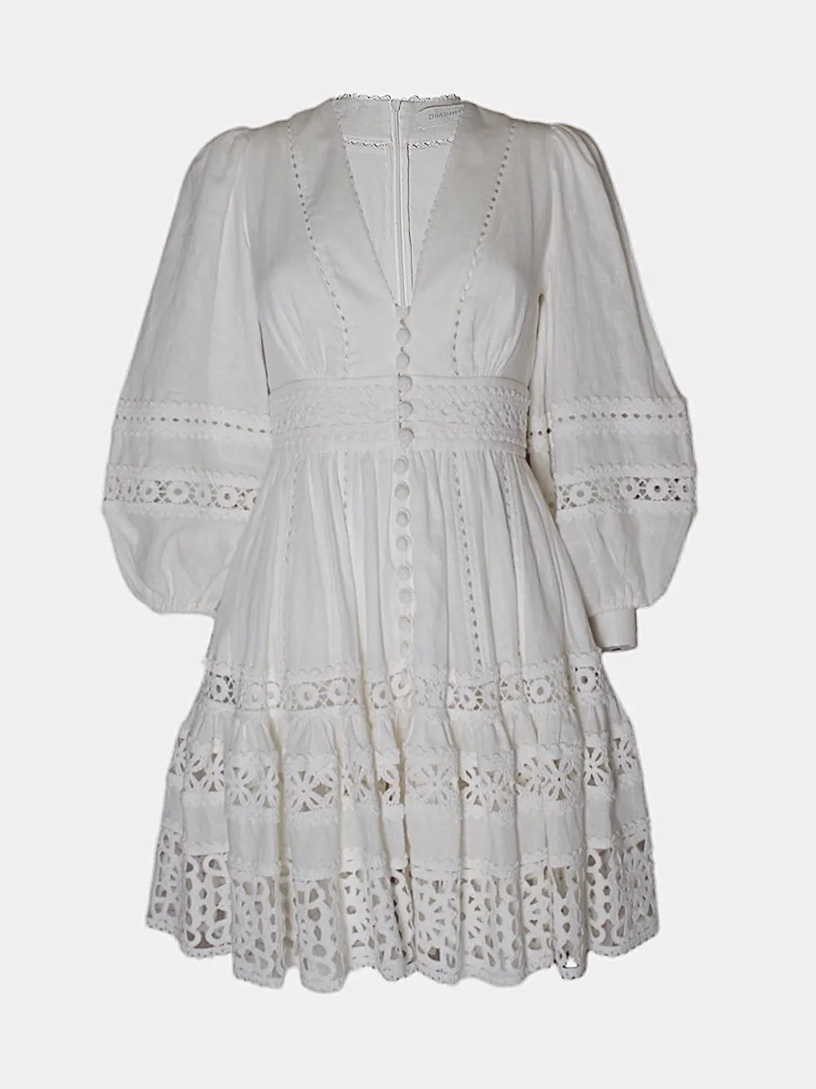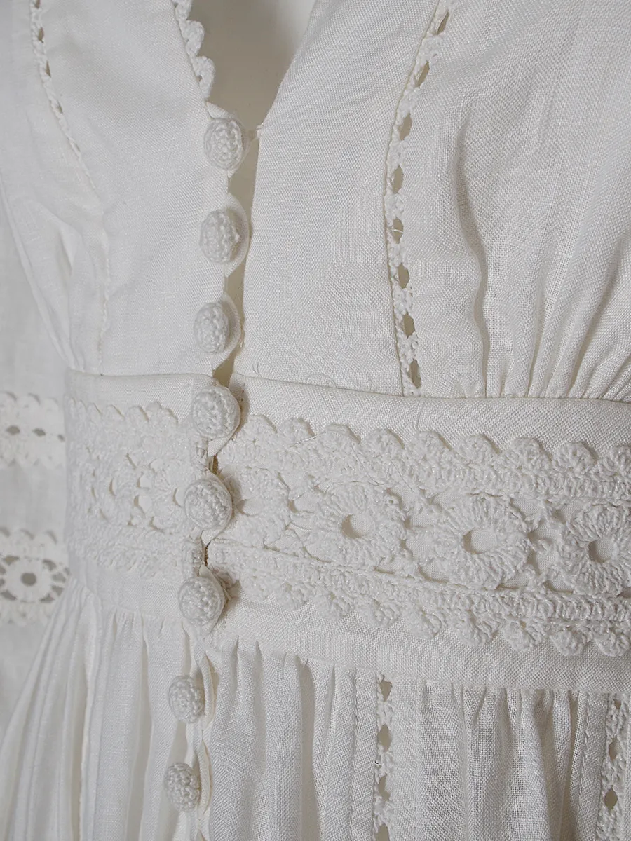 Платье Zimmermann выполнено из натуральной белой ткани с ручной вышивкой в технике «вырезная кружевная работа» — сочетание романтики и этнической эстетики. Модель с глубоким V-образным вырезом, пышными рукавами и поясом на талии подчеркивает женственность. Детали: декоративные пуговицы, драпировка и многоярусная юбка с узорами придают изделию воздушность и изысканность. Идеальный выбор для летних мероприятий, где важна уникальность и качество исполнения.