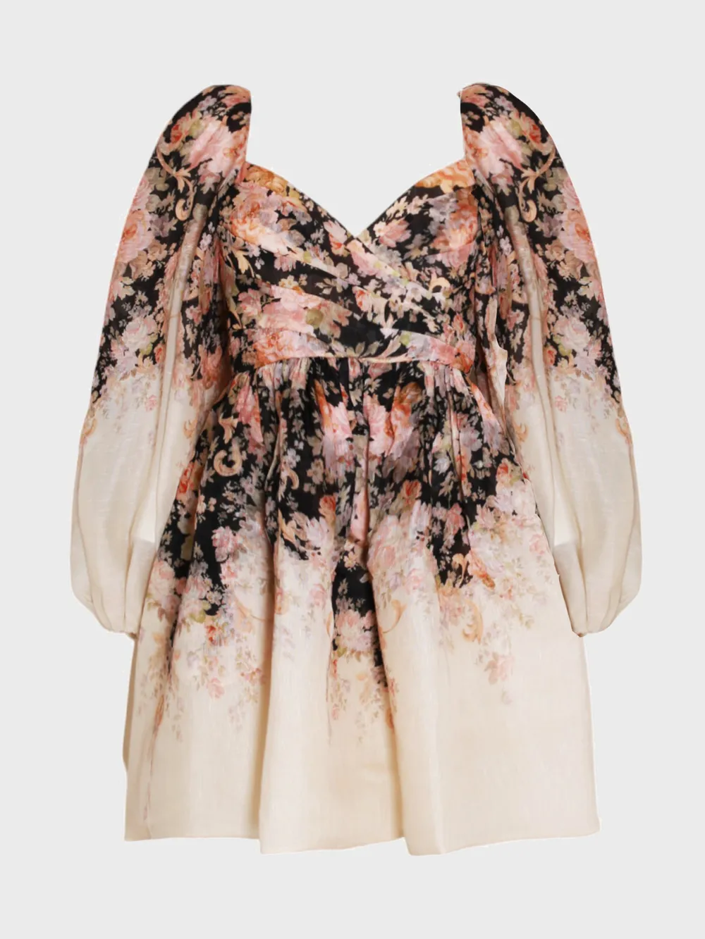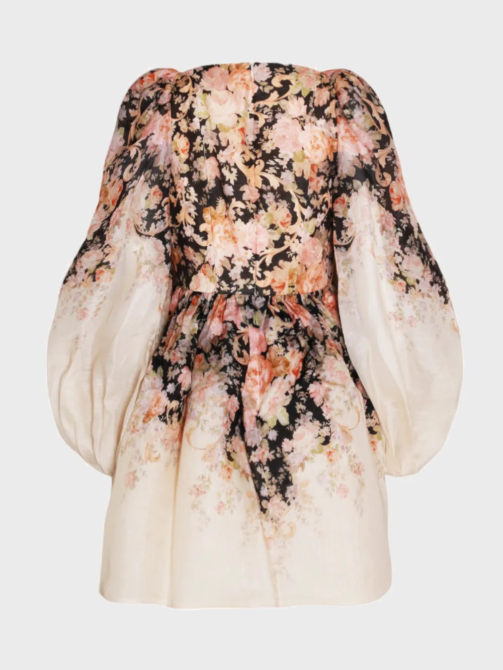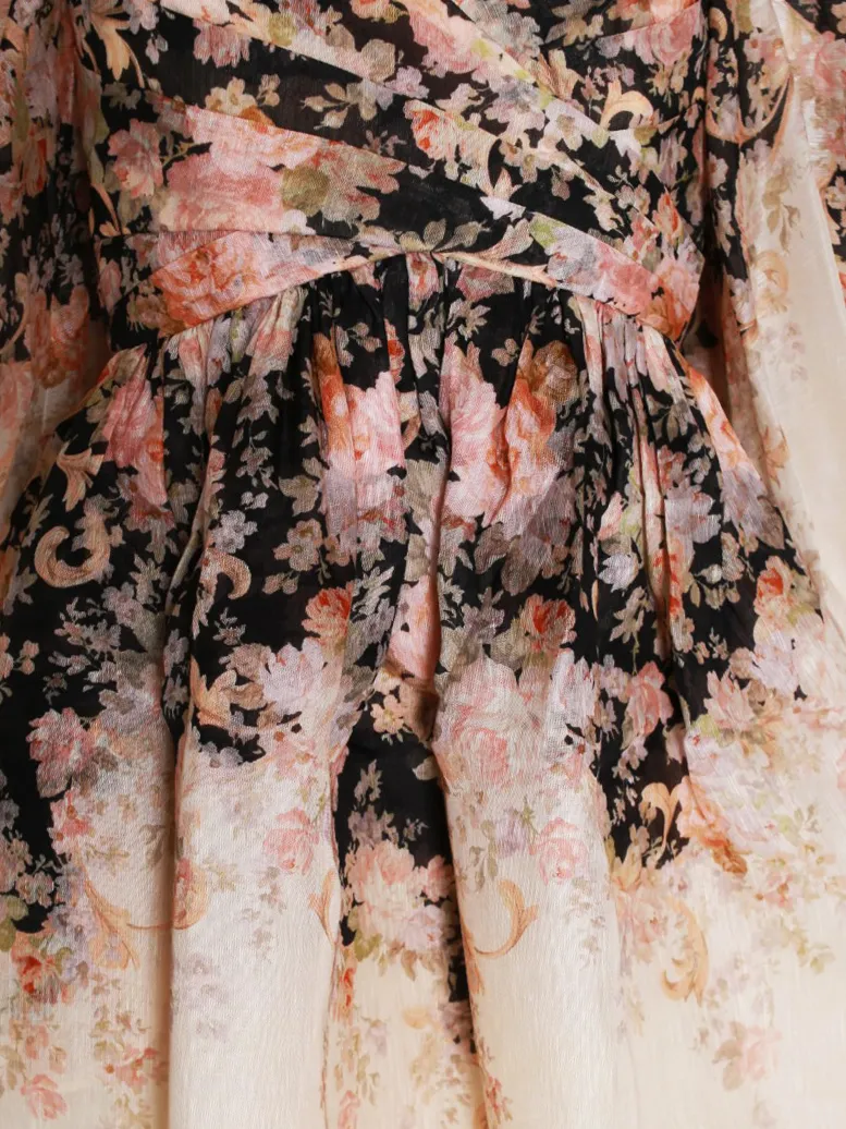 Платье Zimmermann выполнено из лёгкой шелковистой ткани с роскошным градиентным цветочным принтом, переходящим от насыщенных тонов к нежному крему; модель с широкими пышными рукавами и асимметричным вырезом подчёркивает женственность и изысканность, идеально подходя для торжественных и романтических образов.