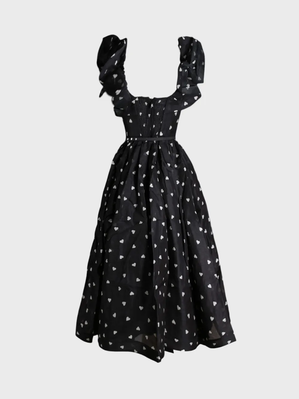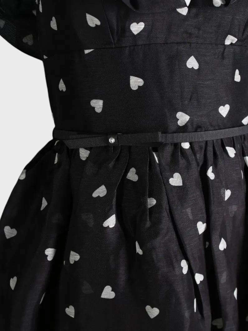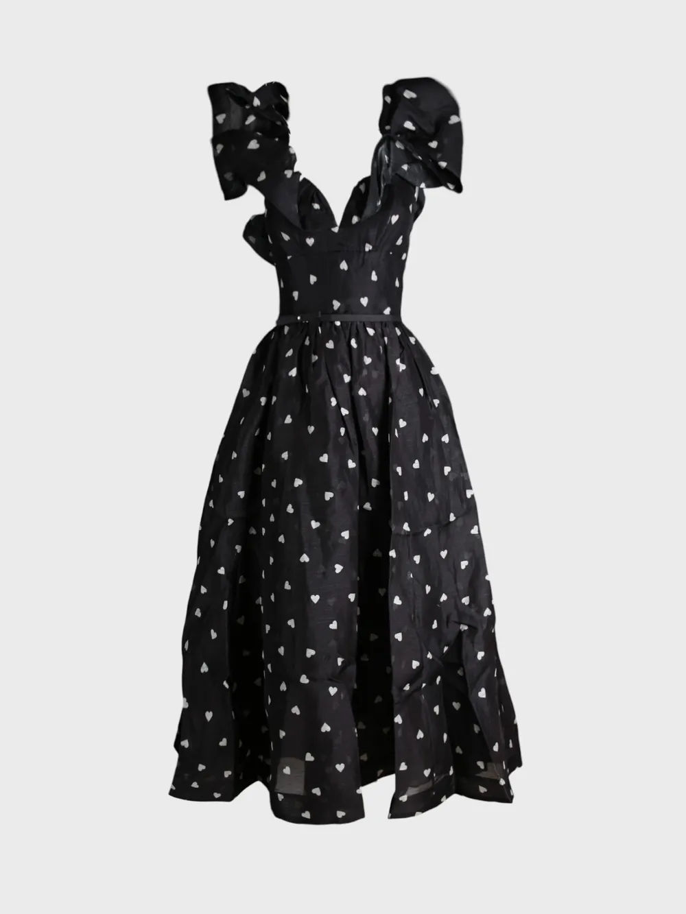 Платье Zimmermann выполнено из черной ткани с белым принтом в виде сердечек. Модель имеет безрукавный крой с объемными рукавами-фонариками, завязанными на плечах. Платье дополнено поясом из темного атласа, который акцентирует талию. Юбка пышная и расклешенная, создавая романтический и элегантный образ. Идеально подходит для вечерних мероприятий или особого случая.