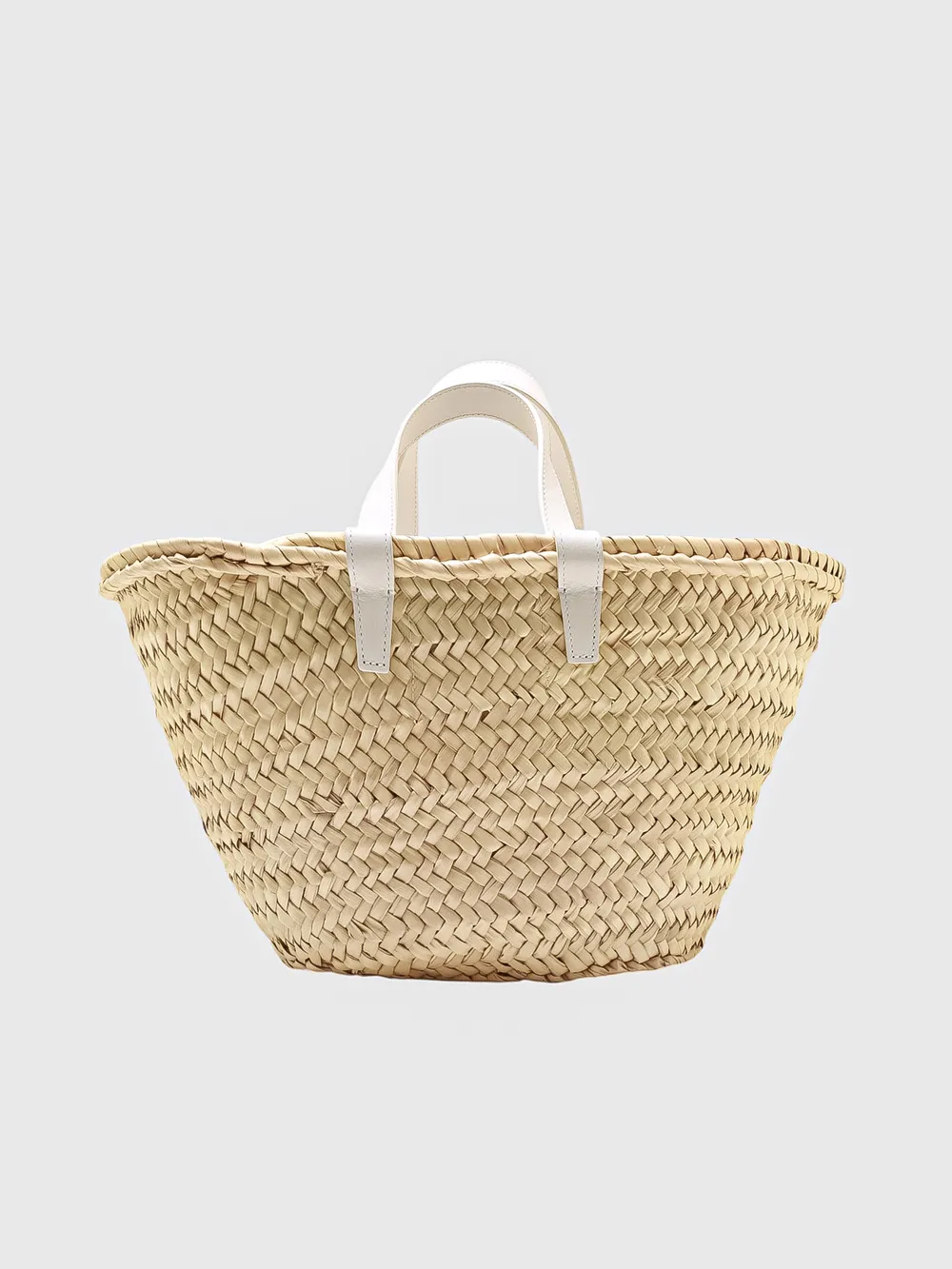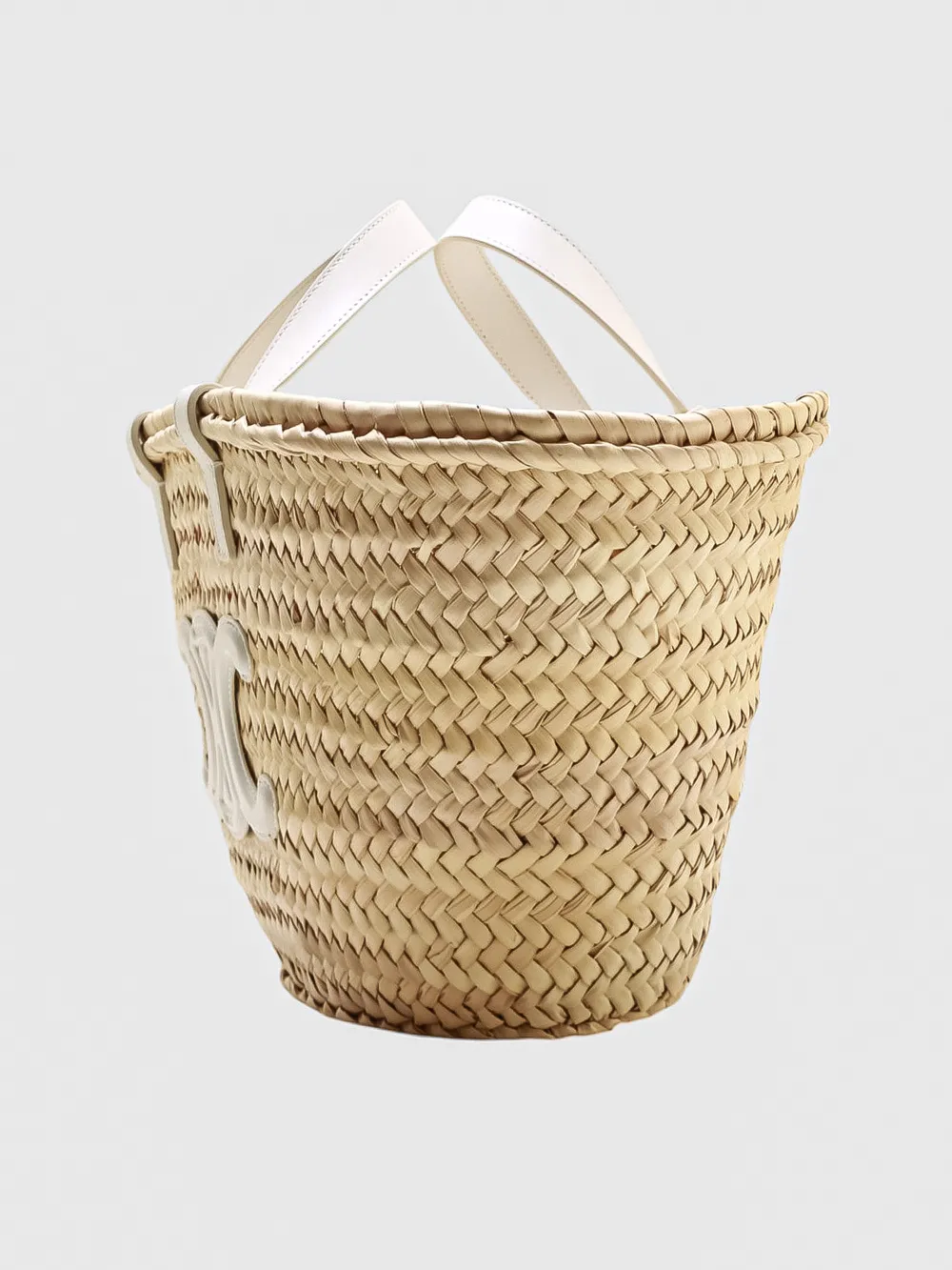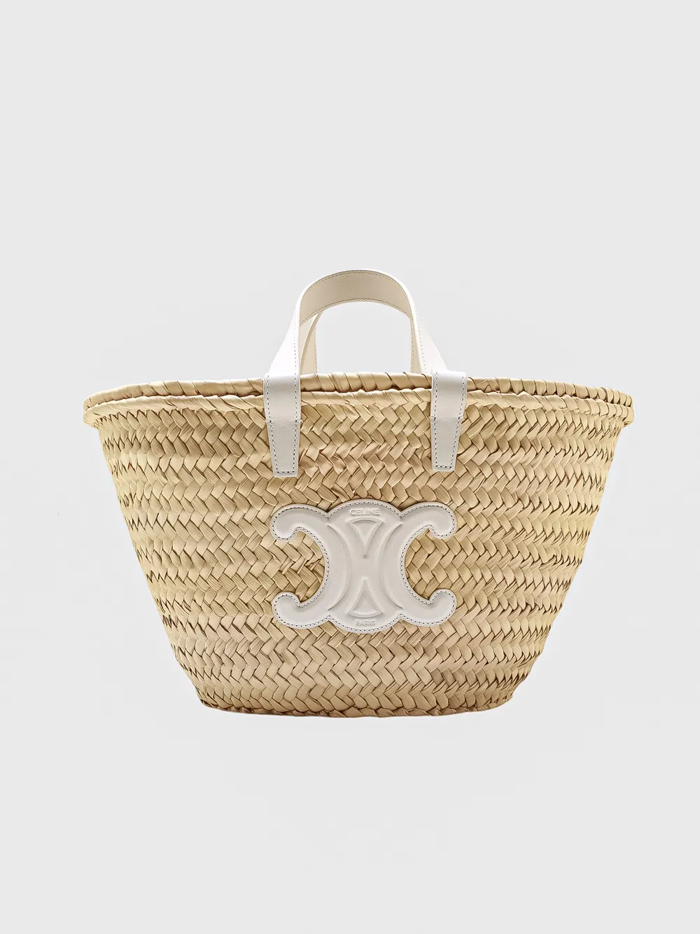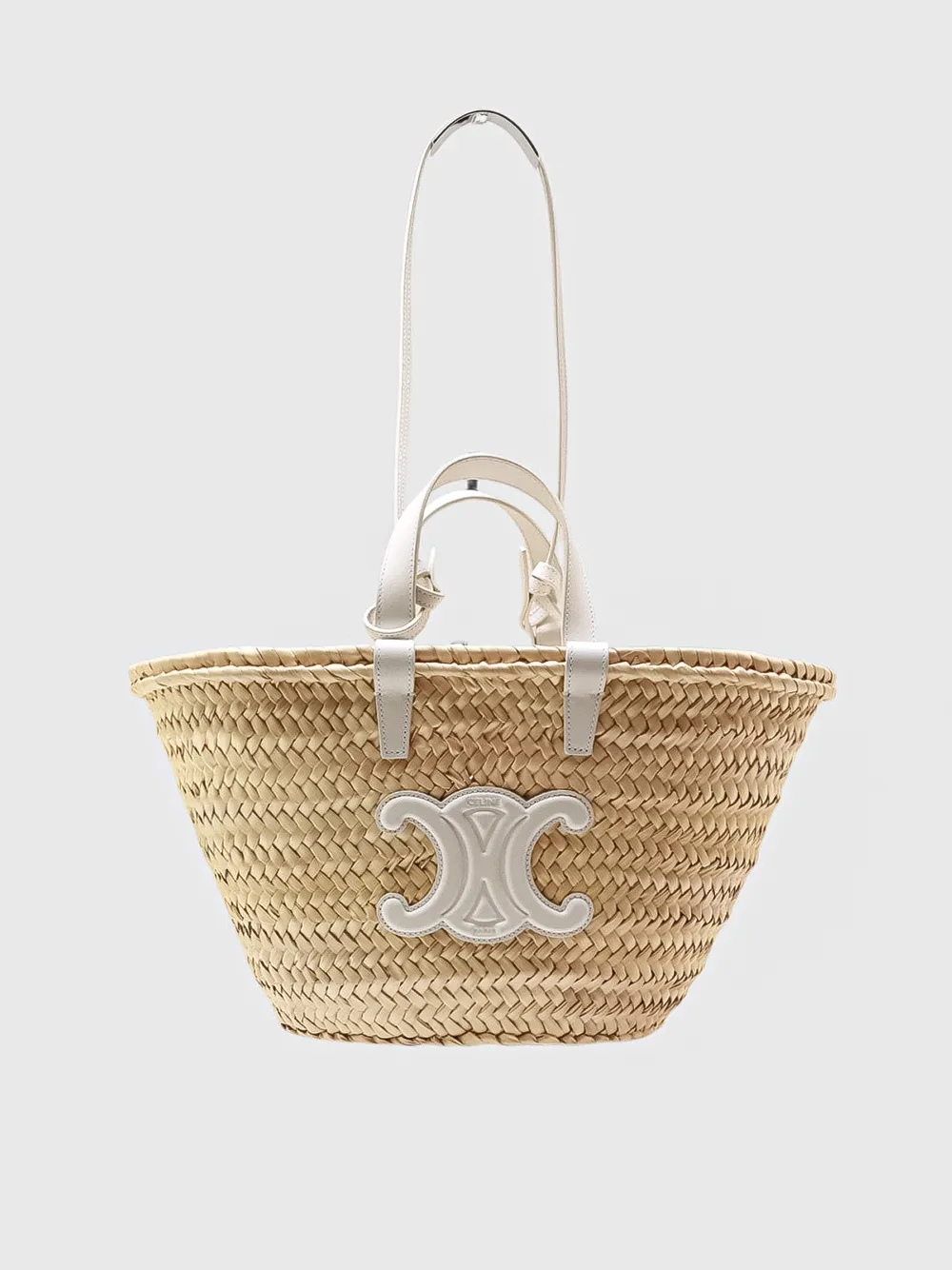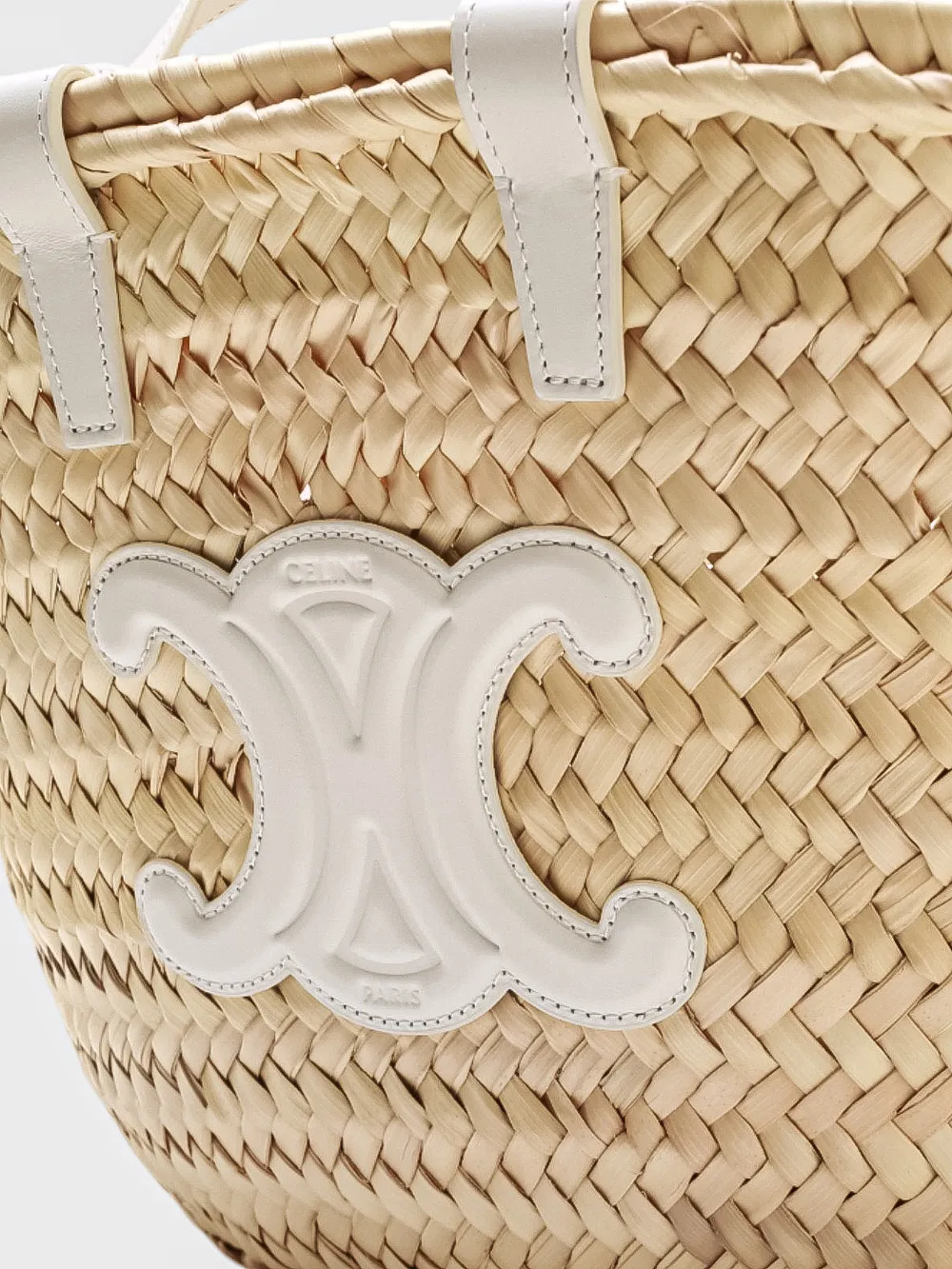 Сумка Celine выполнена из натурального плетеного ротанга с матовым эффектом, дополненного белыми кожаными вставками по краям. Модель классического прямоугольного кроя декорирована крупным логотипом бренда "CELINE PARIS" на передней панели. Стильный дизайн и качественные материалы делают эту сумку универсальным аксессуаром для повседневных образов и шопинга.