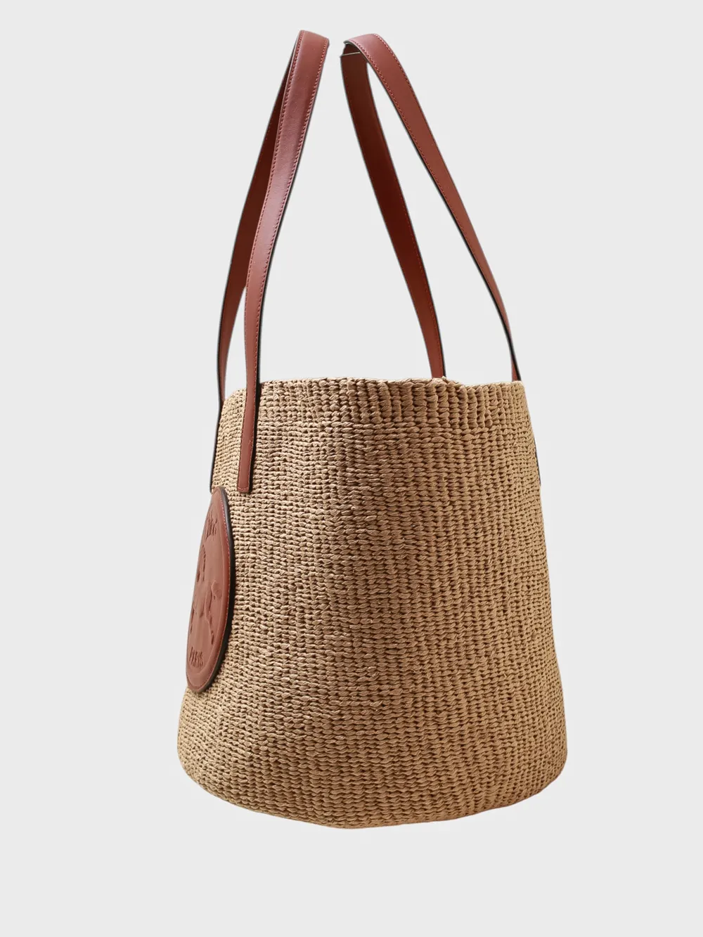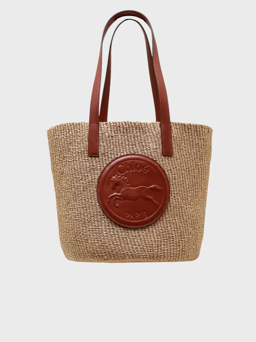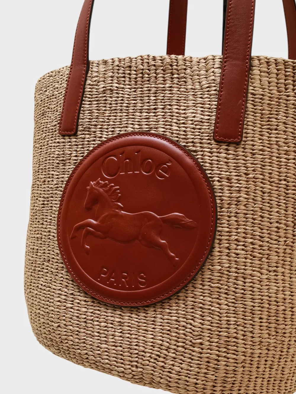 Сумка Chloe выполнена из натурального плетеного ротанга в нежно-бежевом цвете с контрастными коричневыми элементами. Модель дополнена длинными кожаными ручками и декоративной металлической пластиной с логотипом бренда, украшенной элегантным изображением лошади. Легкая и вместительная — идеальный аксессуар для летнего сезона и повседневного использования.