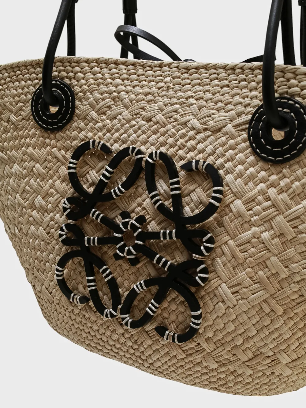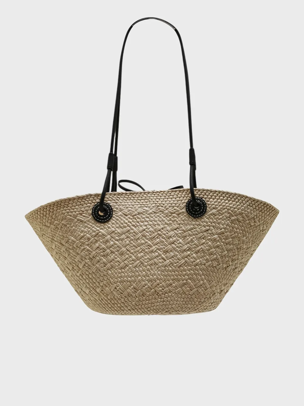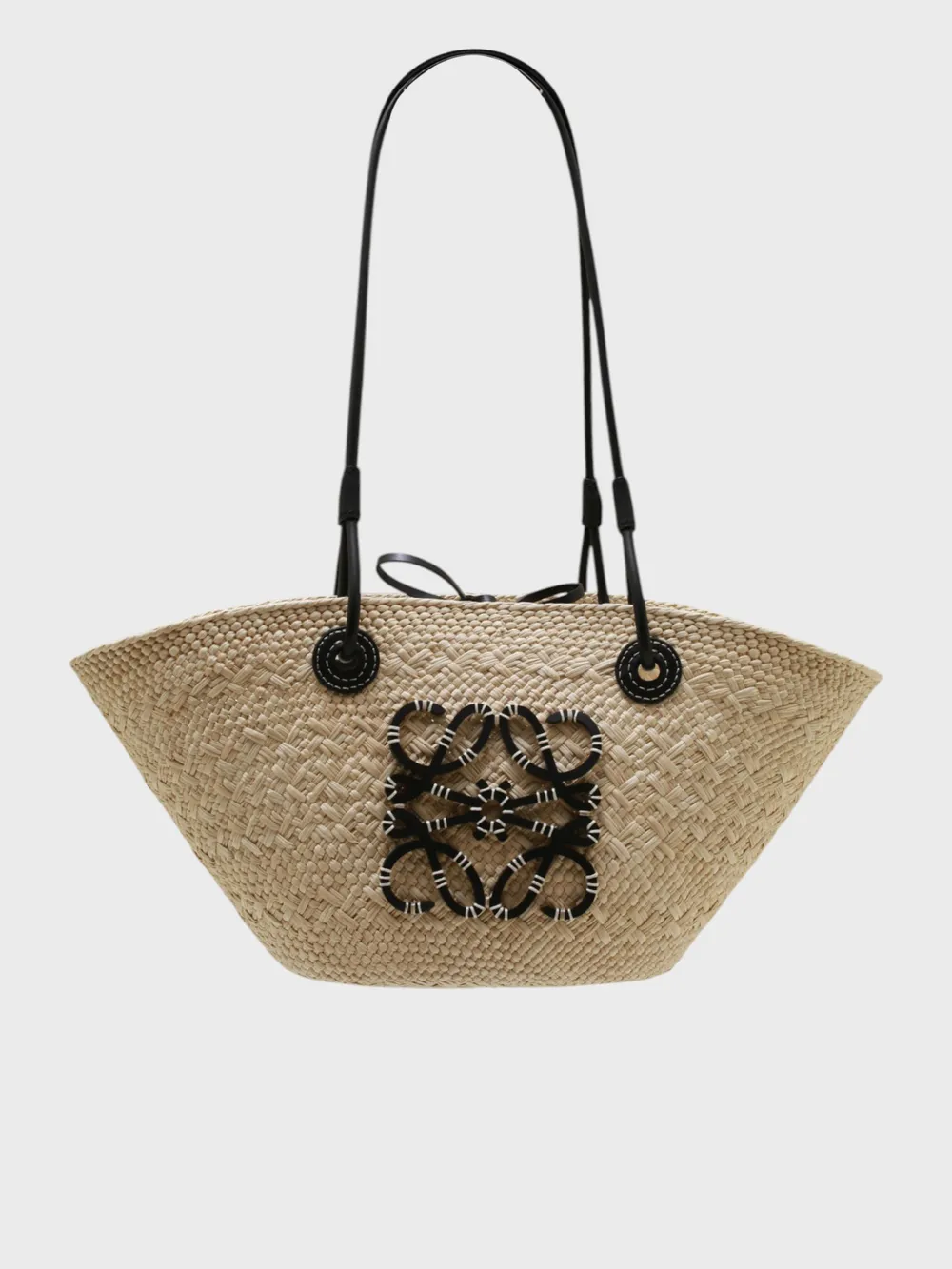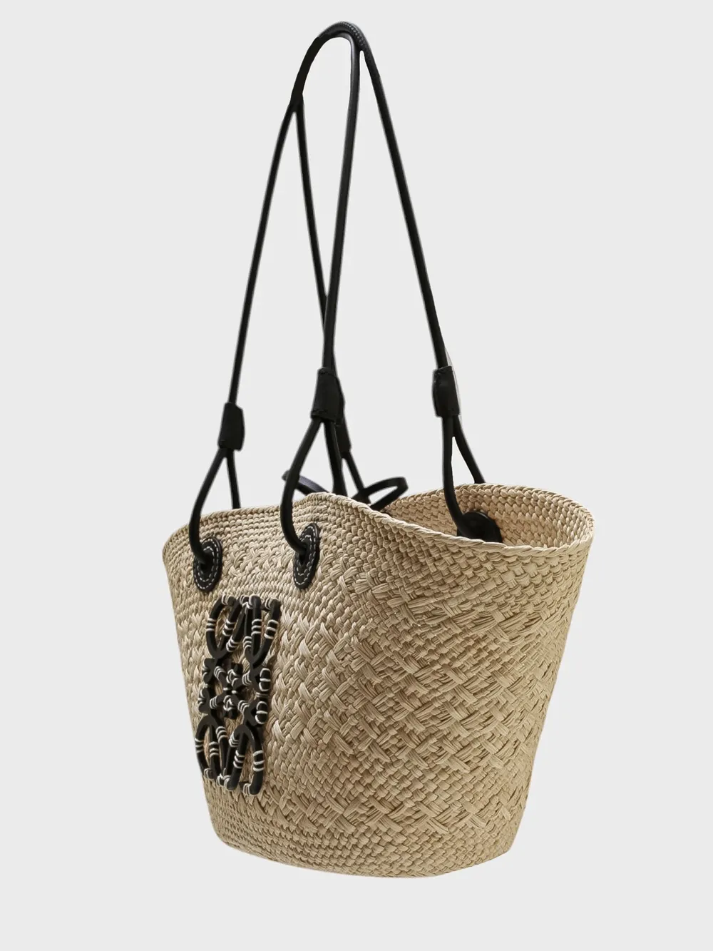 Сумка выполнена из натурального ротанга с плотной плетеной текстурой, обеспечивающей прочность и долговечность. Дизайн лаконичный, акцентирован брендовым логотипом "LOEWE" в черном цвете на передней части. Модель оснащена двумя длинными плечевыми ремнями для удобной носки как на плече, так и через плечо. Вместительная конструкция идеально подходит для повседневного использования, прогулок или походов на пляж. Материал придает сумке экологичность и стильный вид, сохраняющий актуальность в любое время года.