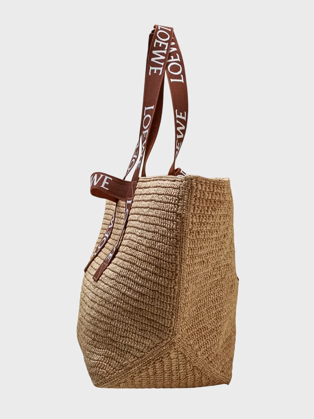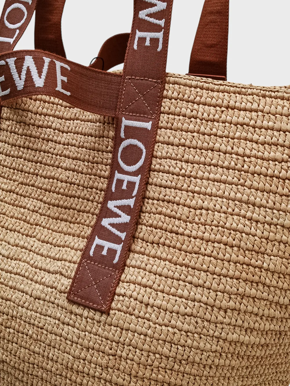 Сумка Loewe выполнена из натурального плетеного ротанга в нейтральном оттенке, с акцентом на текстуру и качество материалов. Модель оформлена длинными ручками, которые декорированы логотипом бренда "LOEWE" белым шрифтом на коричневой основе. Прочный плетеный материал обеспечивает долговечность, а удобные ручки позволяют носить сумку как через плечо, так и на руке. Универсальный дизайн идеально подходит для повседневного использования или отдыха.