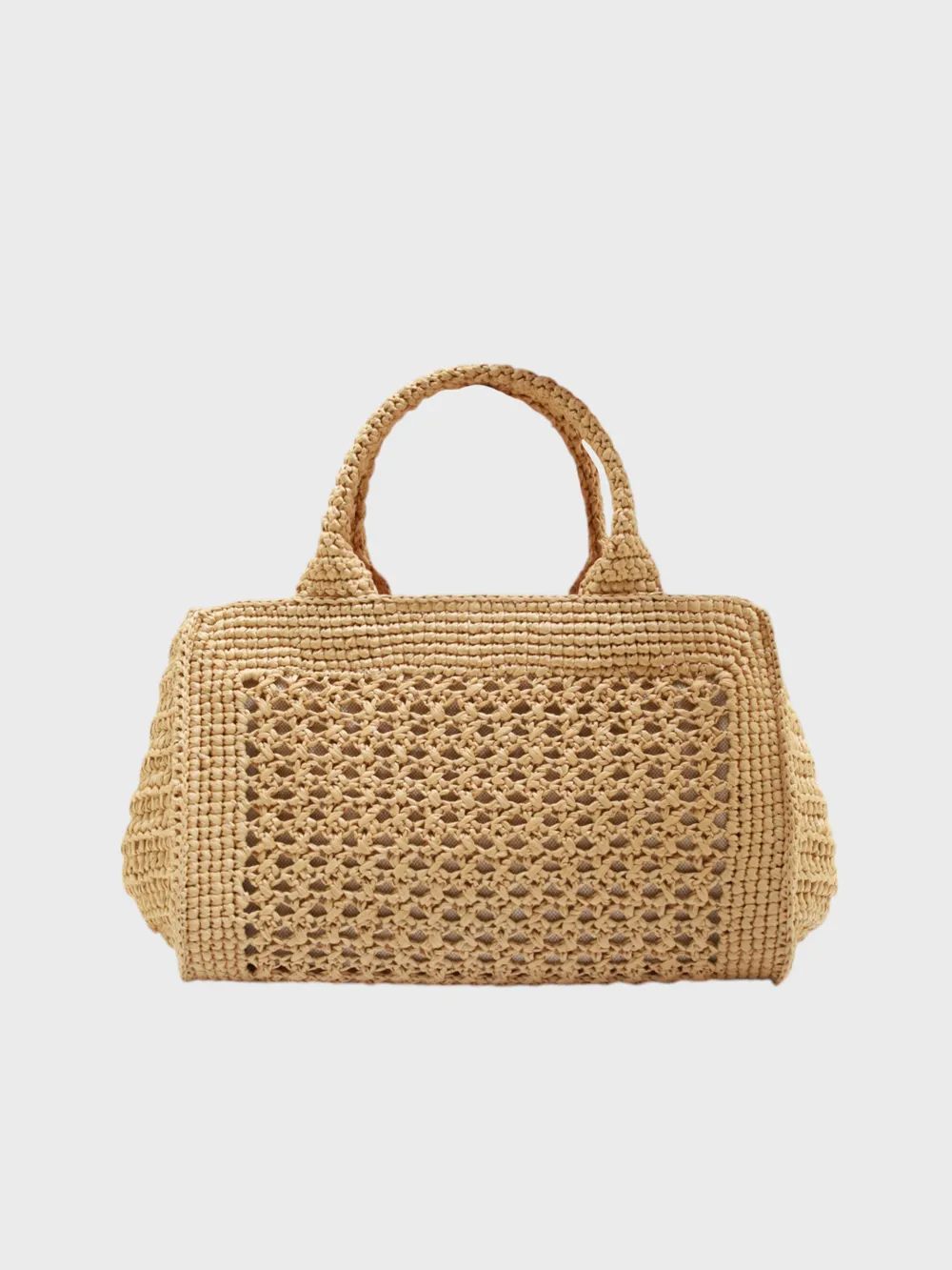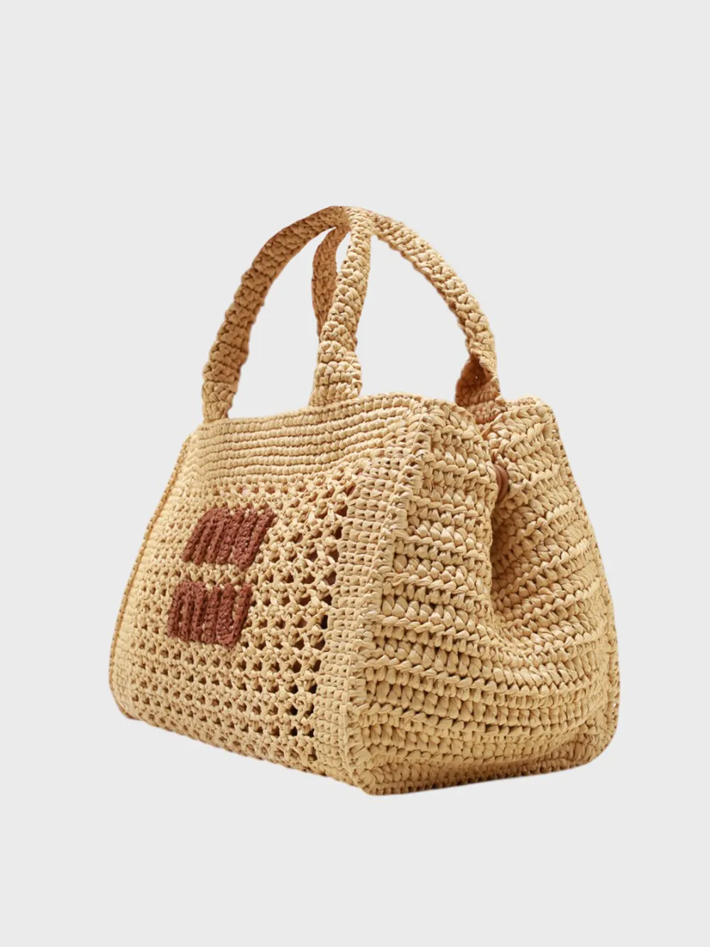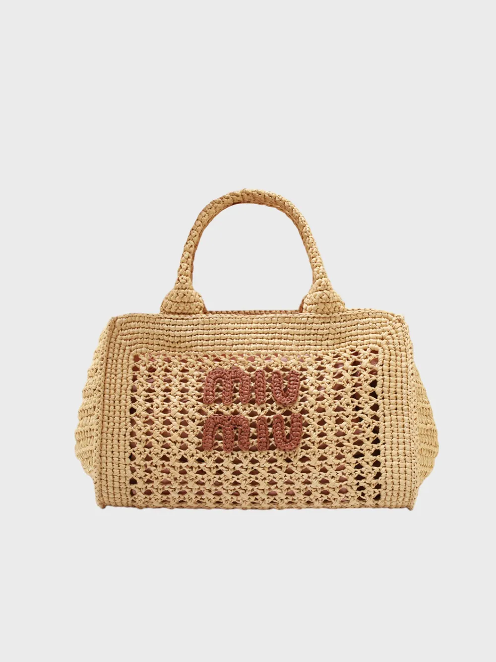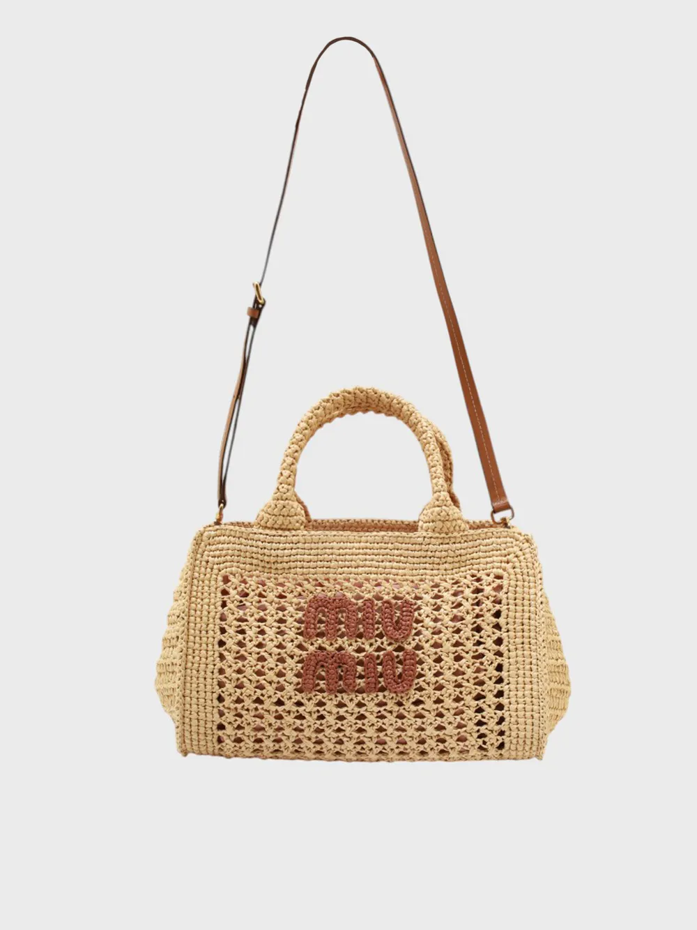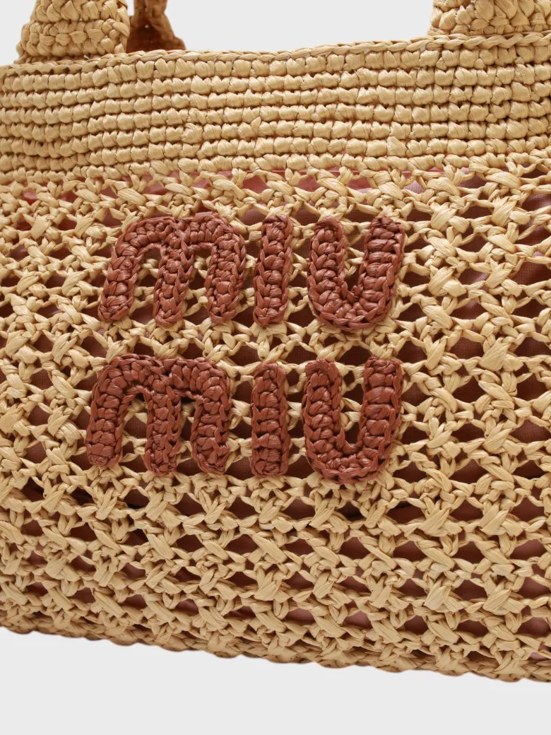 Сумка Miu Miu выполнена из натурального ротанга светло-коричневого цвета с традиционным плетением. Модель дополнена кожаными элементами, включая ремешки и декоративные накладки на передней части, где расположен вышитый логотип бренда. Ремешок можно использовать как ручку или перекинуть через плечо для удобной переноски. Идеальный выбор для летнего сезона — сочетает практичность и стиль в единстве.