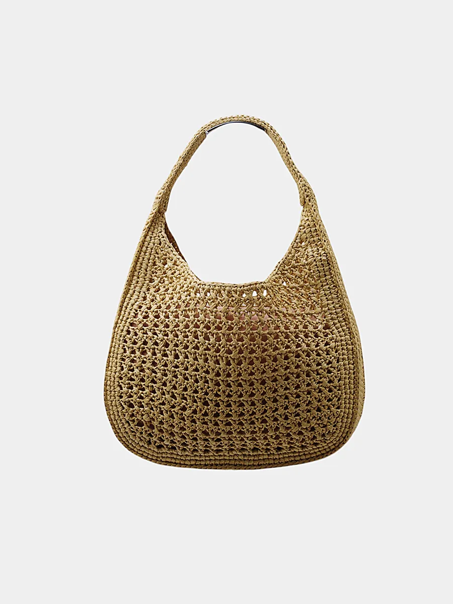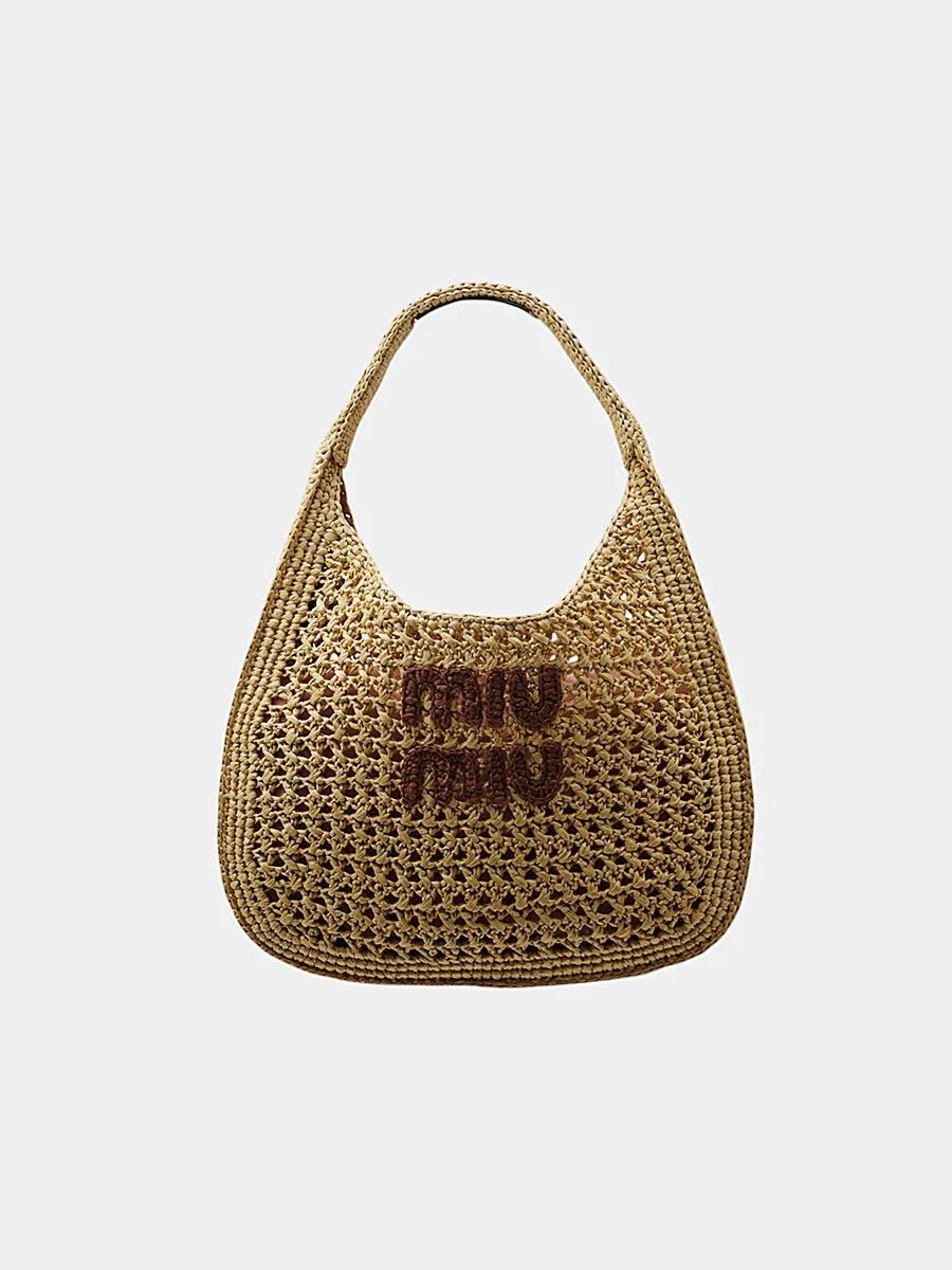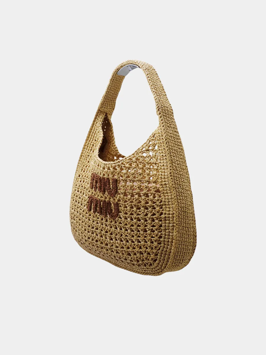 Сумка Miu Miu выполнена из натуральной плетёной ткани песочного оттенка с воздушной текстурой, украшена вышитым логотипом «miu miu» в технике ручного плетения; модель с мягкой дуговой формой и удобной ручкой — стильный аксессуар, сочетающий легкость, экологичность и узнаваемый брендовый шик.