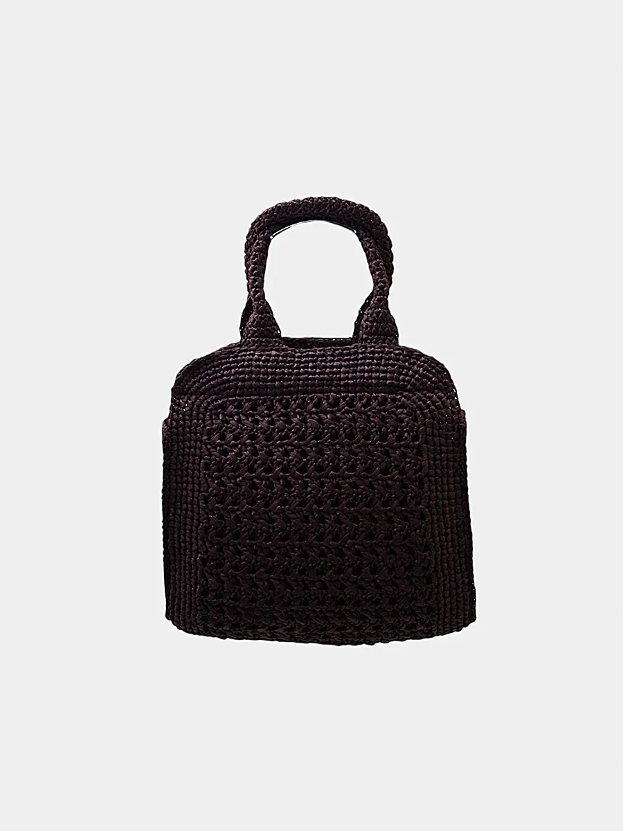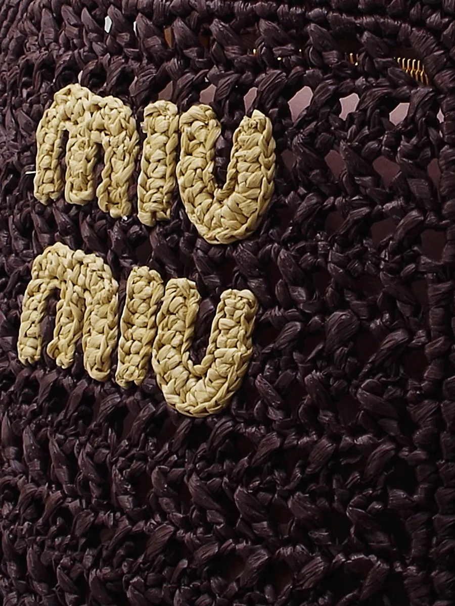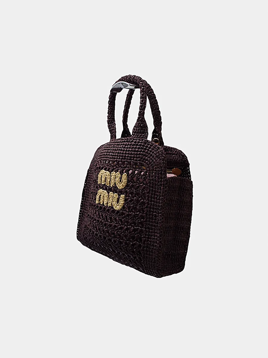Сумка Miu Miu выполнена из плотной плетёной ткани насыщенного бордового оттенка с фактурным рельефом, украшена вышитым логотипом «miu miu» в технике ручного плетения; модель компактного кроя с двумя короткими ручками — утончённый аксессуар, сочетающий ручную работу, стиль и узнаваемый брендовый характер.