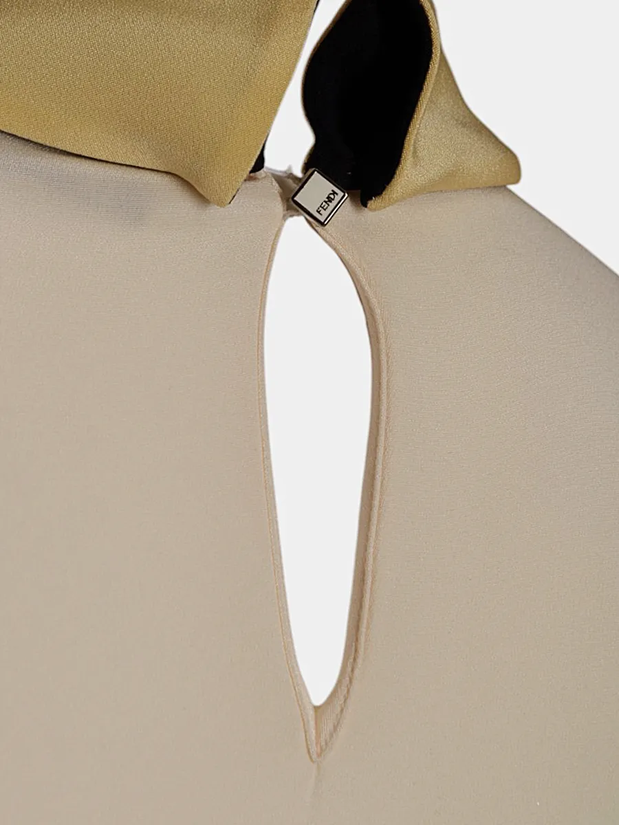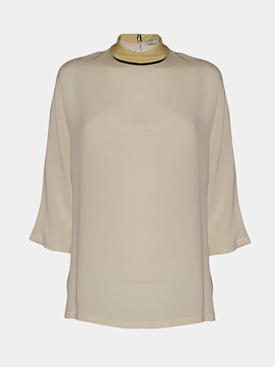 Блуза Fendi выполнена из качественного шелкового материала нежного бежевого цвета. Модель дополнена высоким воротником с контрастной желтой отделкой и декоративным элементом на спинке, оформленным фирменным логотипом бренда. Простой крой с объемными рукавами создает элегантный и современный силуэт, идеально подходящий для делового или вечернего образа.