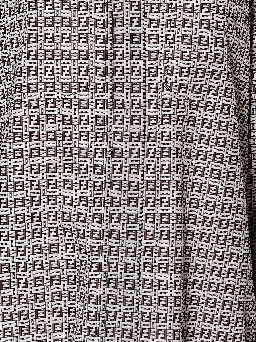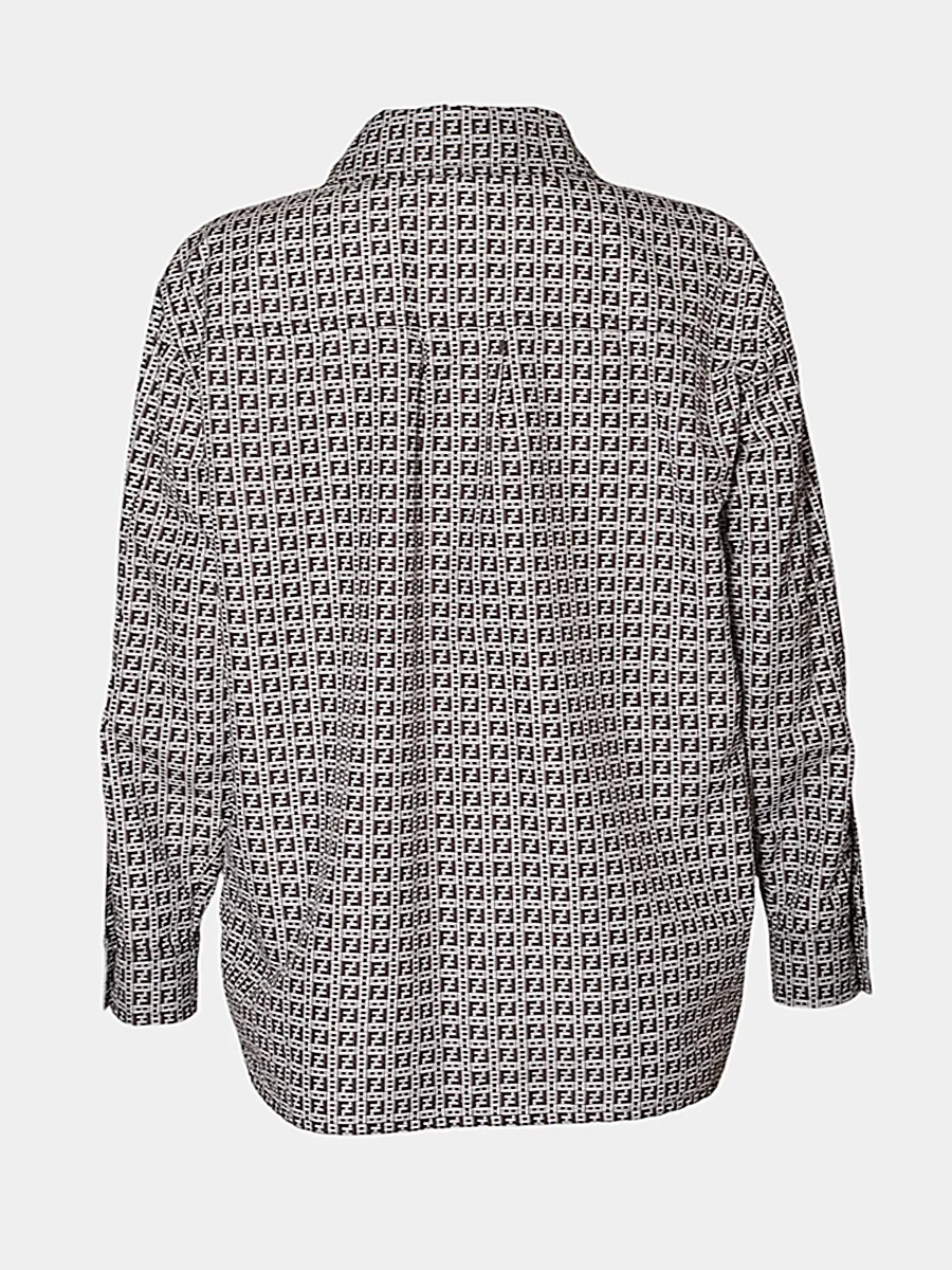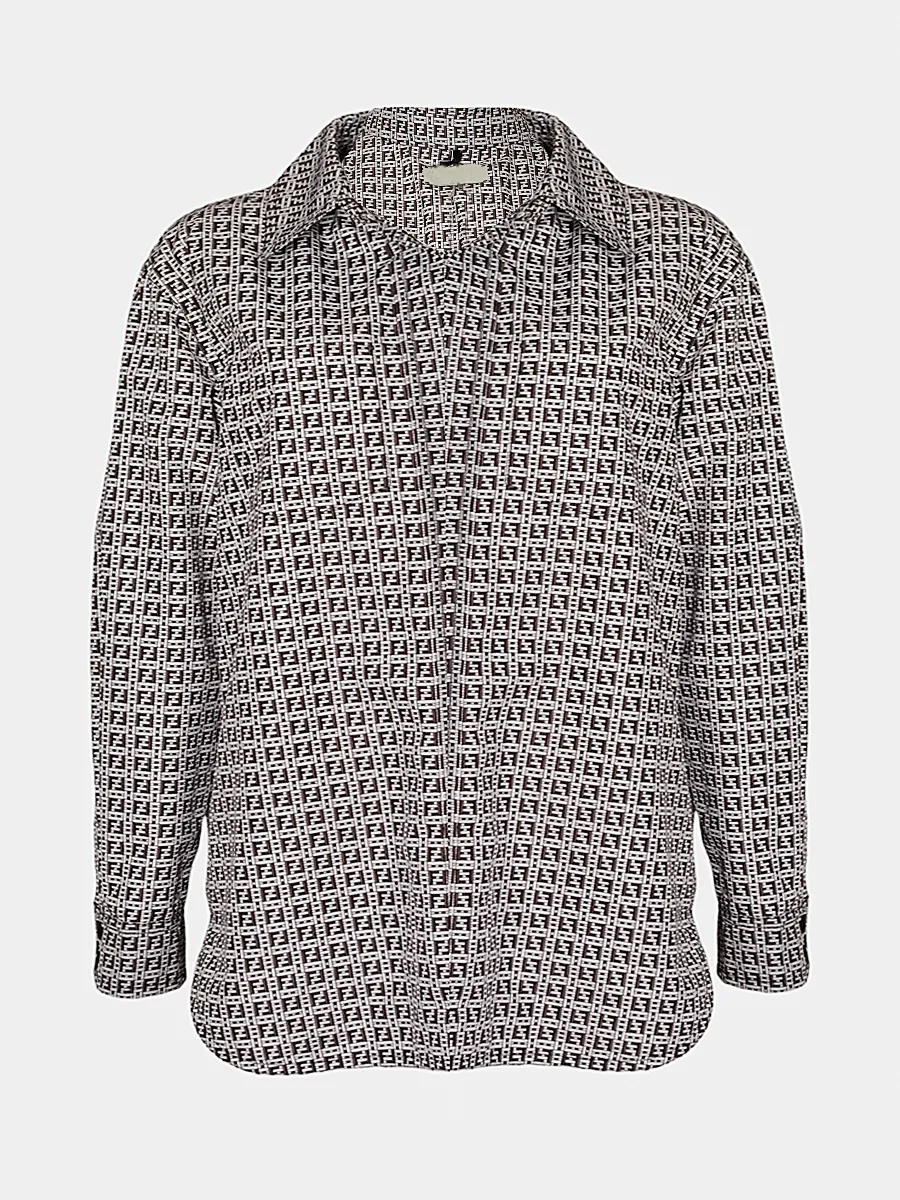 Рубашка Fendi выполнена из качественного шелкового материала в черно-белом цвете с узором, повторяющим фирменный логотип бренда. Модель дополнена классическим воротником и длинными рукавами, создавая элегантный и современный силуэт. Простой крой подчеркивает безупречное качество исполнения, а графичный принт делает рубашку идеальным аксессуаром для делового или вечернего образа.