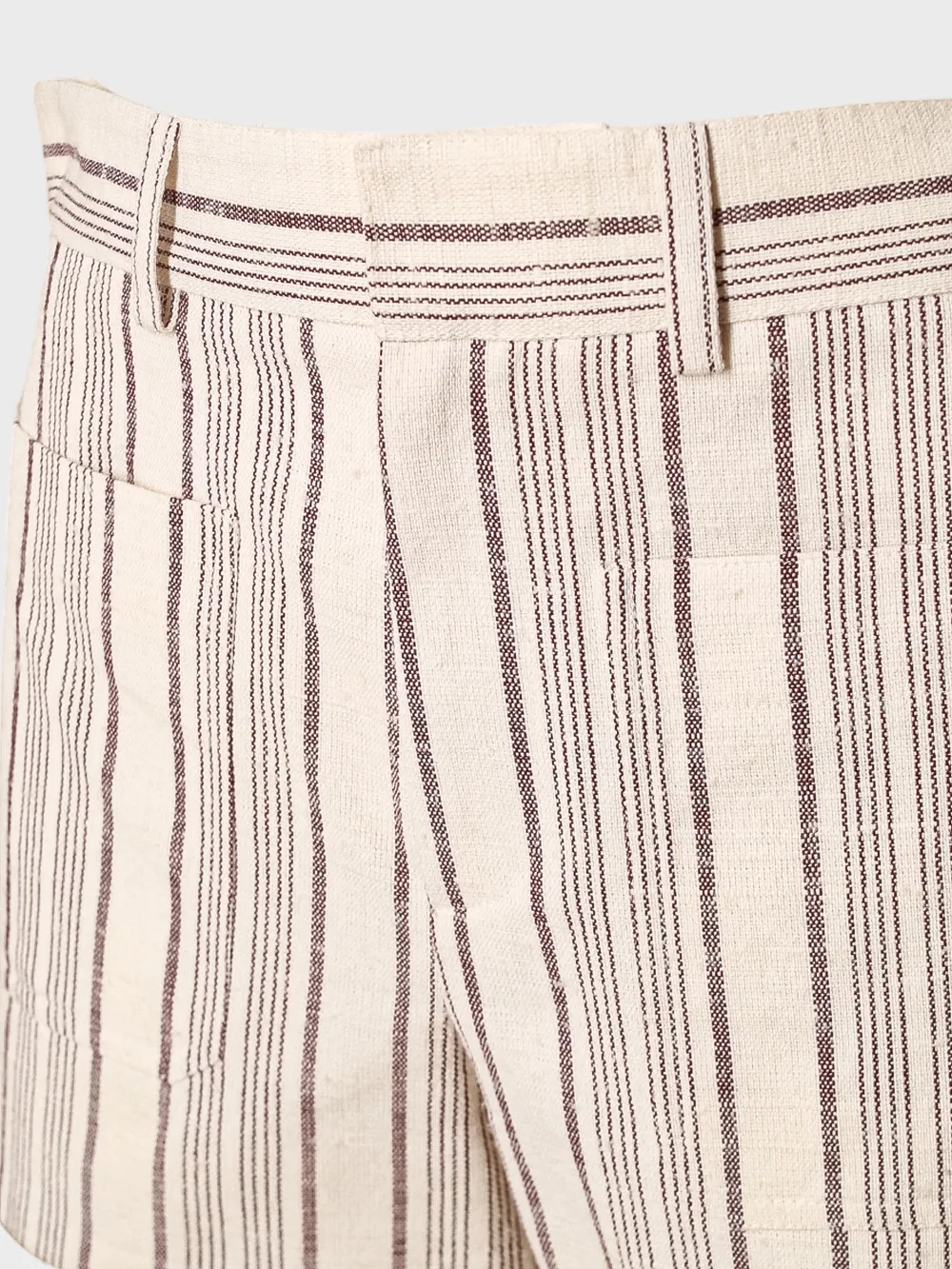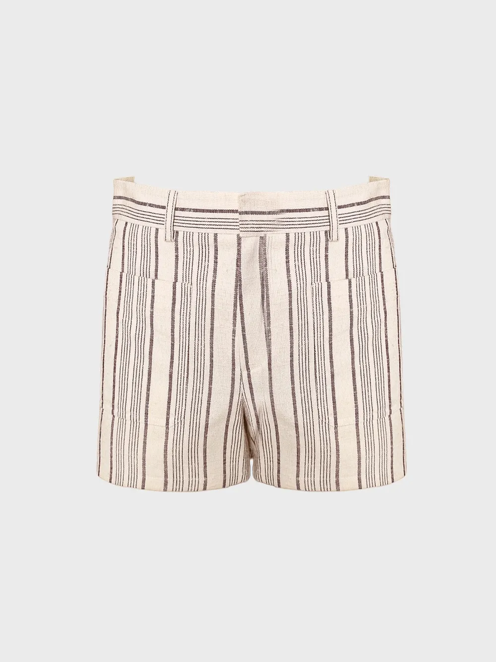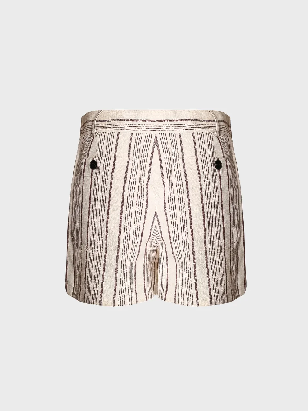 Шорты Christian Dior выполнены из натуральной ткани с вертикальной полоской в нейтральных тонах. Модель дополнена высокой посадкой, двумя карманами спереди и застежкой на пуговицы. Прямой крой и классический дизайн создают элегантный образ, идеально подходящий для летнего гардероба.