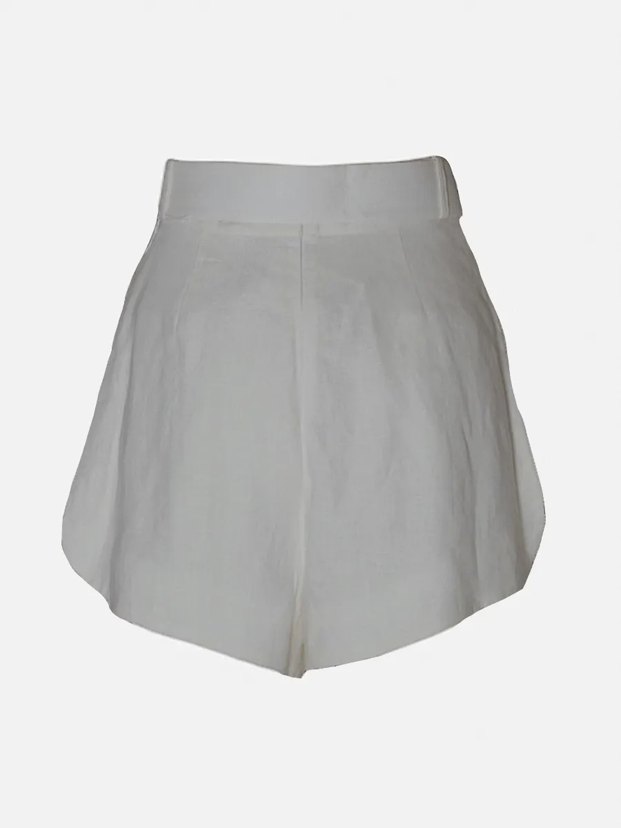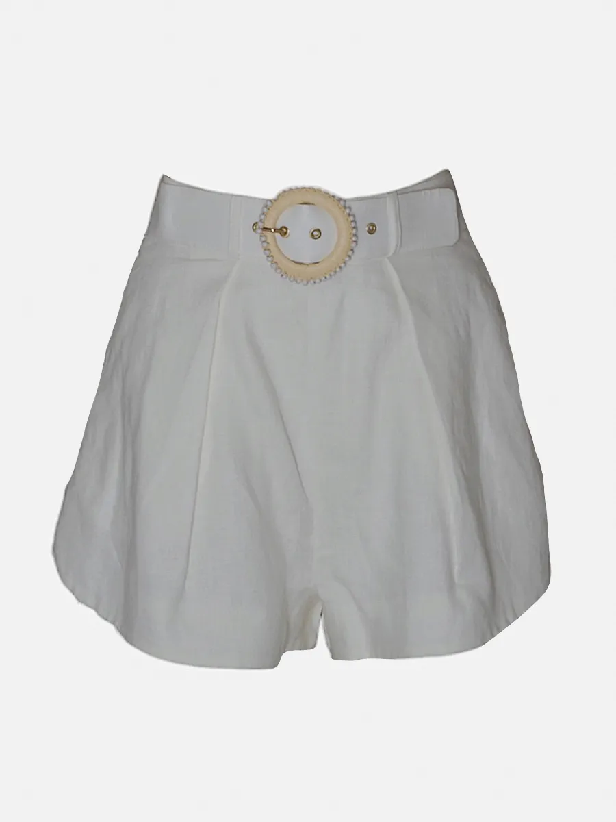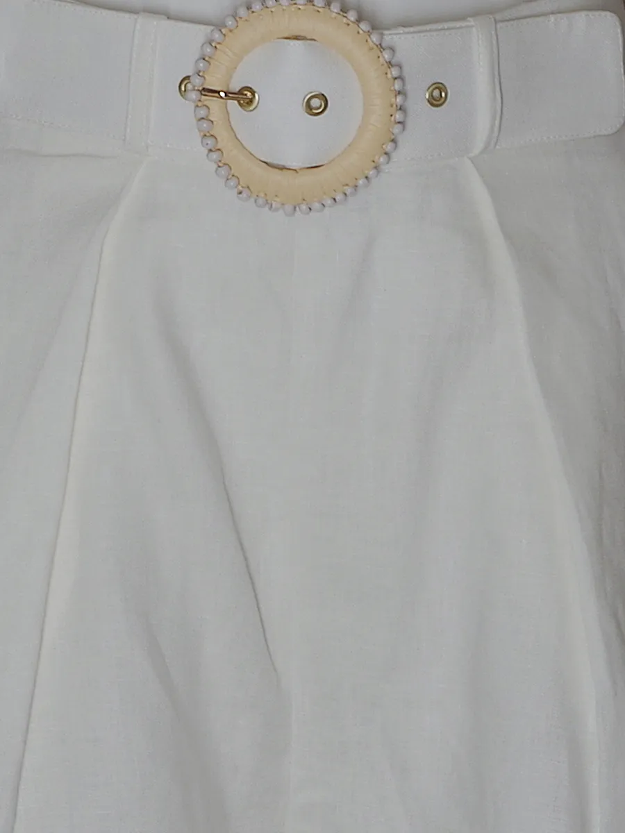 Шорты Zimmermann выполнены из натурального белого льна с высокой посадкой и плавными складками — сочетание элегантности и летнего комфорта. Модель с широким поясом, украшенным крупной круглой пряжкой из натурального материала с бусинами, подчеркивает женственность. Детали: драпировка и минималистичный крой придают изделию легкость и индивидуальность. Идеальный выбор для пляжного отдыха или повседневных образов, где важна уникальность и качество исполнения.