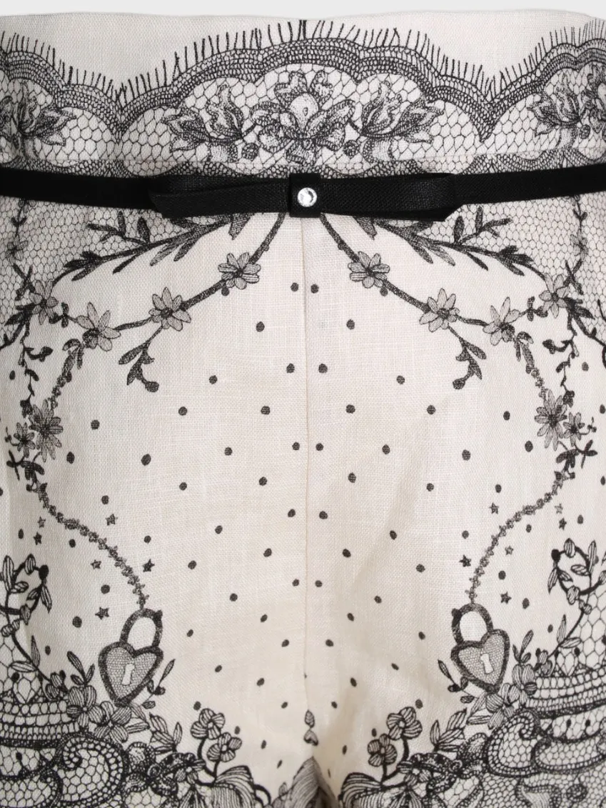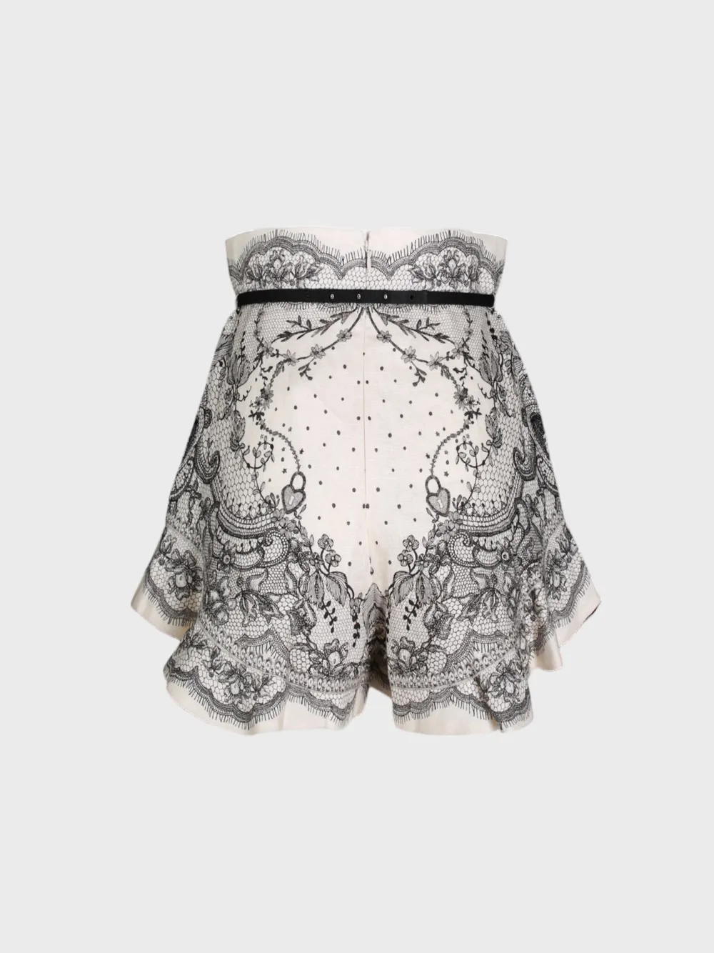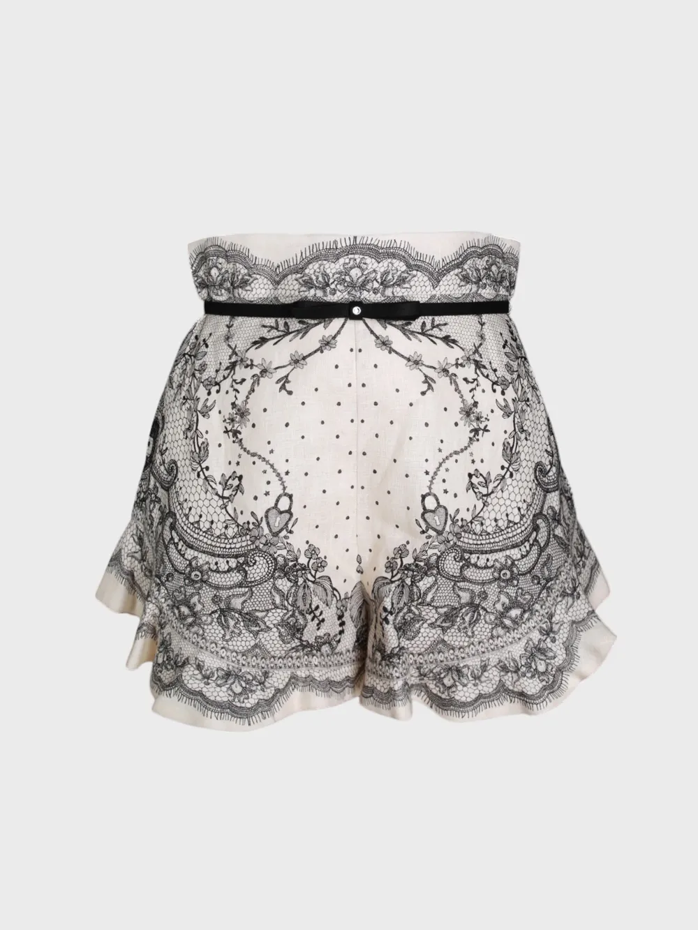 Шорты Zimmermann выполнены из тонкой белой ткани с кружевным узором в черно-белых тонах, включающим флористические элементы и сердечки. Модель имеет высокую посадку и декорирована поясом из темного атласа с бантом на талии. Детали, такие как полупрозрачные панели на груди и юбка с пышной складкой, добавляют романтический и элегантный стиль. Идеально подходит для вечерних мероприятий или особого случая.
