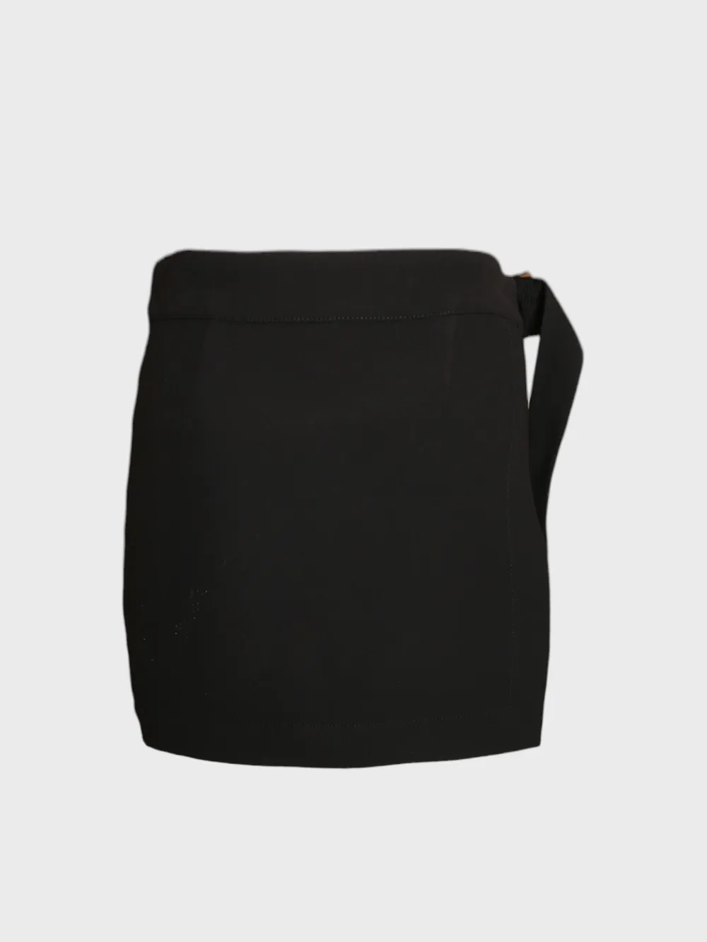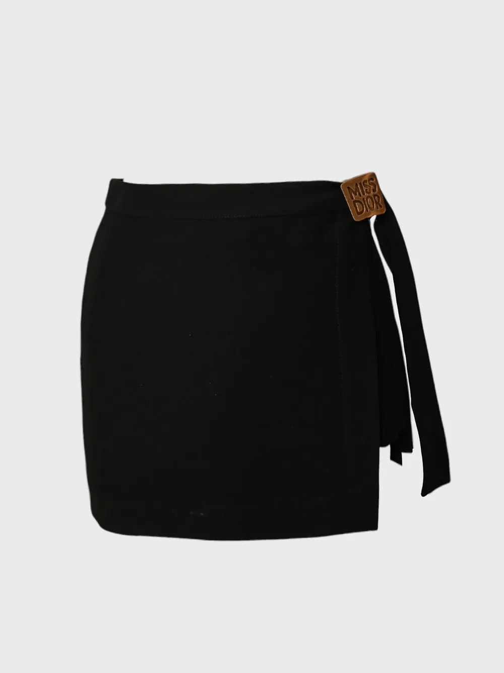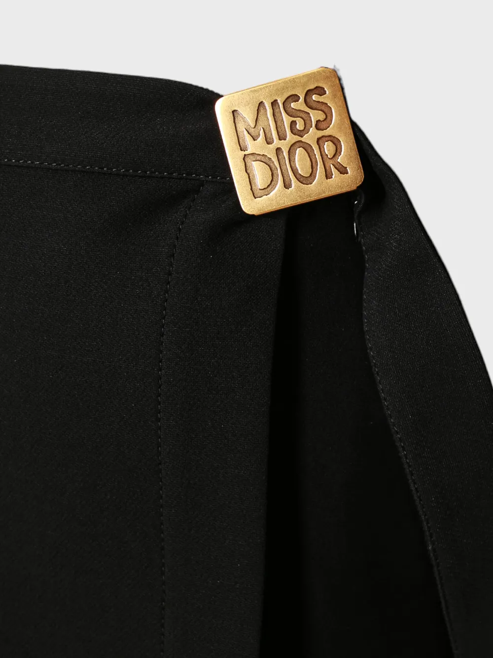 Элегантные шорты от культового бренда Dior выполнены из качественного черного материала с гладкой фактурой. Модель дополнена контрастной кожаной нашивкой с золотым логотипом "Miss Dior", которая придает изделию узнаваемый премиальный стиль. Шорты имеют зауженный крой, подчеркивающий фигуру, и декоративный завязанный ремень по бокам для комфортной посадки. Идеальное сочетание классики и современности — отличный выбор для вечернего или делового образа.