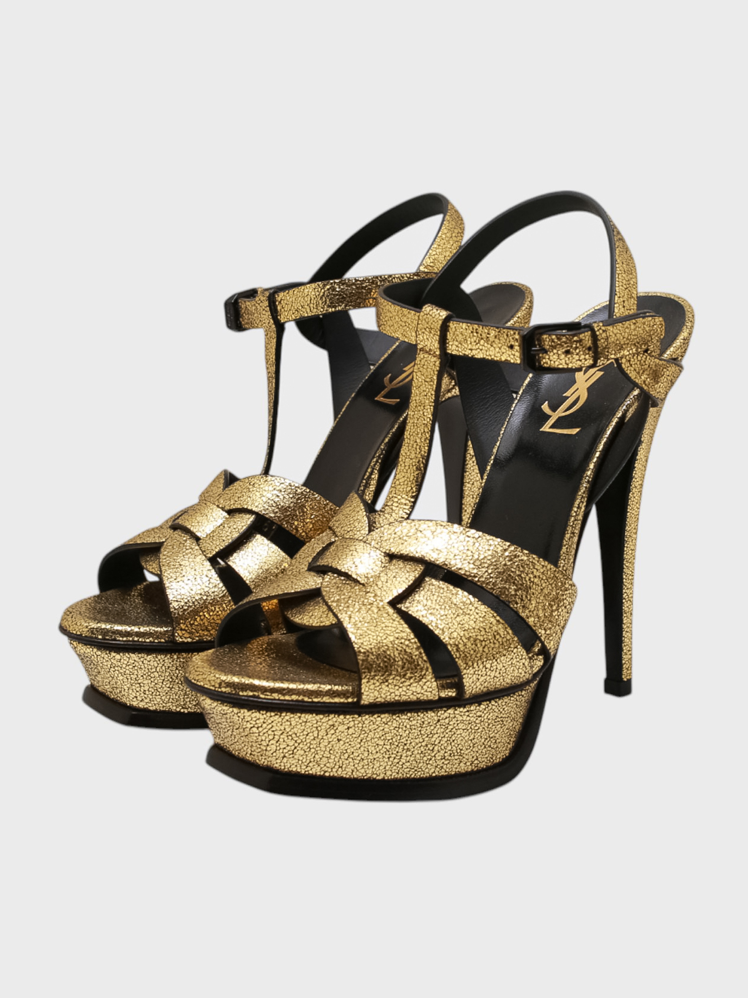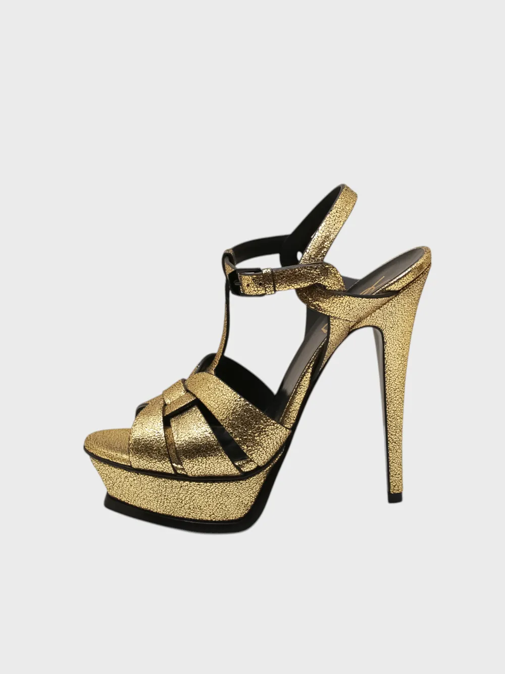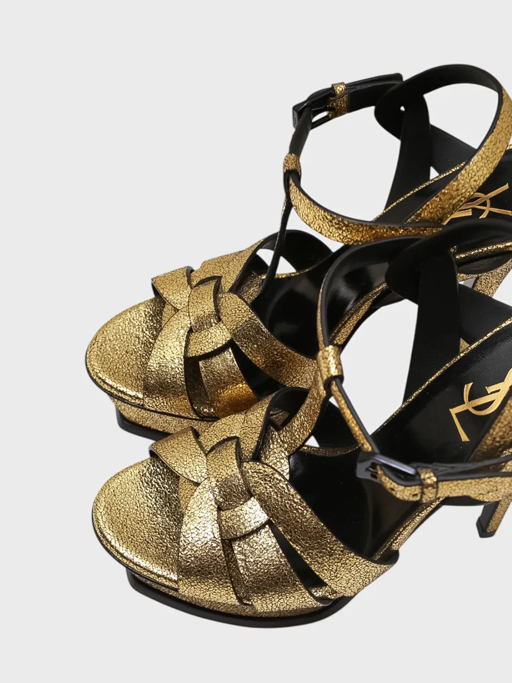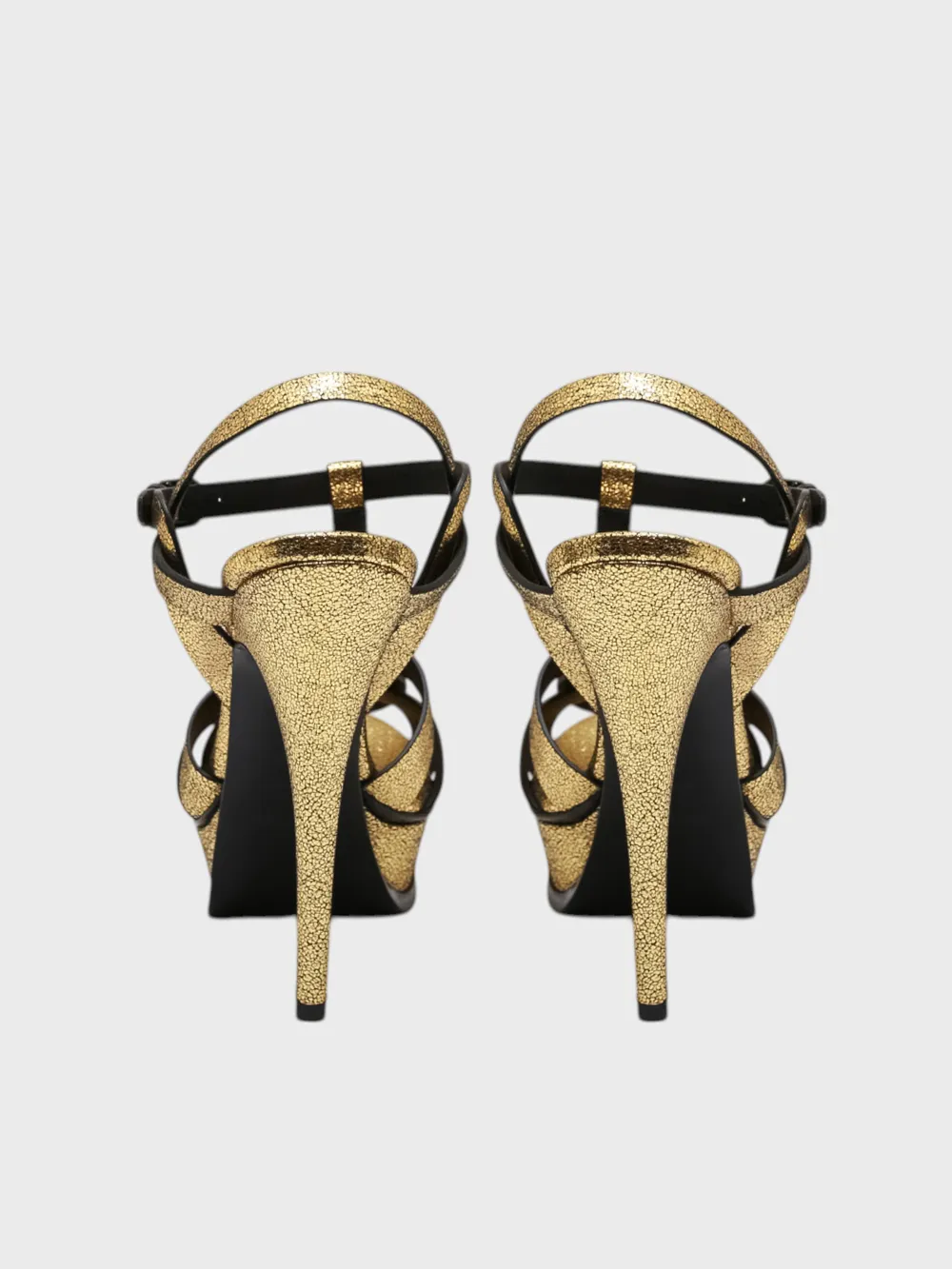 Босоножки выполнены из качественной золотистой кожи с фактурным глиттерным эффектом и черными вставками. Модель дополнена элегантной перекрестной стропой на носке, ремешком на щиколотке и высоким шпилькой для безупречного силуэта. Закрытый каблук обеспечивает устойчивость и комфорт при движении. Идеальный выбор для вечерних мероприятий и торжественных случаев.