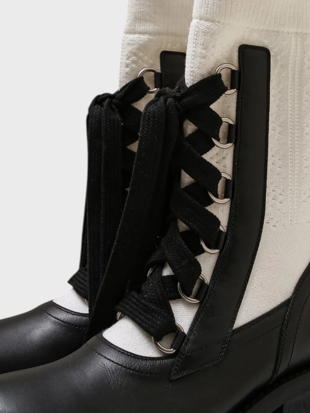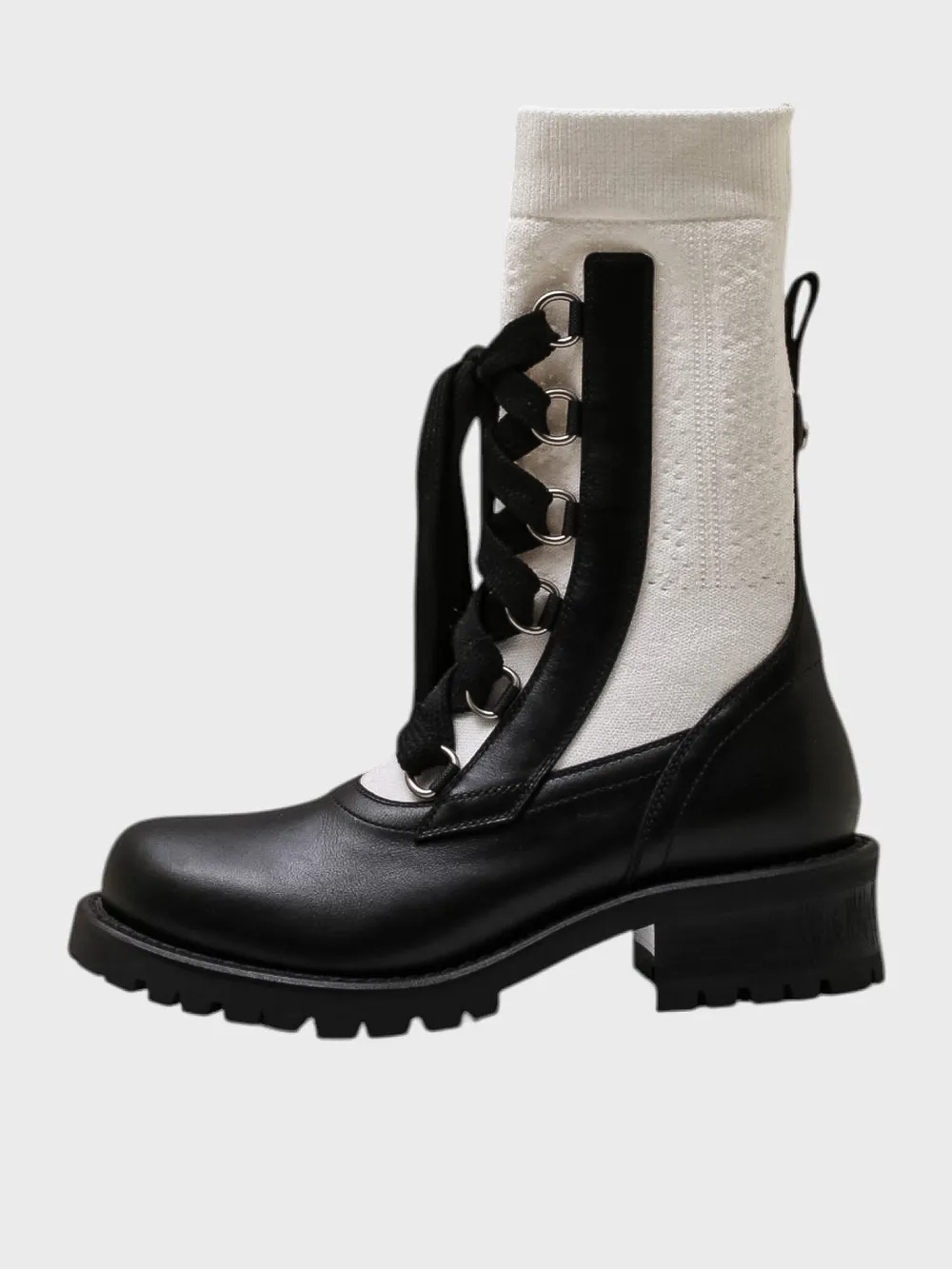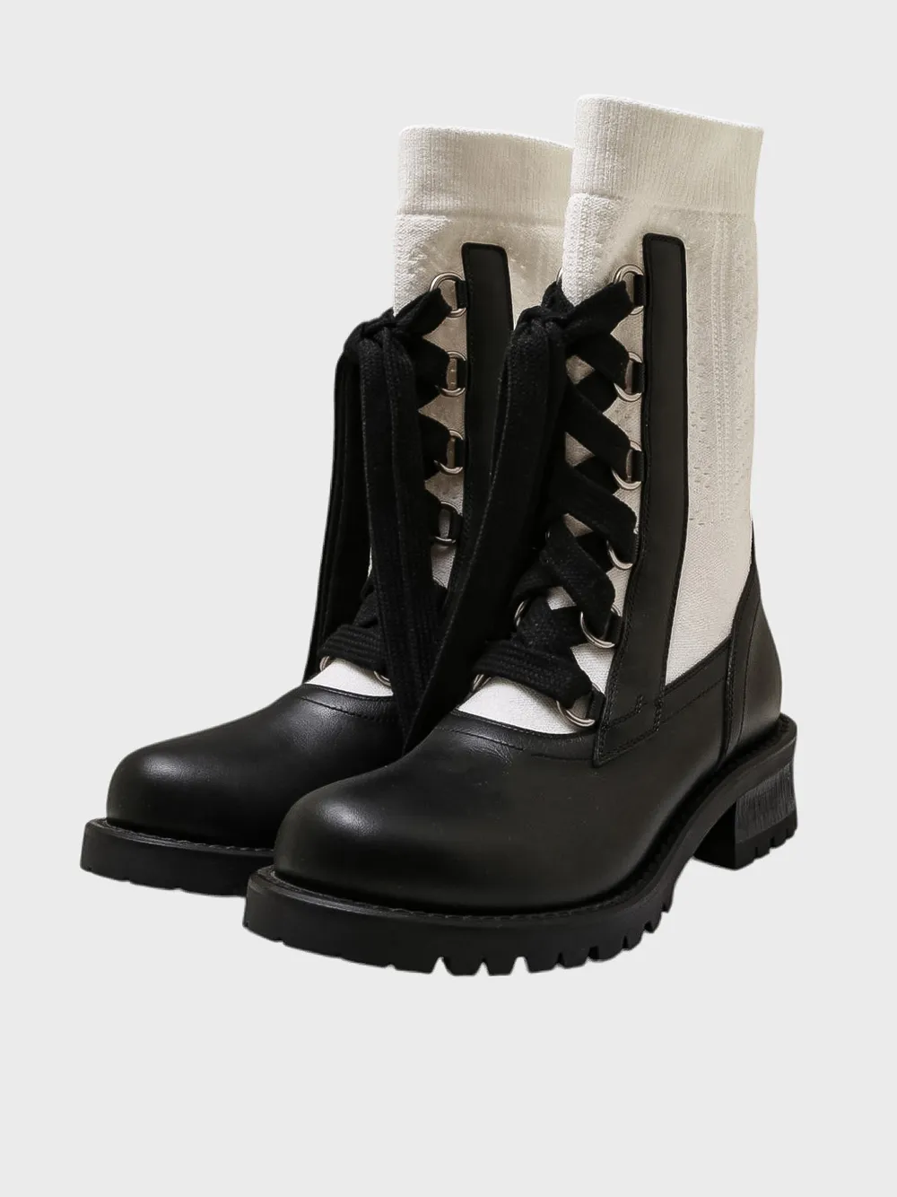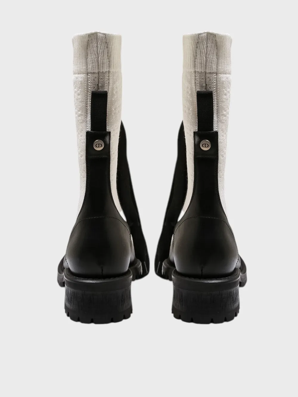 Ботинки Christian Dior выполнены из черной кожи и белого текстиля с фактурным дизайном. Модель сочетает элегантность и функциональность, благодаря комбинированному верху и массивной подошве с рифленым протектором для улучшенной проходимости. Особенностью являются шнуровка на металлических кольцах и контрастные вставки, придающие изделию современный вид. Верхняя часть оформлена мягким трикотажным материалом, обеспечивающим комфортную посадку. Идеальный выбор для городского стиля и повседневного использования.