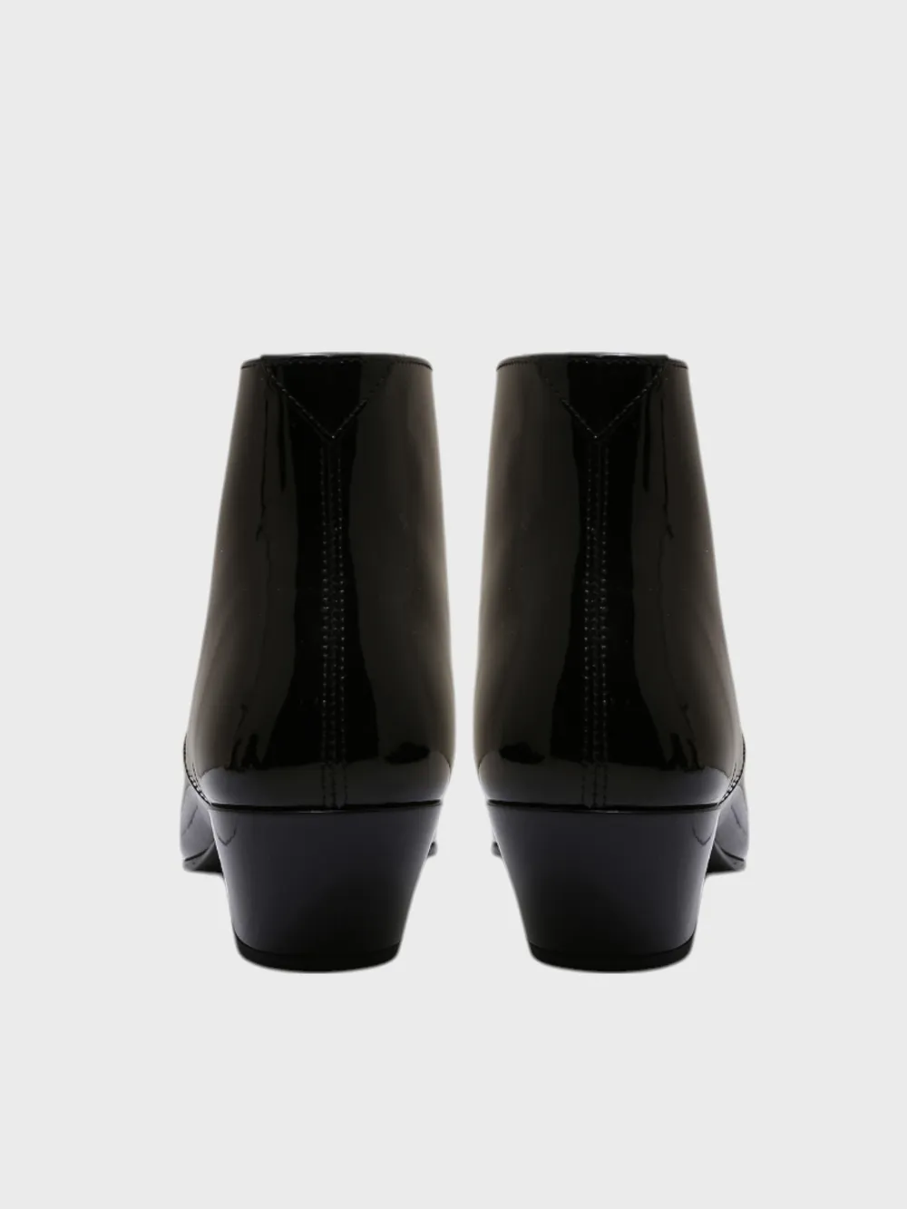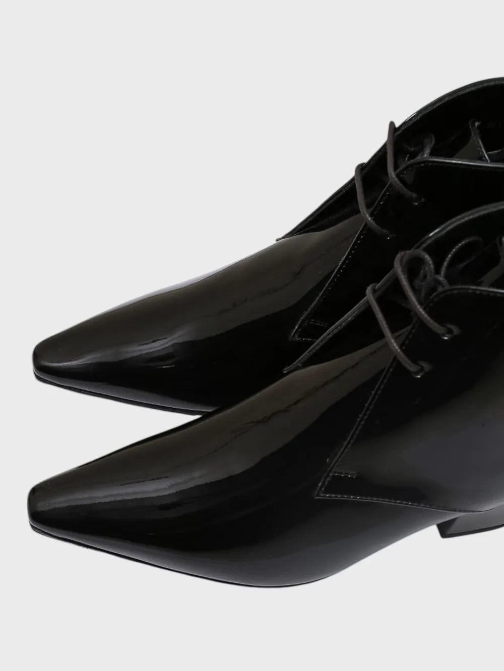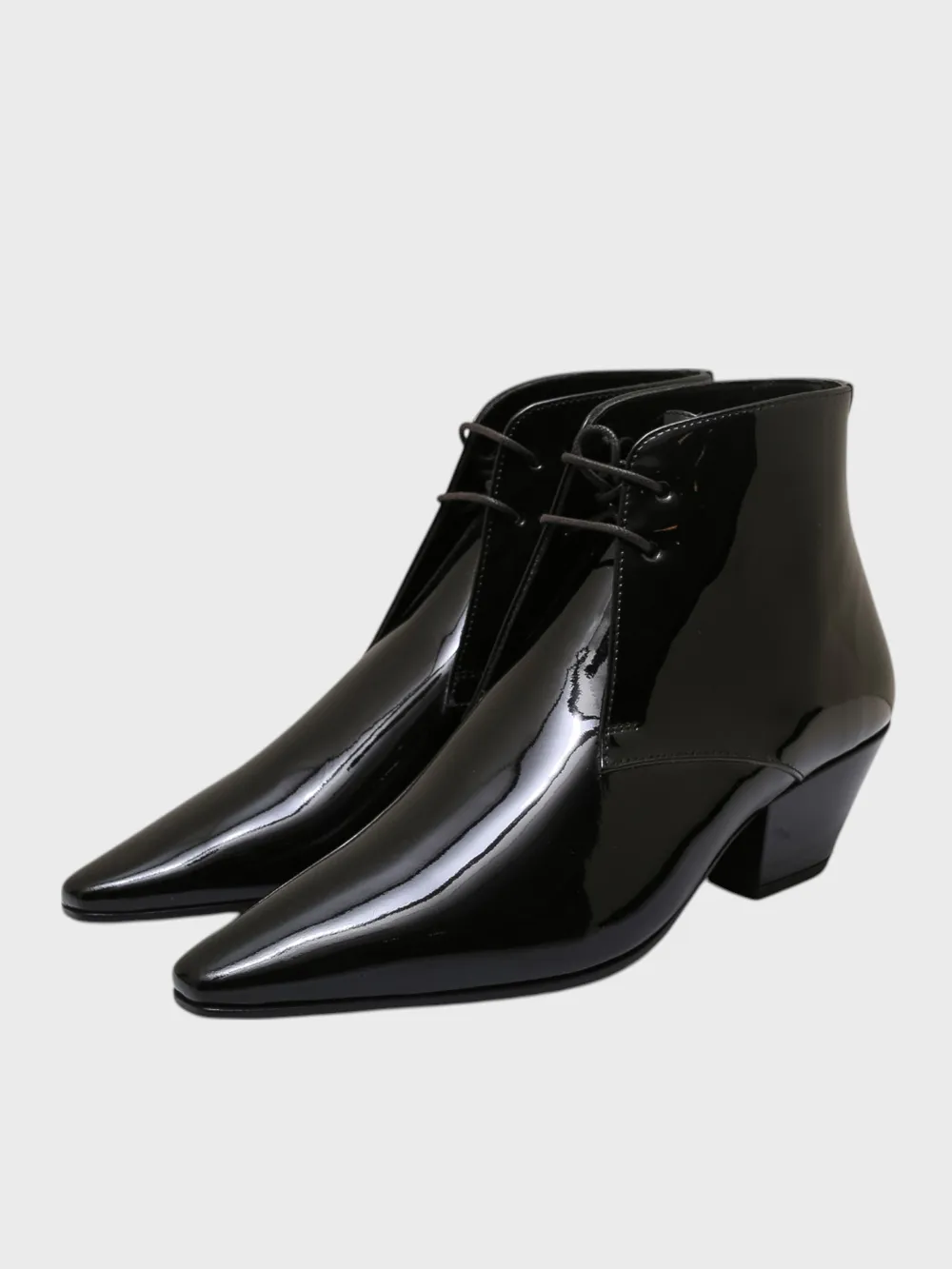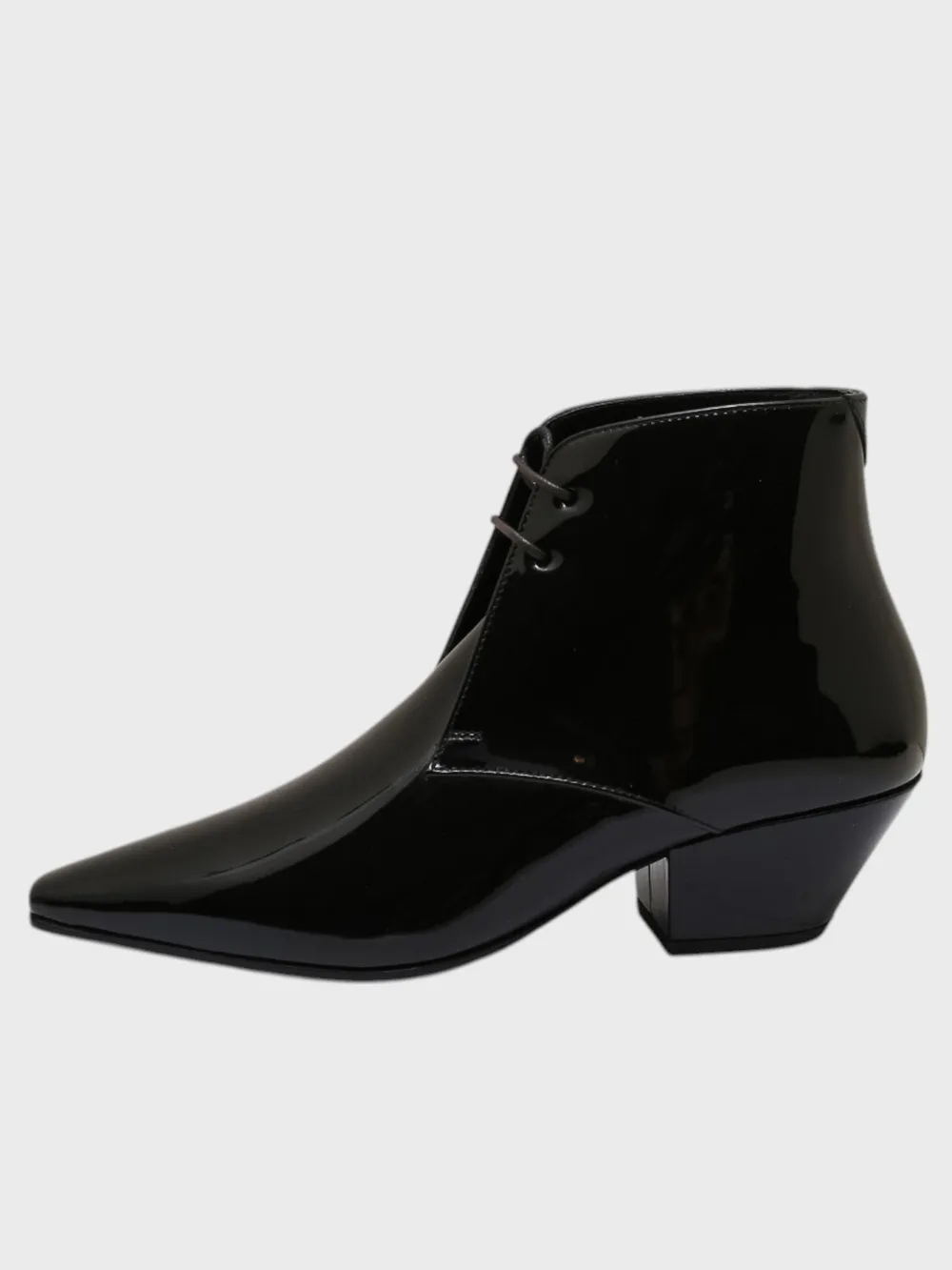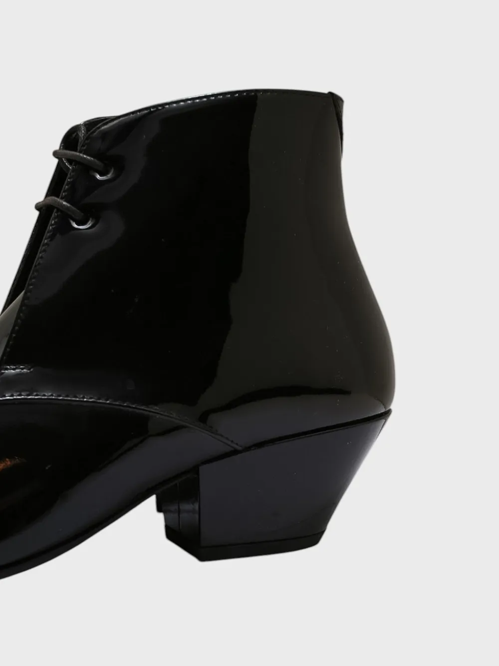 Ботинки выполнены из черной лаковой кожи с блестящим эффектом. Модель дополнена классической шнуровкой на передней части, что придает изделию утонченный и элегантный вид. Устойчивый каблук обеспечивает комфорт при движении. Идеальный выбор для осенне-зимнего сезона или делового стиля.