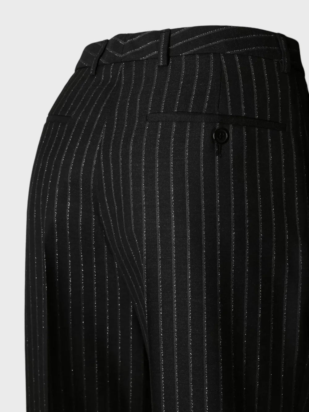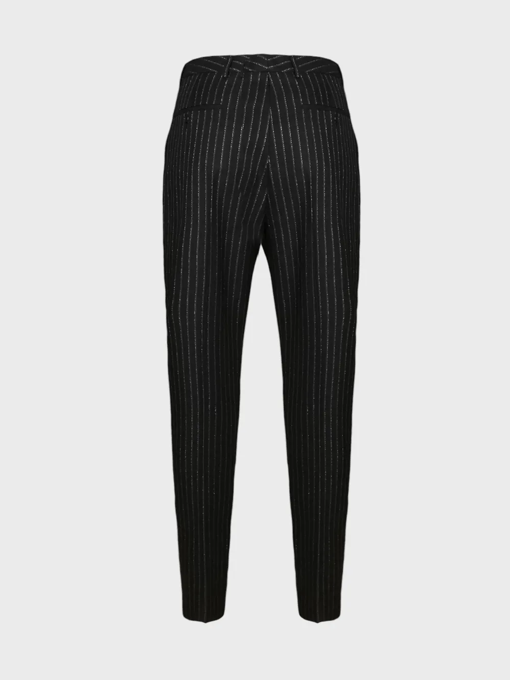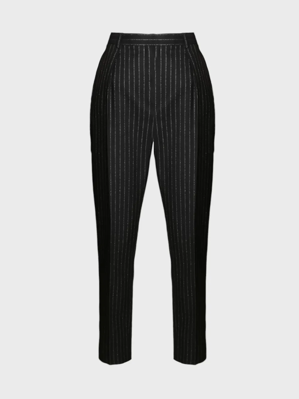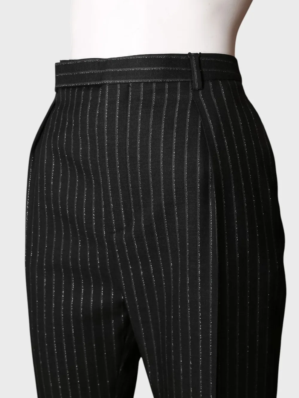 Брюки Saint Laurent выполнены из черного фактурного материала с эффектом металлизированных полос, придающих им элегантный блеск. Модель дополнена высокой посадкой и приталенным кроем, подчеркивающим фигуру. Детали пуговиц и застежек изготовлены из качественного материала, добавляя акцент на классический стиль. Стильные и роскошные — идеальный выбор для делового или вечернего образа.