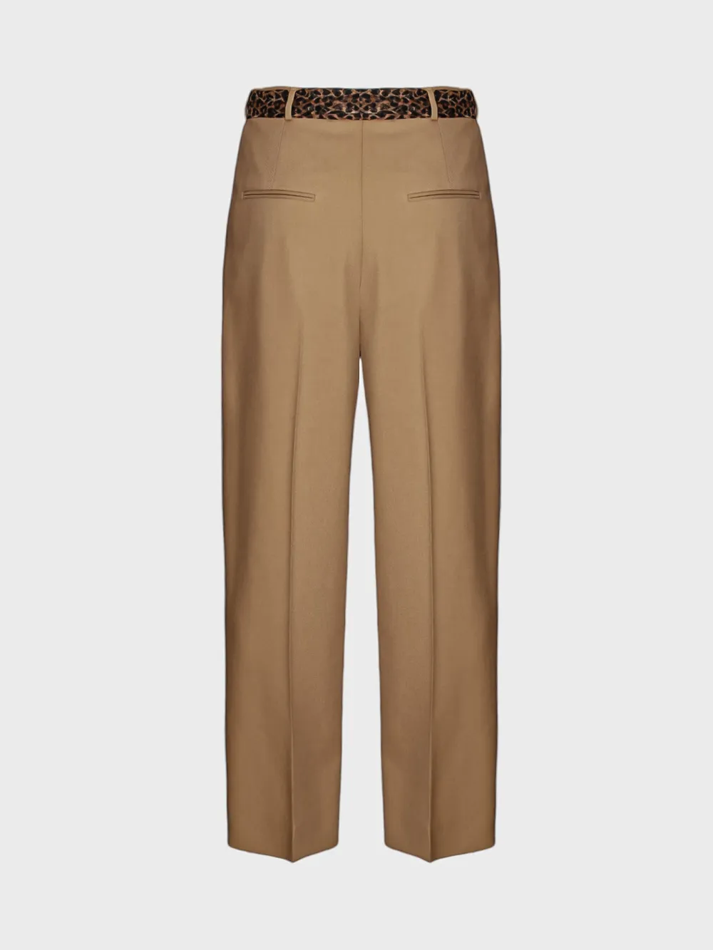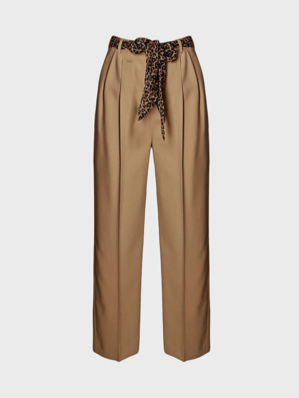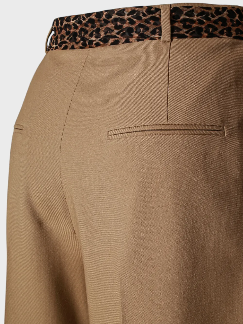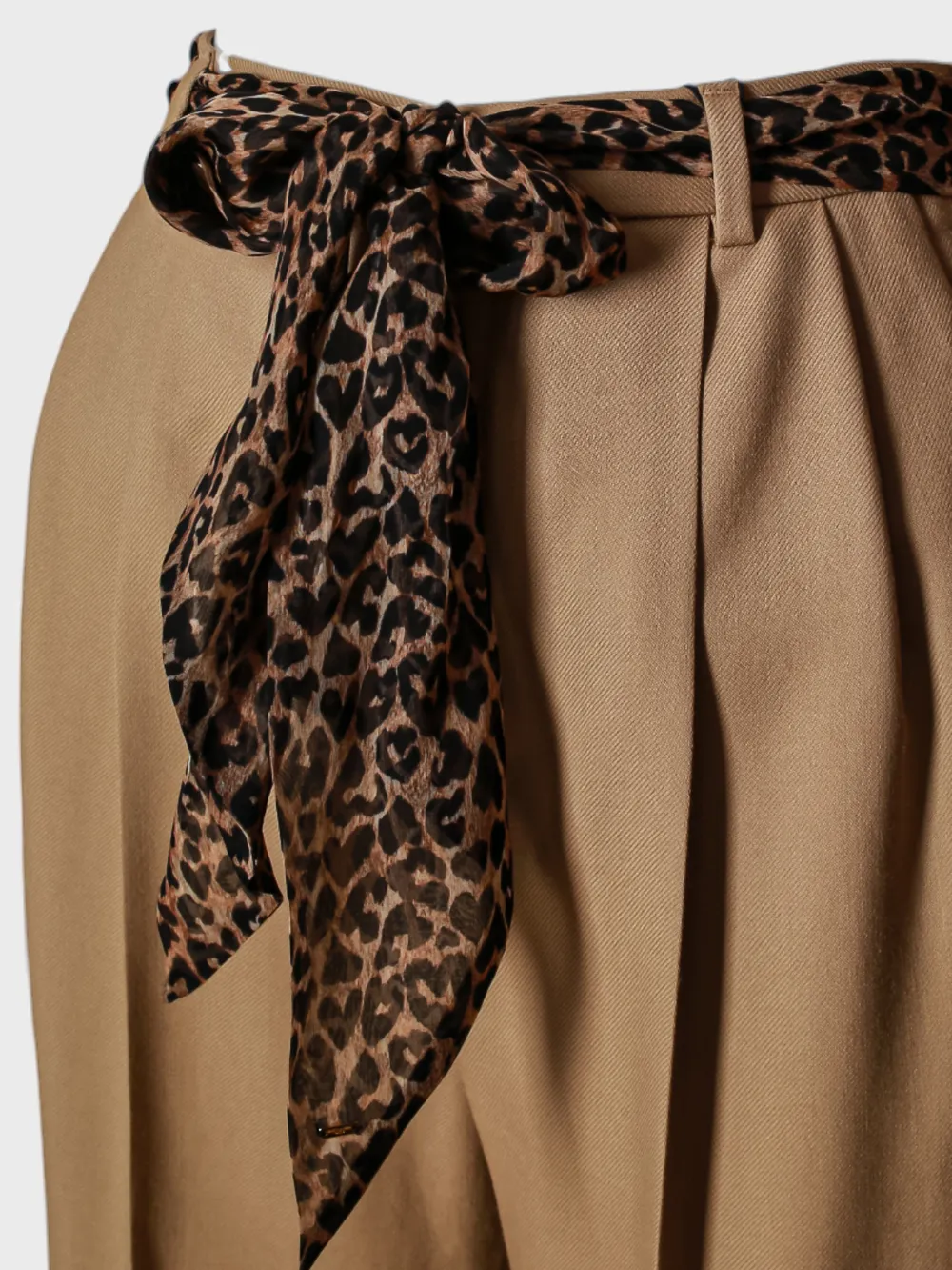 Брюки Saint Laurent выполнены из качественного твида в нежном карамельном оттенке. Модель прямого кроя дополнена высокой посадкой и контрастным леопардовым ремешком, который добавляет изделию современный и элегантный акцент. Классическая пятикарманная конструкция обеспечивает комфортную посадку и функциональность. Идеальный выбор для делового стиля и вечерних образов.