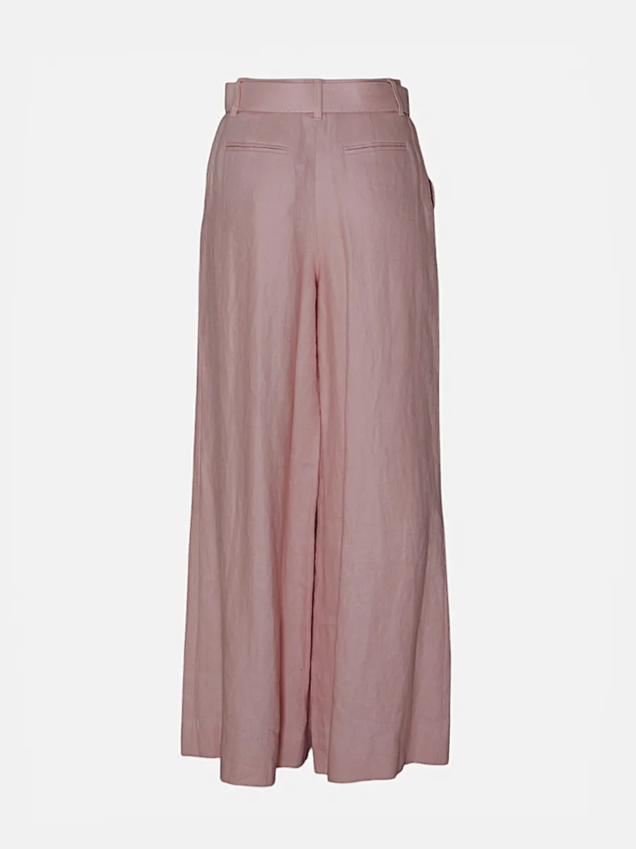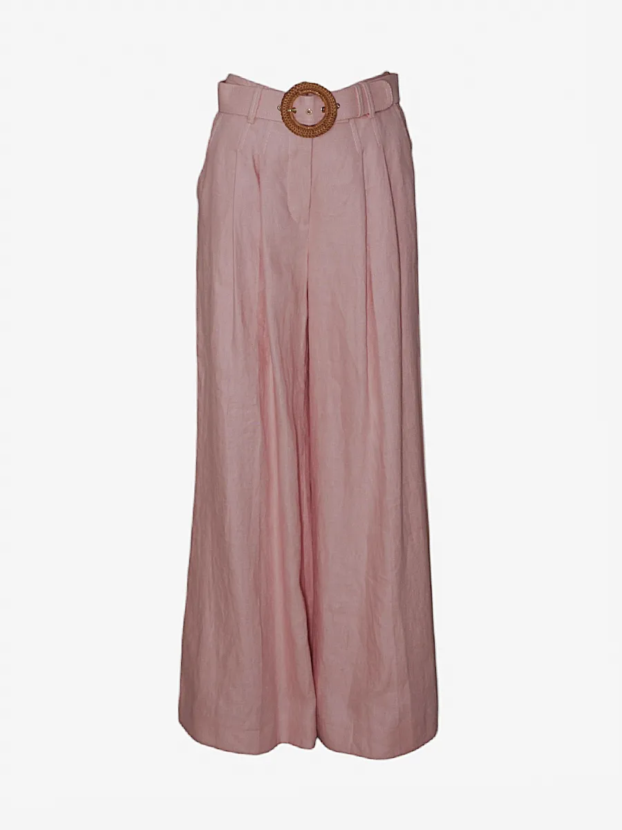 Брюки Zimmermann выполнены из льняной ткани нежно-розового цвета с широким кроем и высокой посадкой, сочетают комфорт и элегантность; декоративный плетёный ремень с круглой пряжкой подчёркивает талию — стильный элемент для летнего или повседневного образа.