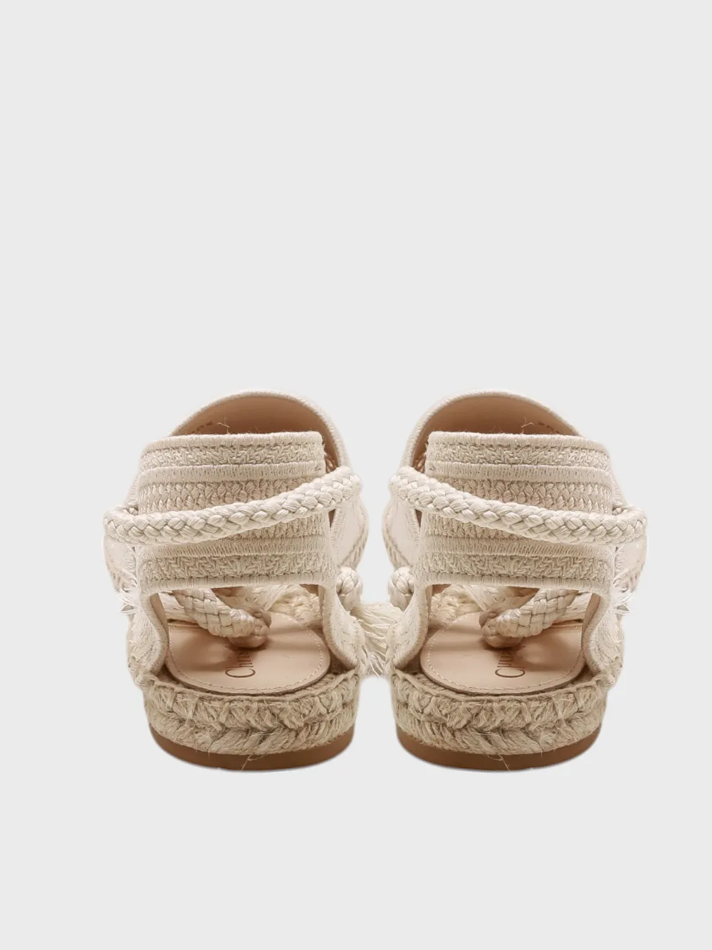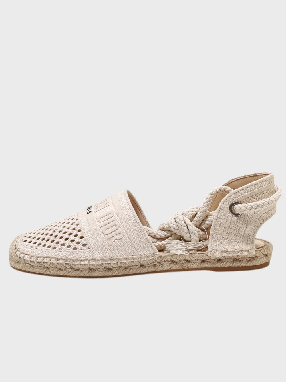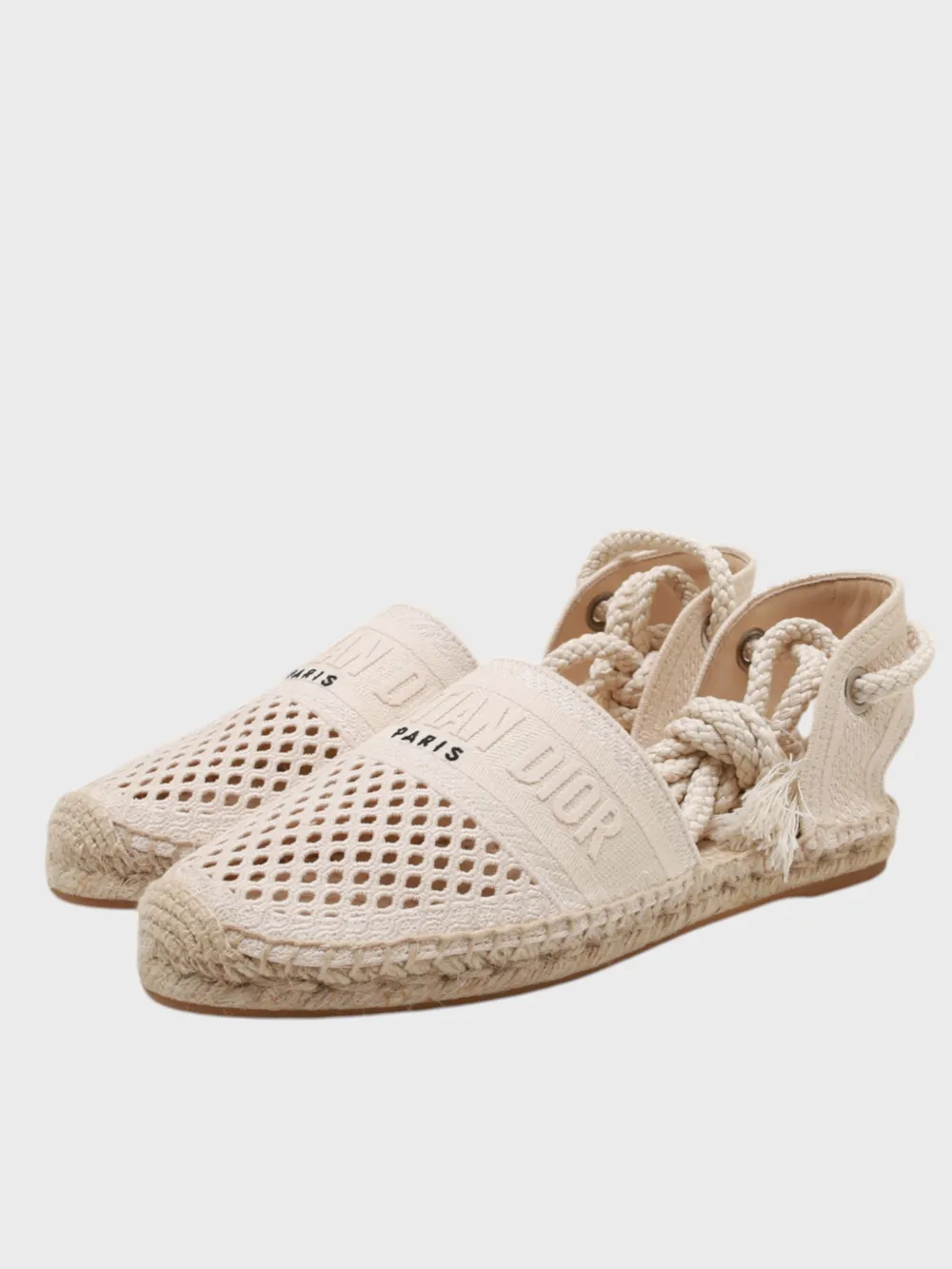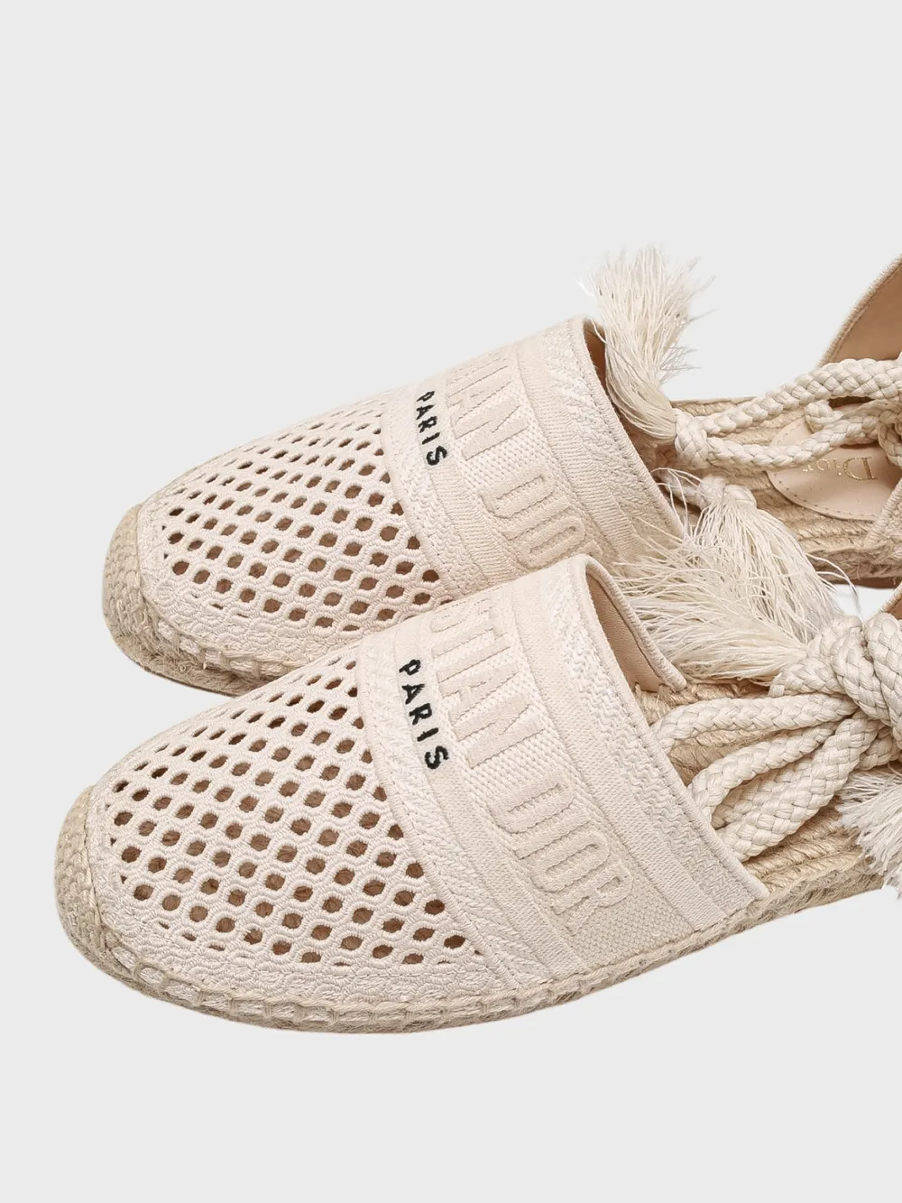 Обувь Christian Dior представляет собой бежевые эспадрильи с открытым носком. Модель выполнена из натурального ротанга и текстиля, декорирована плетеными элементами и логотипом "Dior". Подошва тонкая, обеспечивает комфорт при длительной носке. Удобный вариант для летнего сезона, сочетающий стильность и практичность.