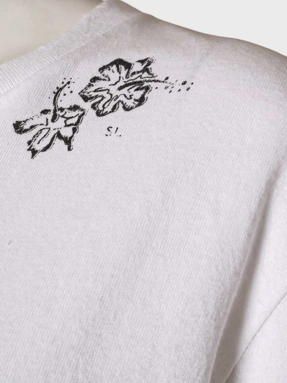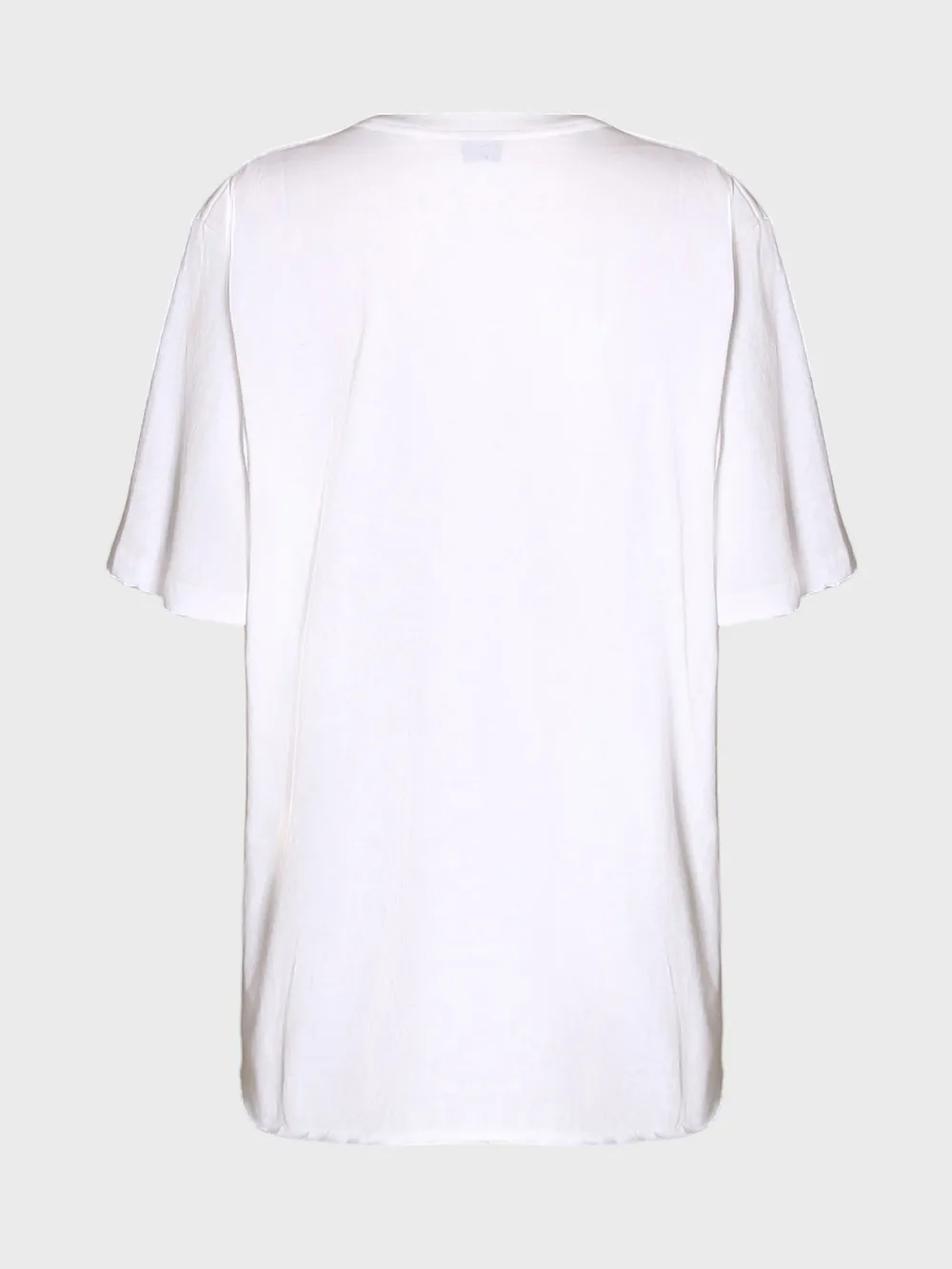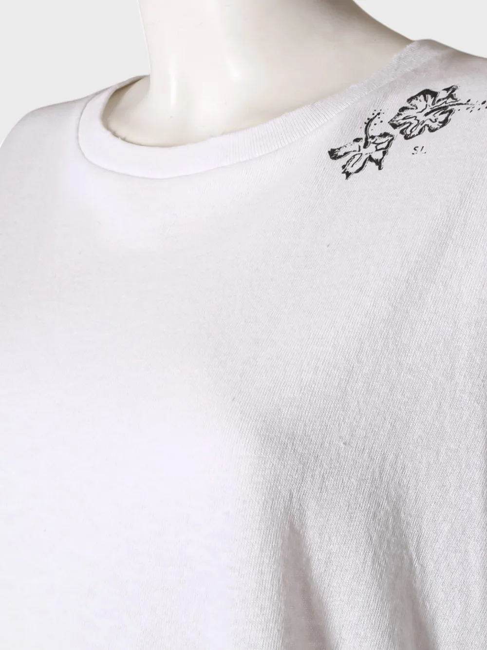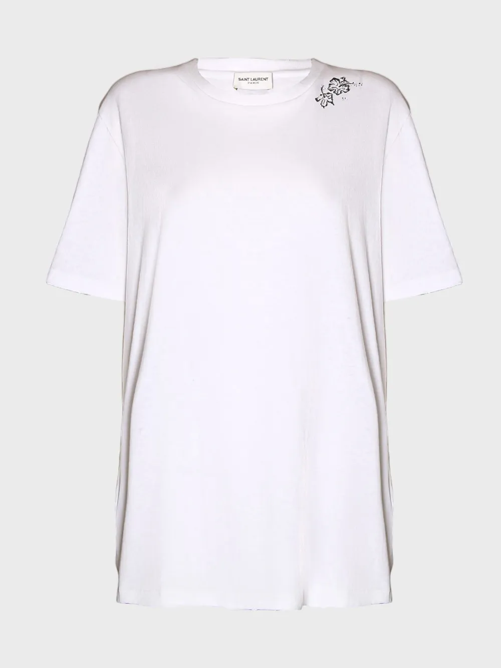 Футболка Saint Laurent выполнена из мягкого белого хлопка с круглым вырезом. Модель дополнена стильным графическим принтом на груди, который придает изделию современный и уникальный вид. Простой крой и свободный силуэт обеспечивают комфортную носку. Идеальный выбор для повседневного стиля и базового гардероба.