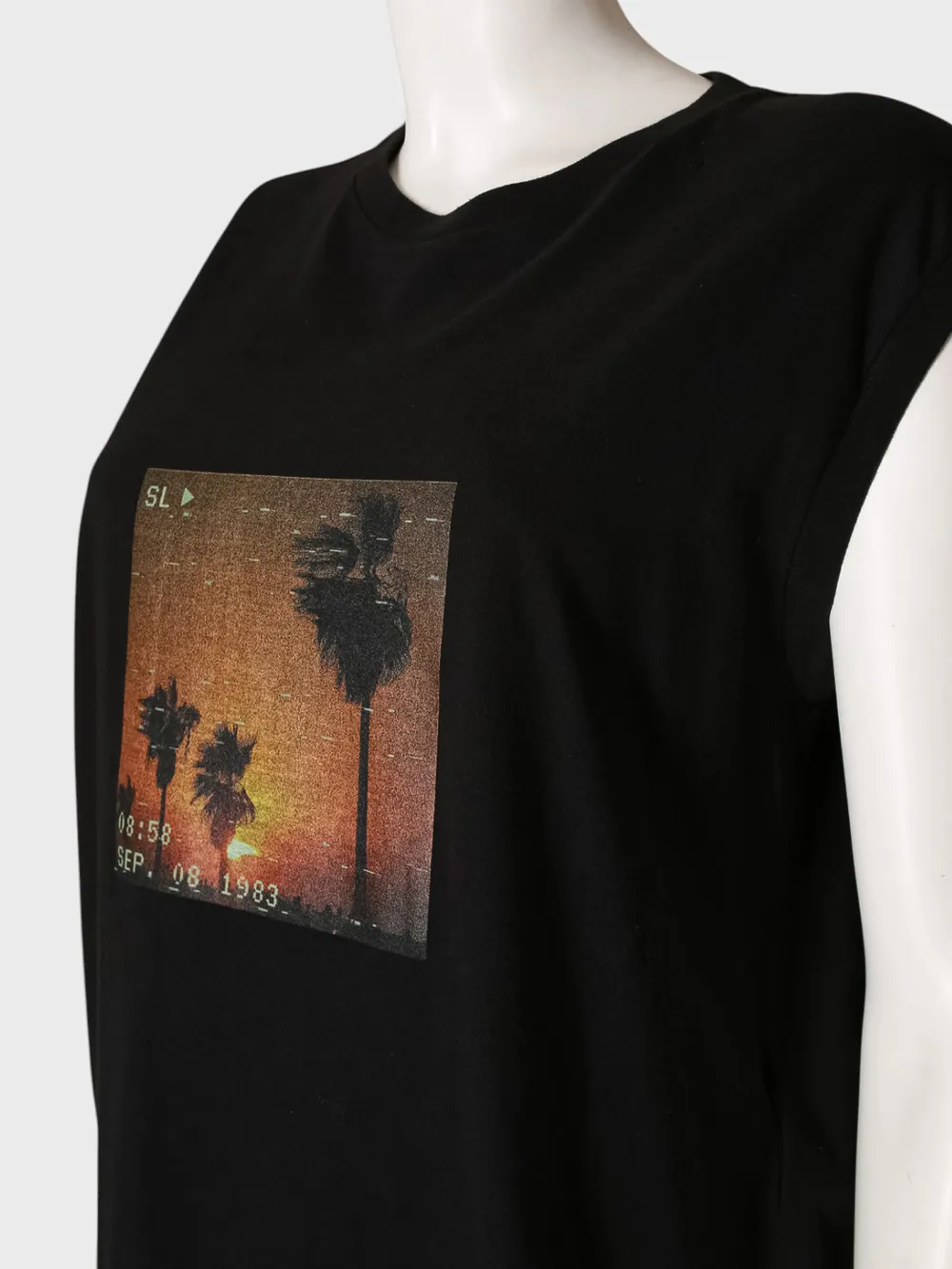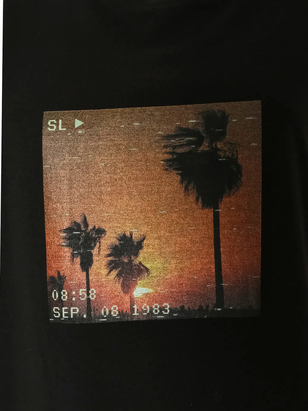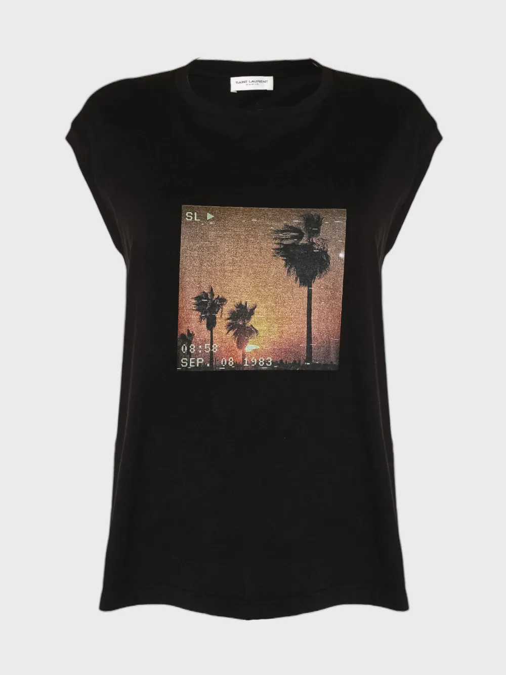 Футболка Saint Laurent выполнена из мягкого хлопка черного цвета с оригинальным принтом на груди. Дизайн вдохновлен ретро-фотографией заката с пальмами и датой "08:58, SEP. 08 1983", что придает изделию ностальгический и современный стиль одновременно. Модель дополнена круглым вырезом и короткими рукавами, обеспечивая комфортную посадку. Качественная печать и премиальный материал делают эту футболку идеальным выбором для тех, кто ценит сочетание утонченности и актуальных трендов.