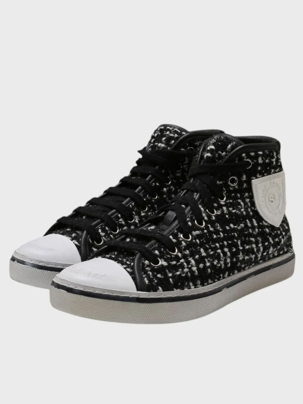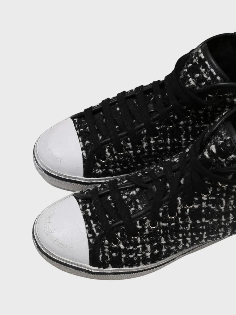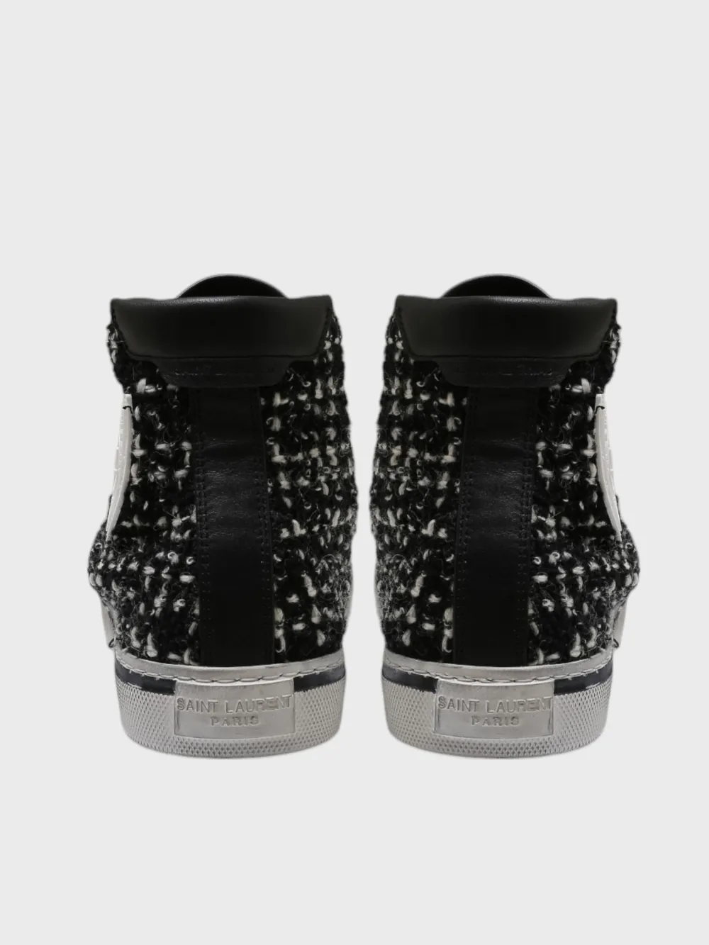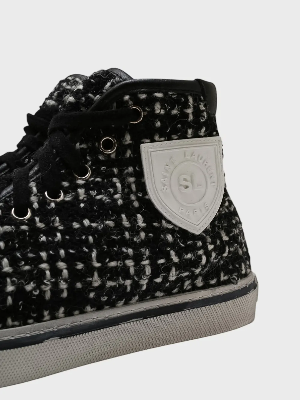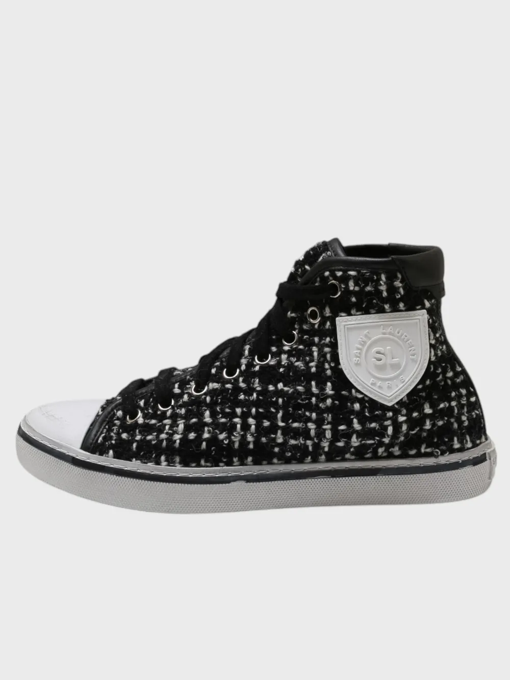 Кеды Saint Laurent выполнены из черно-белой фактурной ткани с эффектом пайеток, что придает модели современный и роскошный вид. Модель дополнена металлическими кольцами на шнурках, которые создают контрастный акцент. Белые вставки на язычке и подошве добавляют легкость и баланс дизайну. Тщательная работа над деталями — от логотипа на язычке до вытесненного названия бренда на подошве — подчеркивает высокое качество исполнения. Кеды идеально сочетаются как с повседневным, так и с вечерним гардеробом, обеспечивая комфорт и стильный внешний вид.