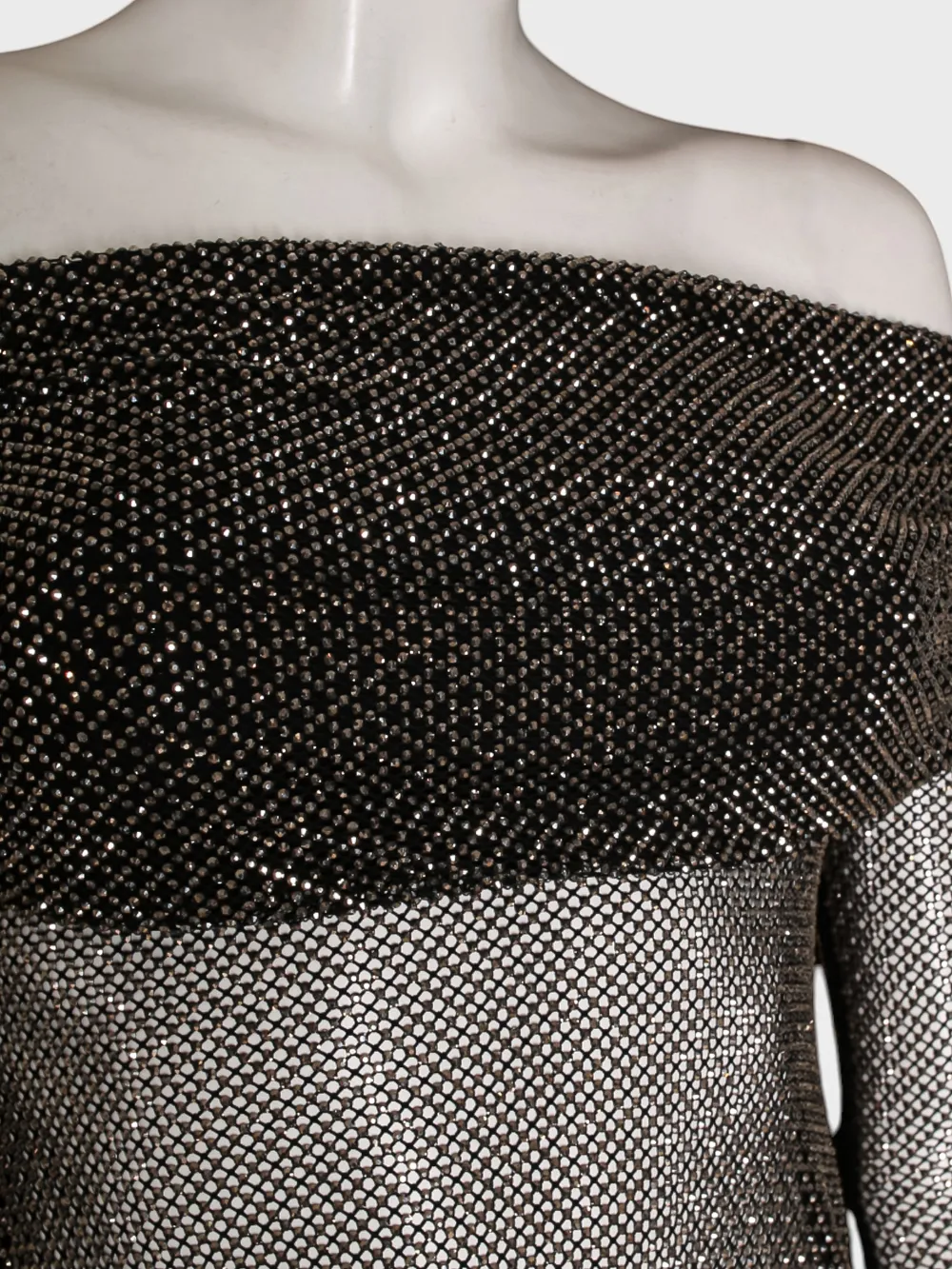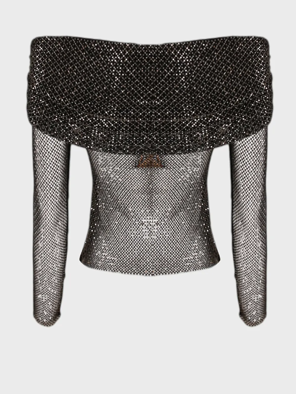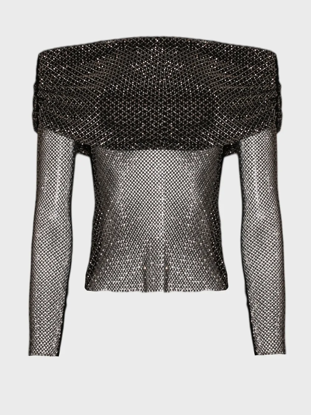 Кофта Self-Portrait выполнена из фактурной ткани с металлическим блеском, создающим эффект переливающихся бликов. Модель имеет облегающий силуэт, подчеркивающий фигуру, и декорирована контрастным верхом с геометрическим узором. Длинные рукава и округлый вырез добавляют элегантности, делая кофту идеальным выбором для вечерних выходов или особенных мероприятий.