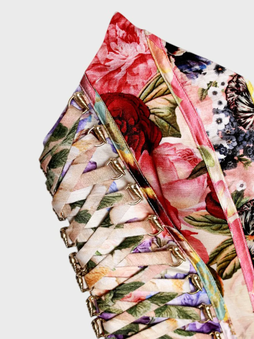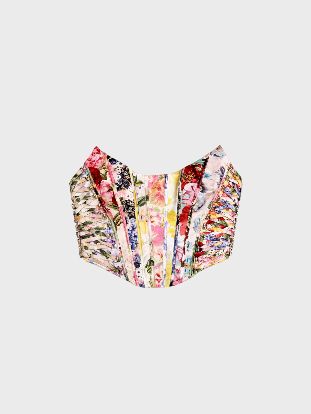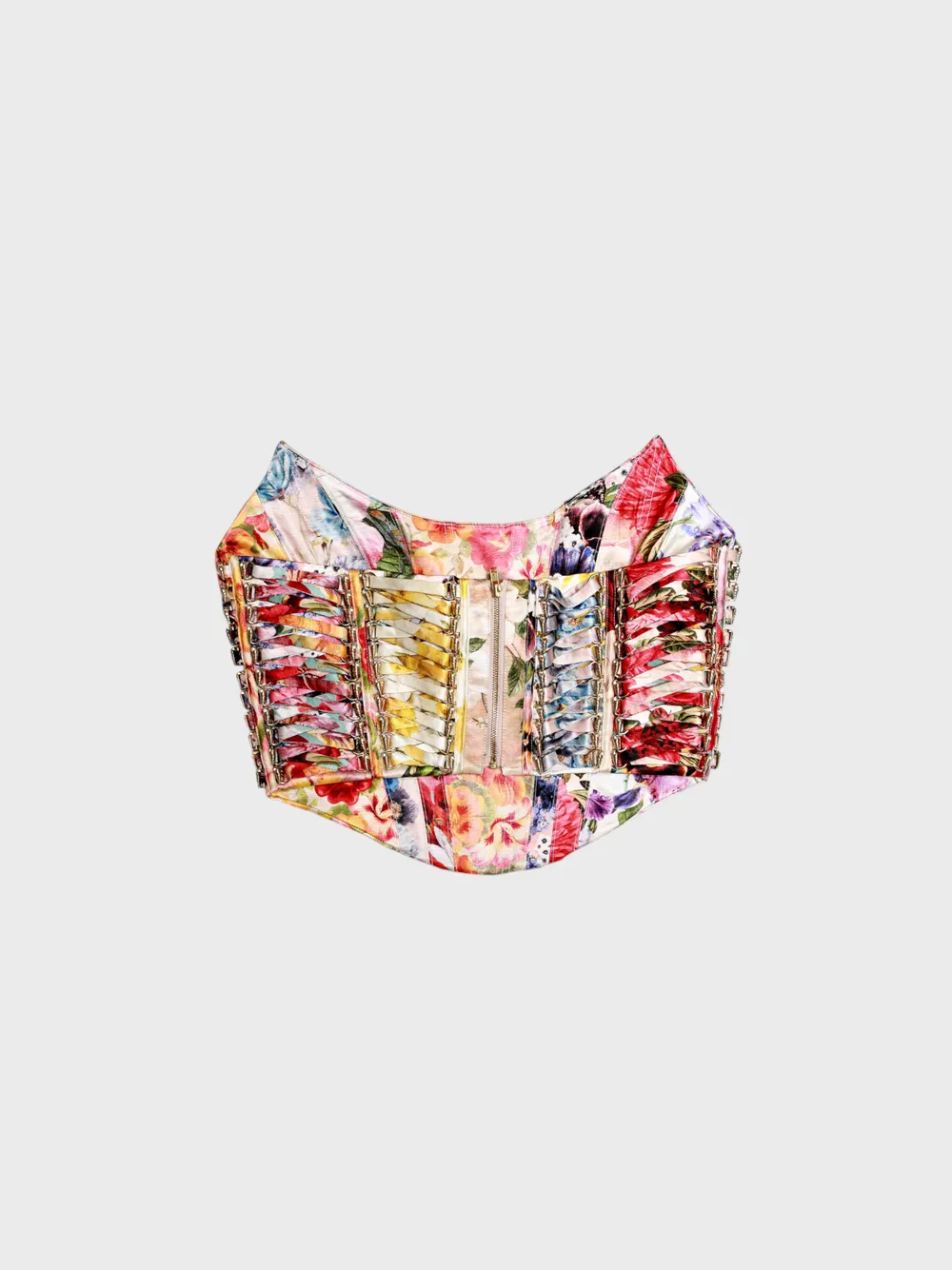 Корсет выполнен из шёлковой ткани с ярким многоцветным цветочным принтом в стиле пэчворк, сочетает современный дизайн и классическую силуэтную форму; усиленная конструкция с металлической застёжкой и декоративными элементами подчёркивает роскошь и индивидуальность — эксклюзивный аксессуар для смелого образа.