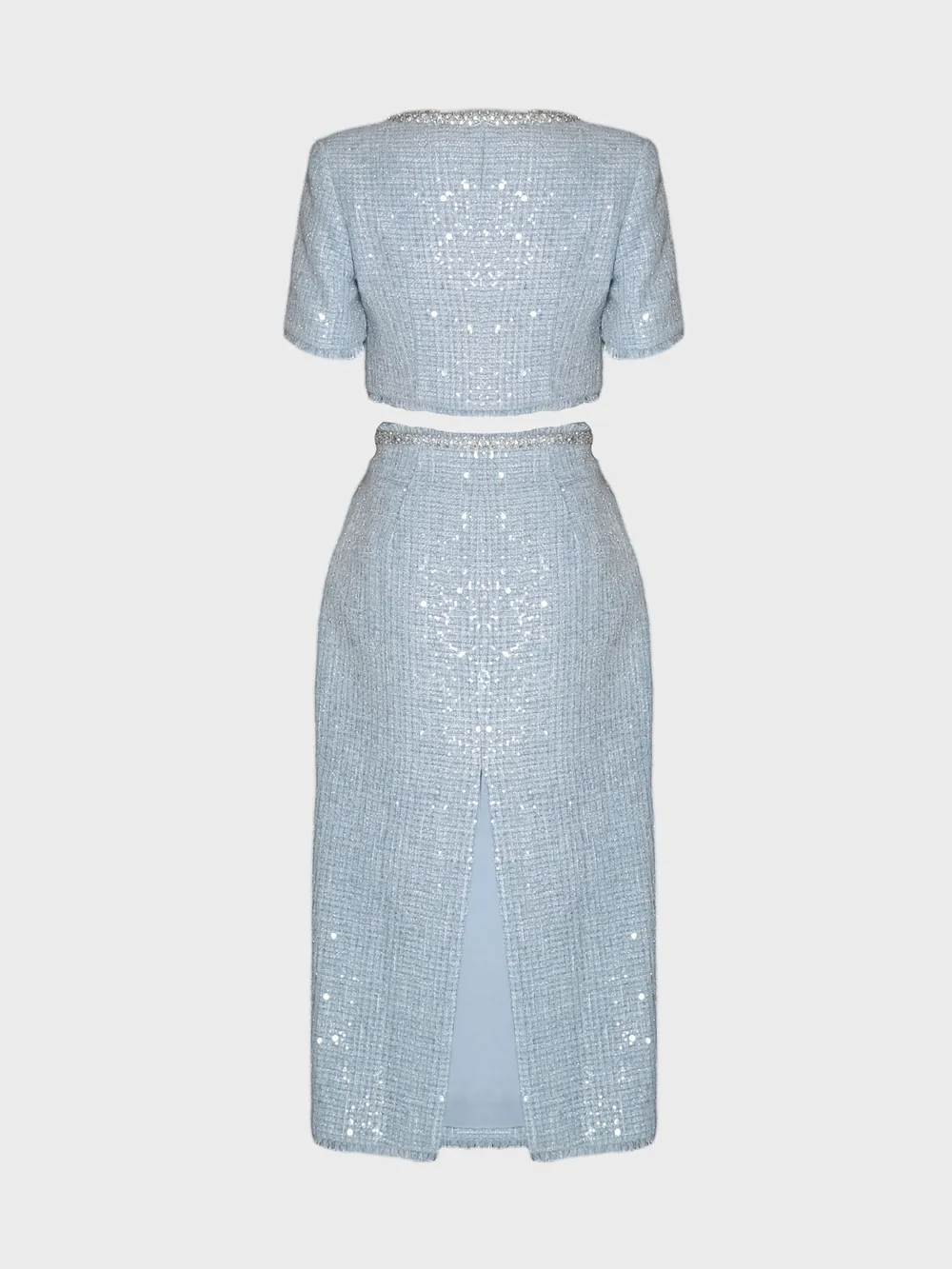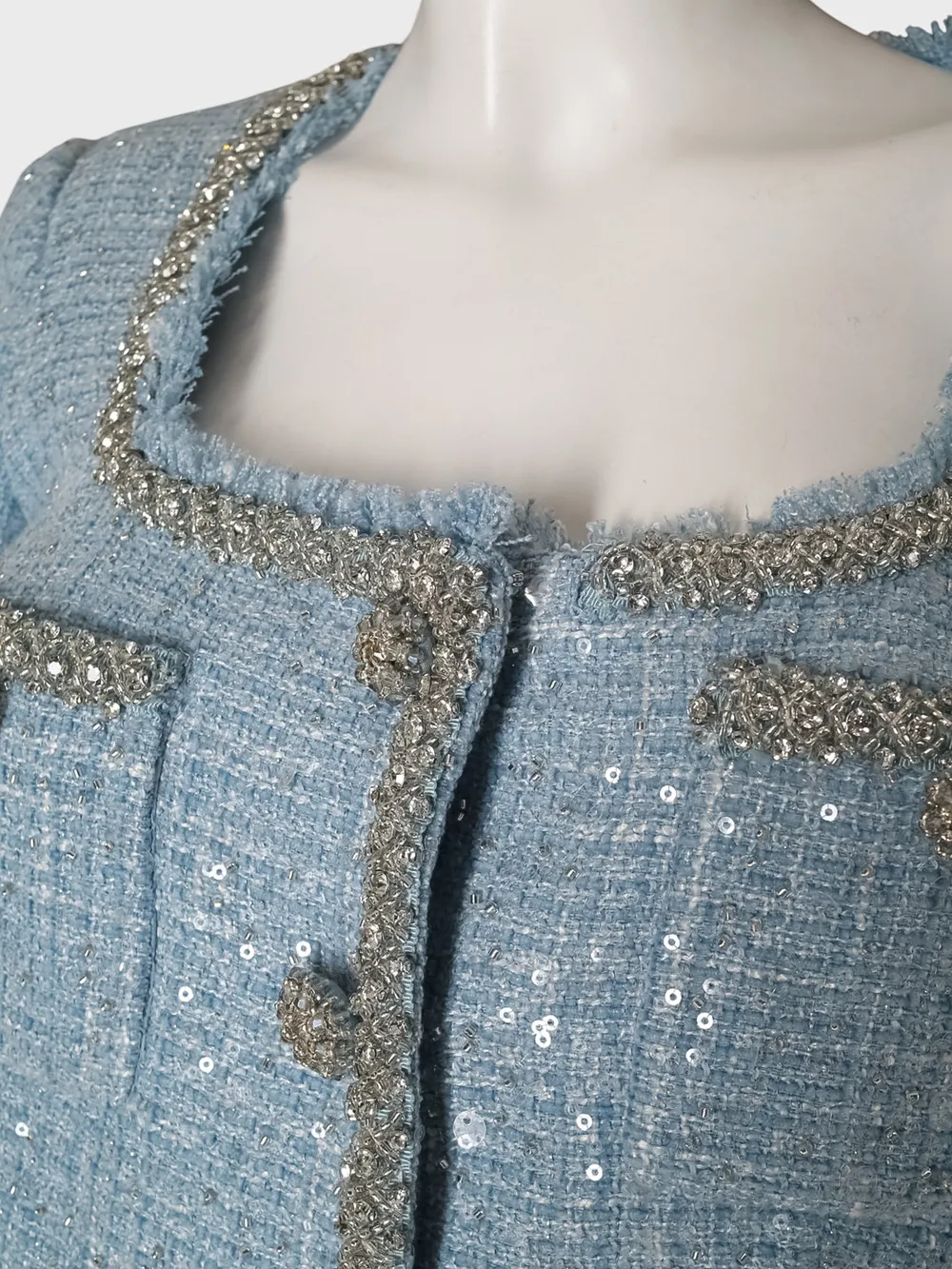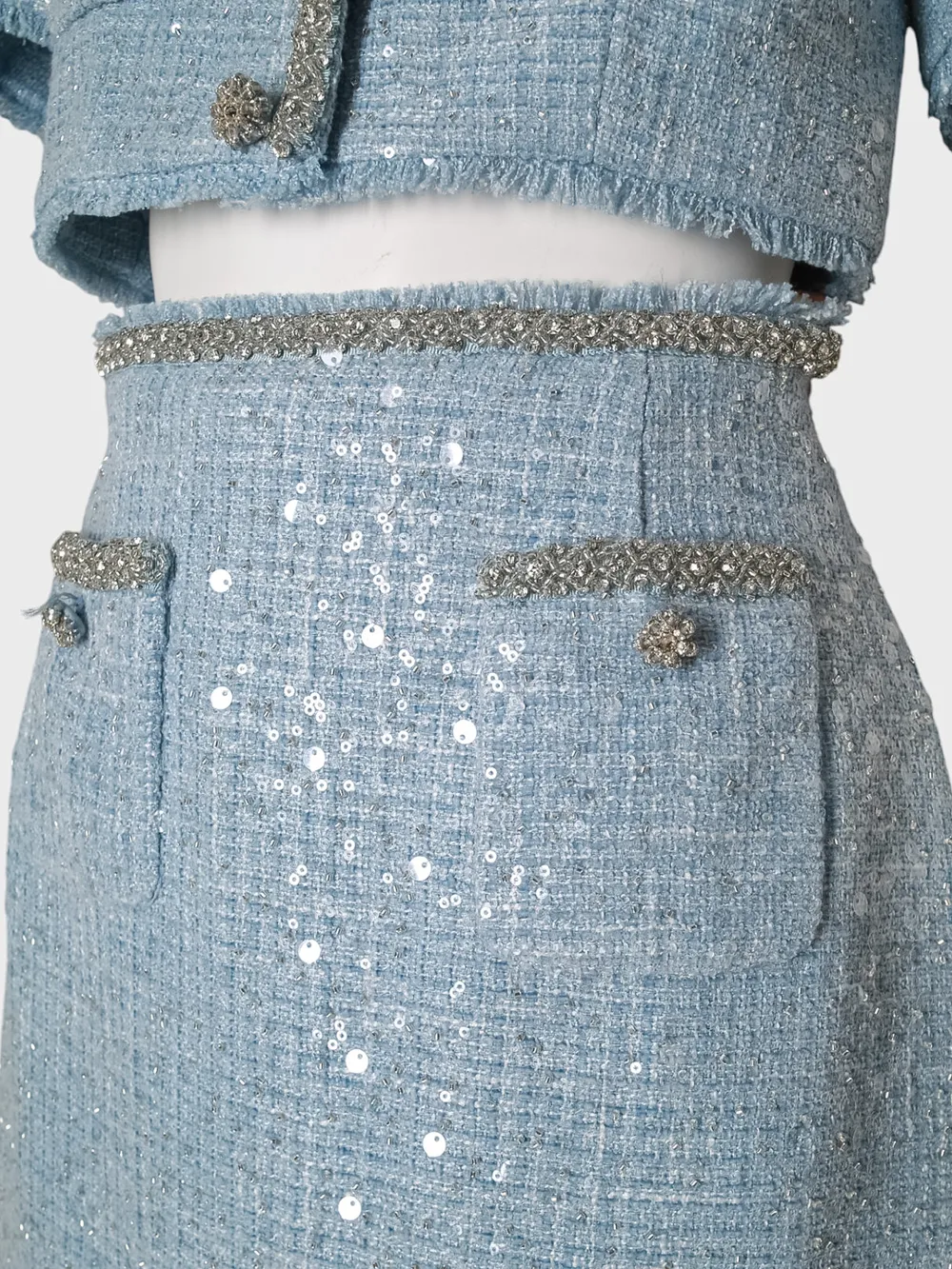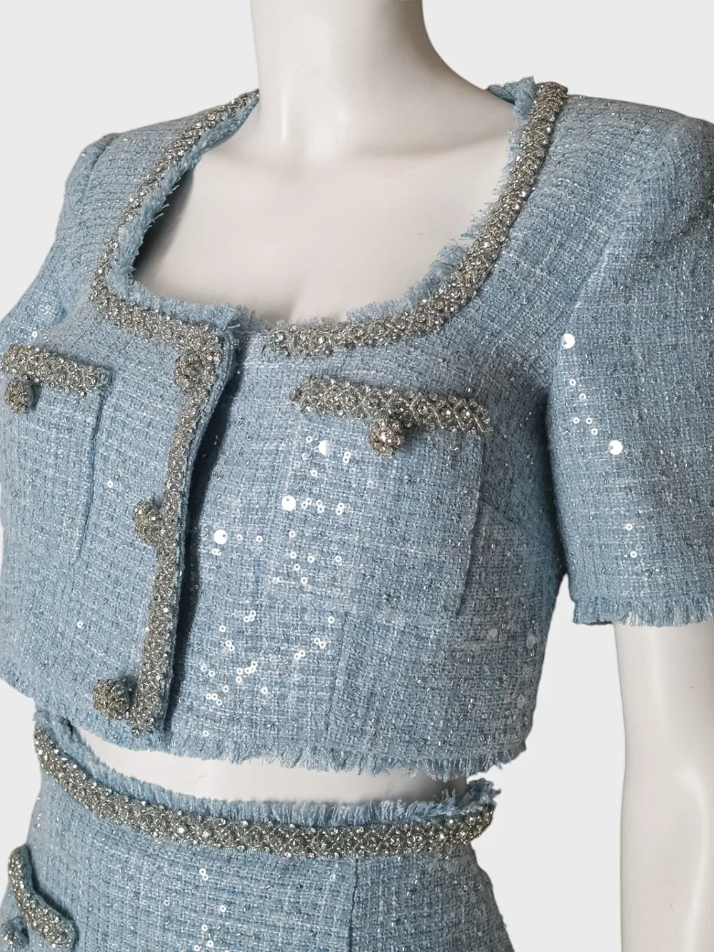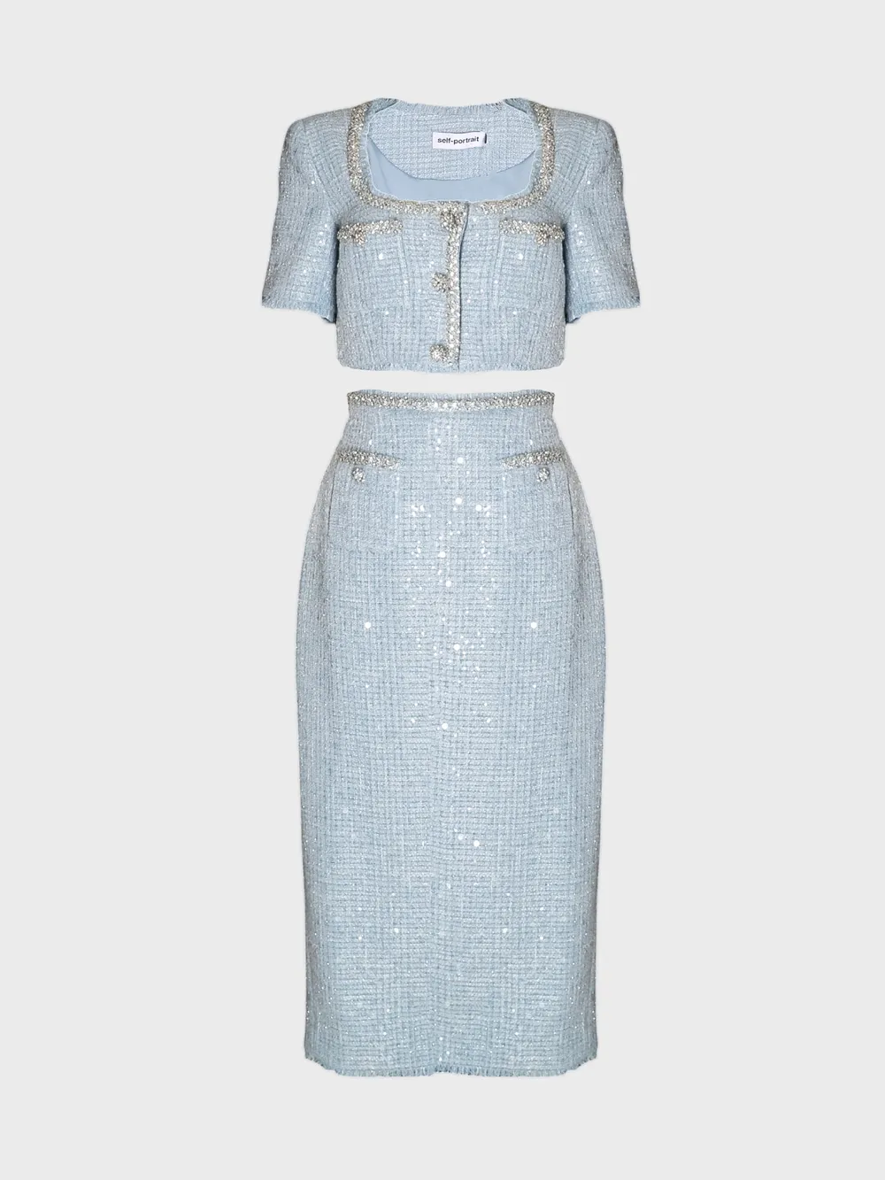Костюм Self-Portrait состоит из двух предметов: жакета и юбки, выполненных из качественного голубого материала с блестками. Жакет дополнен короткими рукавами, декоративными элементами в виде бусин и металлической застежкой. Юбка прямого кроя с высокой талией, также украшена блестками и декоративными деталями. Комплект отличается элегантным дизайном и идеально подходит для вечерних мероприятий или особенных случаев.