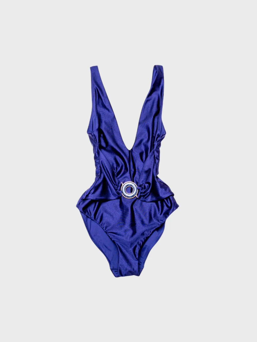 Купальник Zimmermann выполнен из качественного темно-синего материала с глубоким V-образным вырезом. Модель дополнена декоративным элементом в виде золотого кольца на талии, который добавляет элегантности и акцента. Простой дизайн и комфортная посадка делают купальник идеальным выбором для пляжного отдыха или как стильный аксессуар в летнем гардеробе.