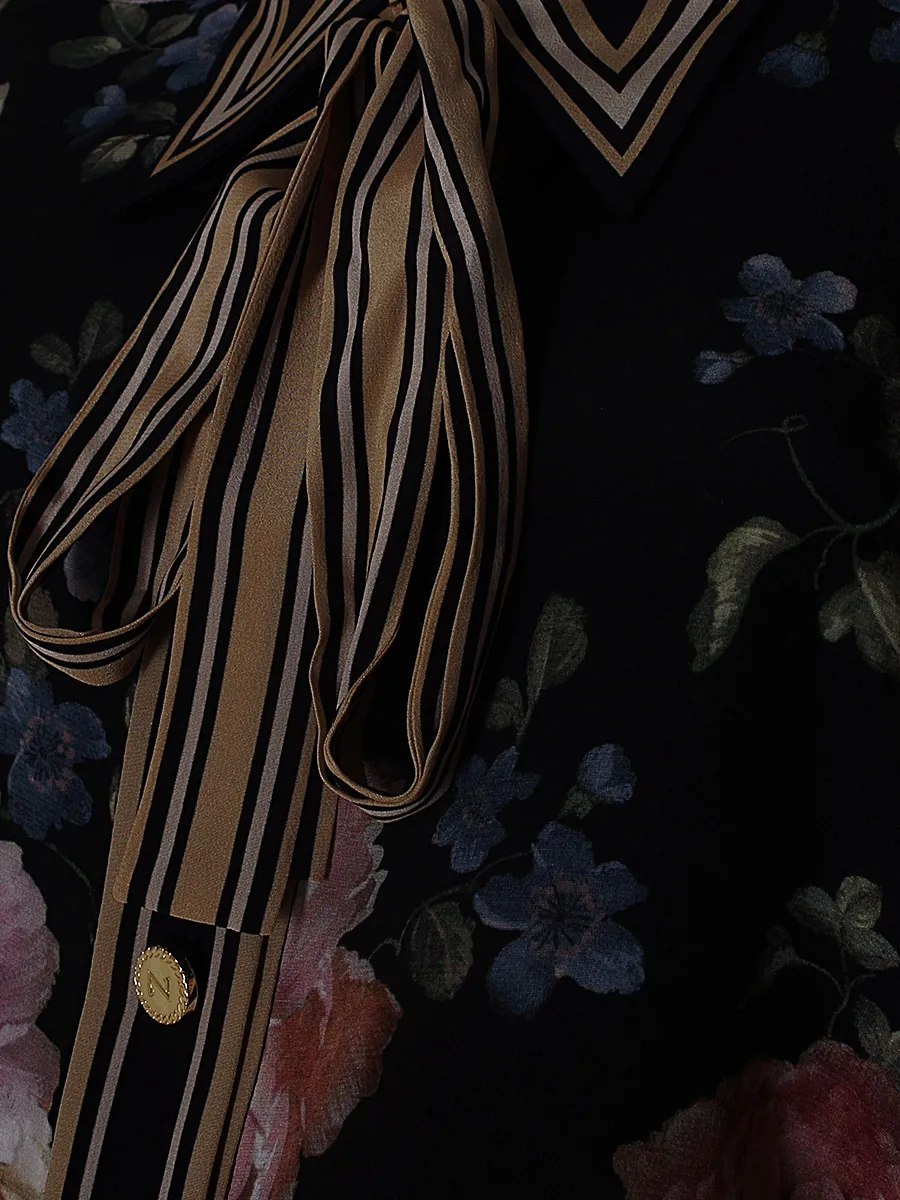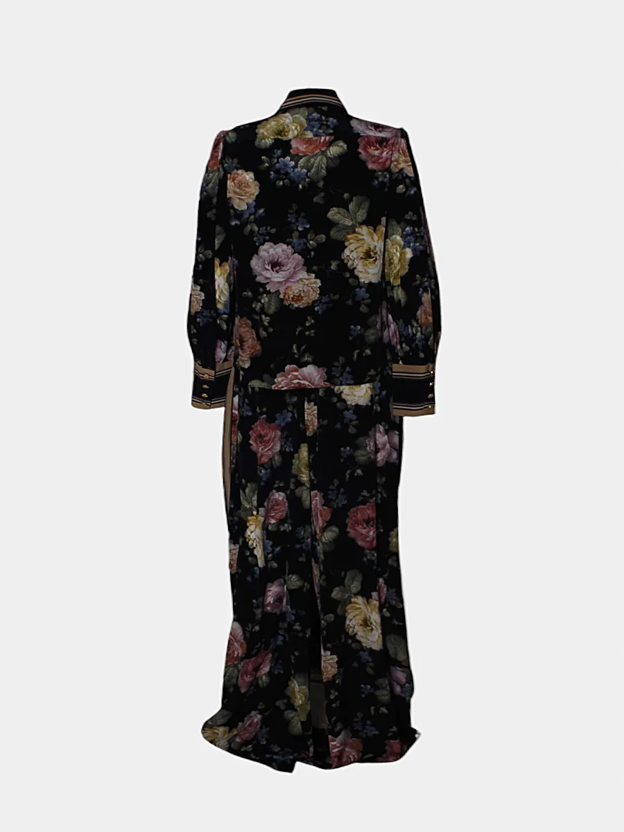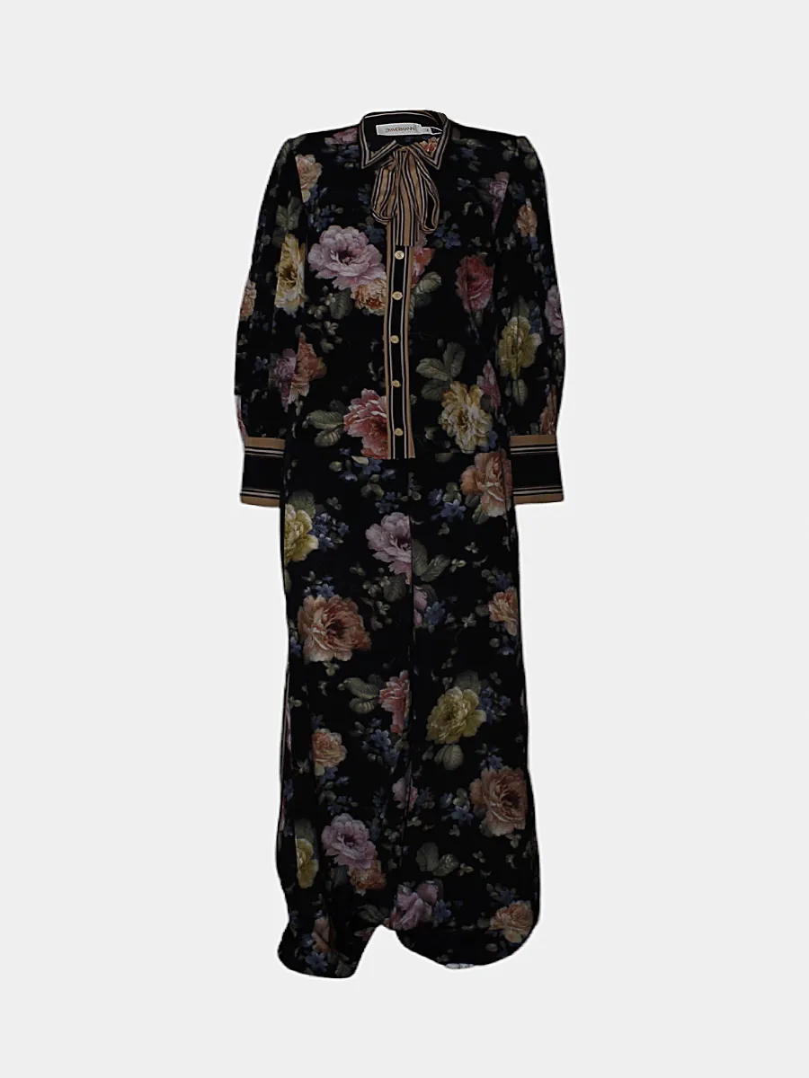 Пижамный костюм Zimmermann из шелковистой ткани с роскошным цветочным принтом на темном фоне, дополнен элегантной полосатой отделкой воротника и манжет, а также декоративной лентой-бабочкой; модель с застежкой на пуговицы и свободным кроем — воплощение утончённого комфорта и женственного стиля.