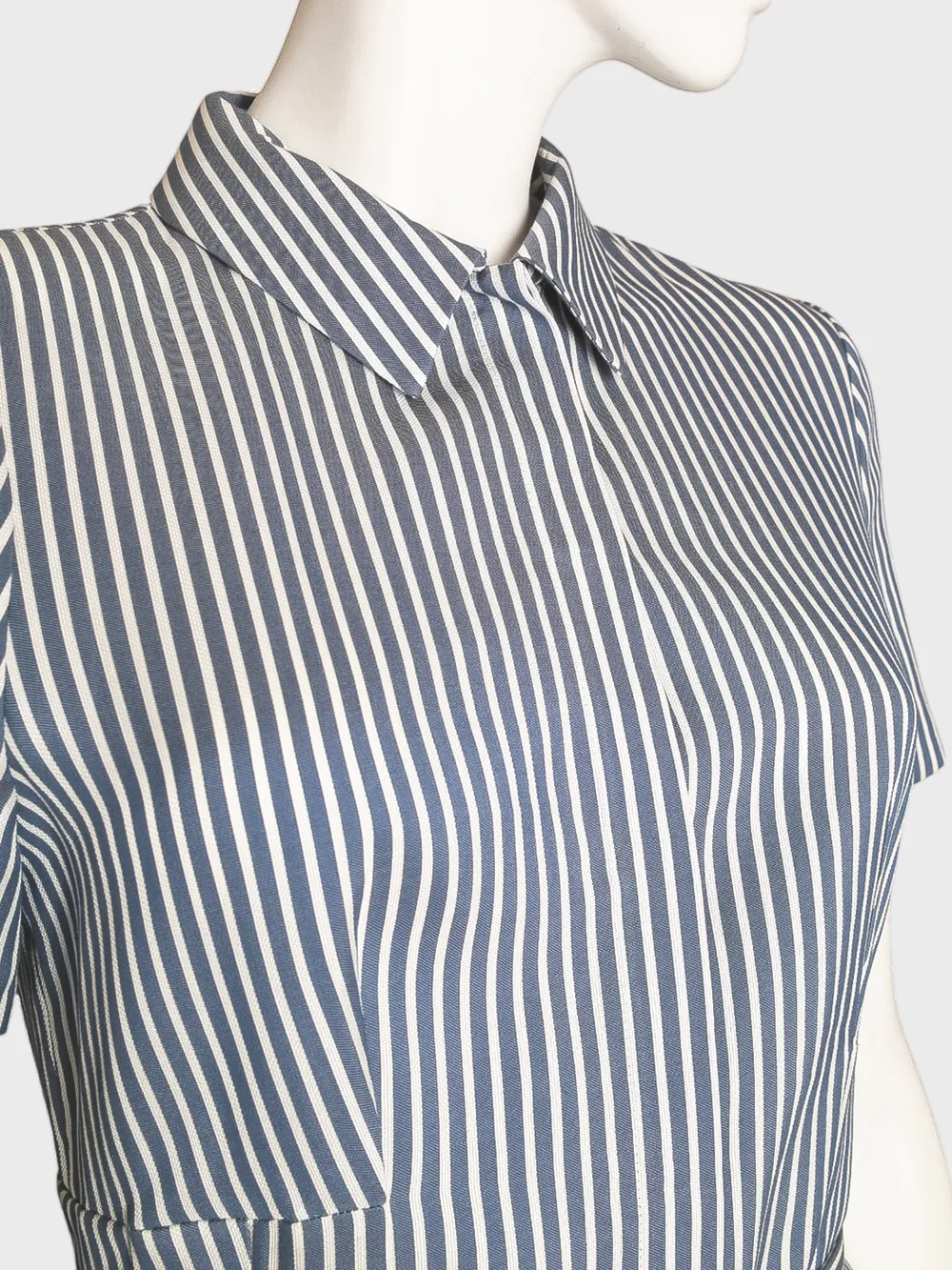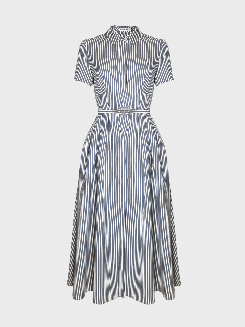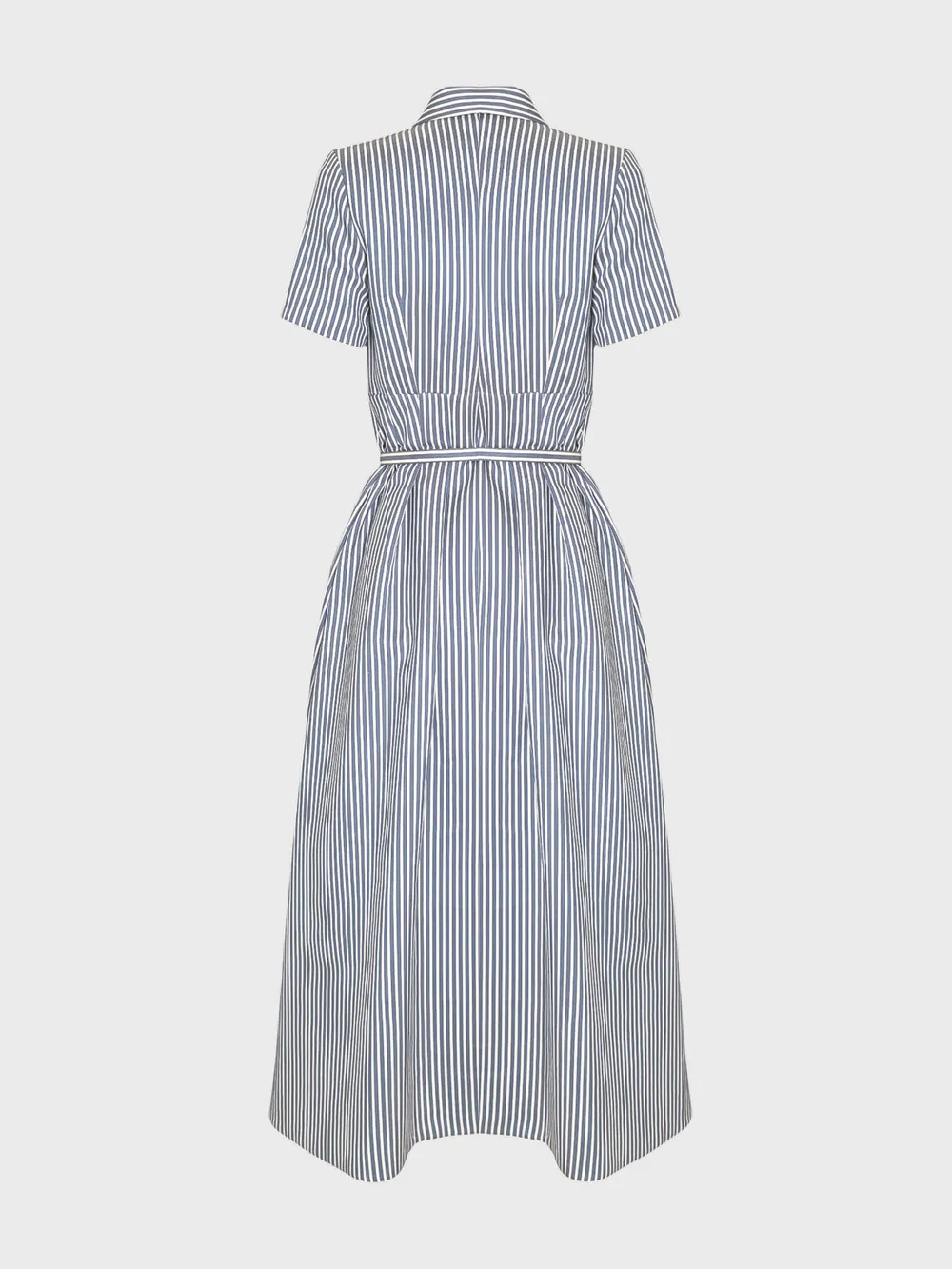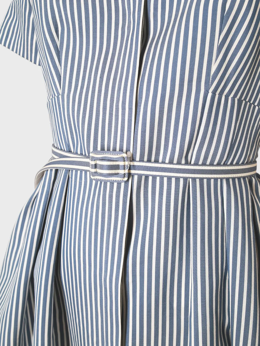 Платье выполнено из легкой ткани с вертикальной полосой в сине-белых тонах. Модель имеет прямой крой, короткие рукава и классический воротник, дополненные поясом для акцента фигуры. Платье сочетает элегантность и комфорт, идеально подходящее для повседневного и делового стиля.