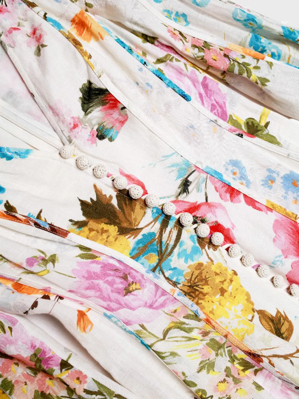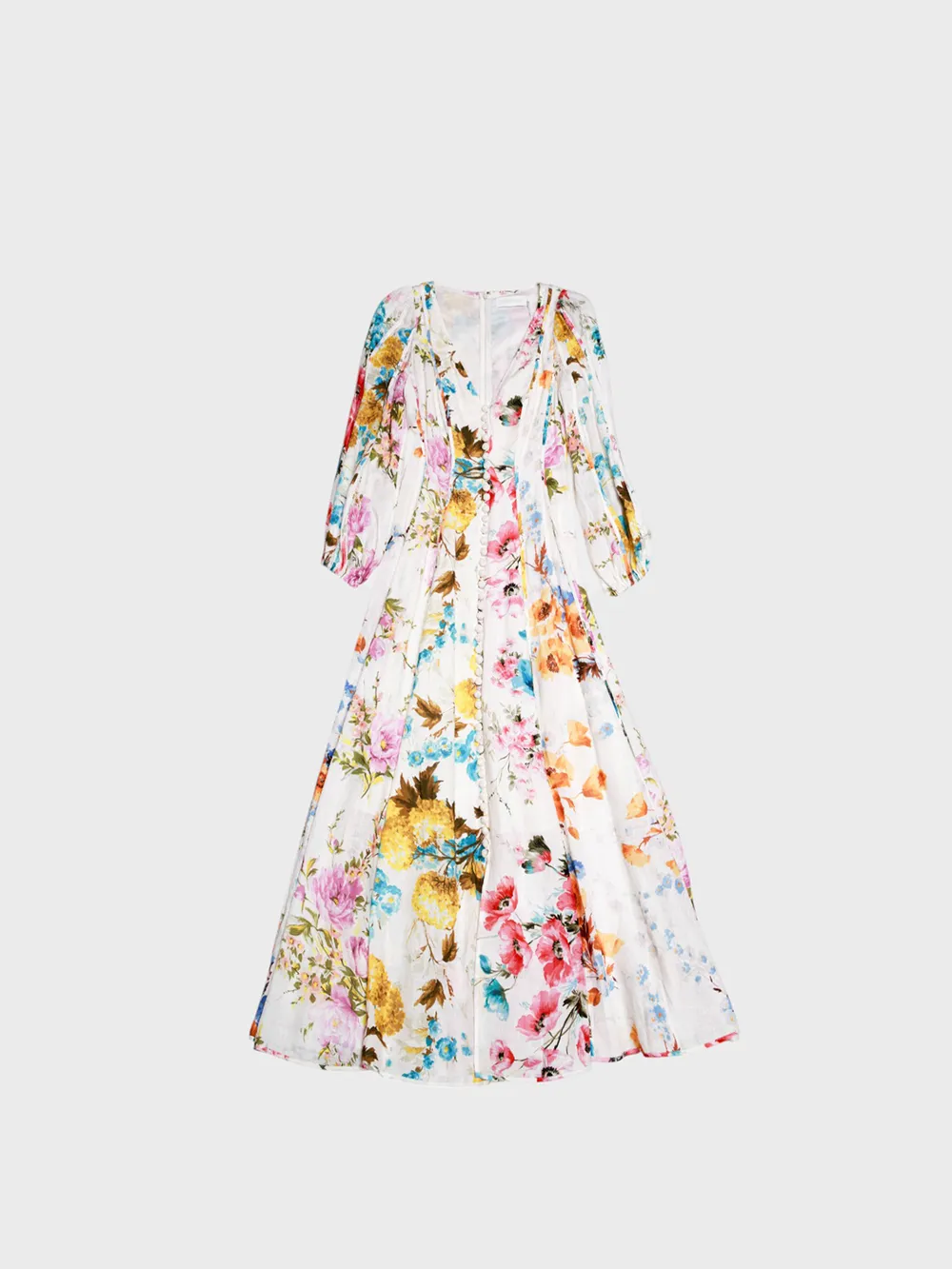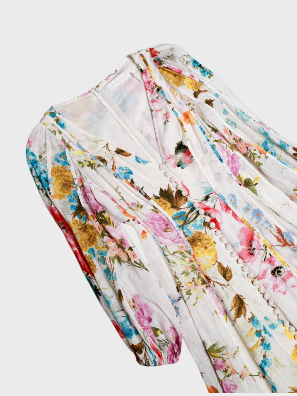Платье Zimmermann выполнено из лёгкой ткани кремового цвета с ярким многоцветным цветочным принтом в стиле акварели; приталенный крой, глубокий V-образный вырез, застёжка на пуговицы и длинные расклешённые рукава подчёркивают романтичность и женственность — идеальный выбор для летнего или свадебного образа.