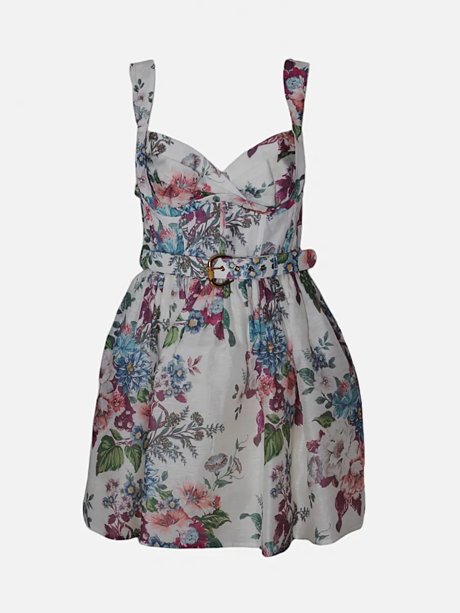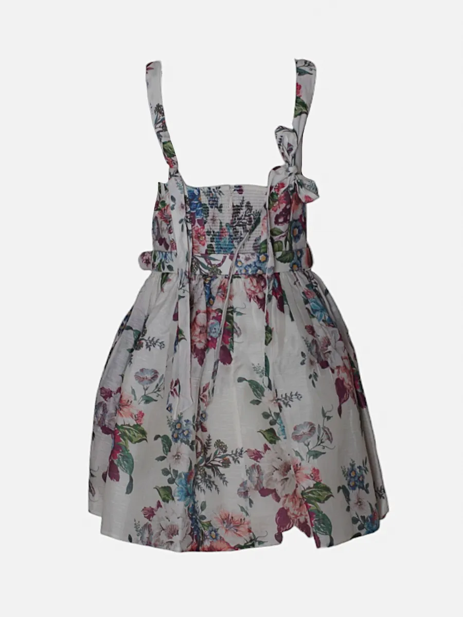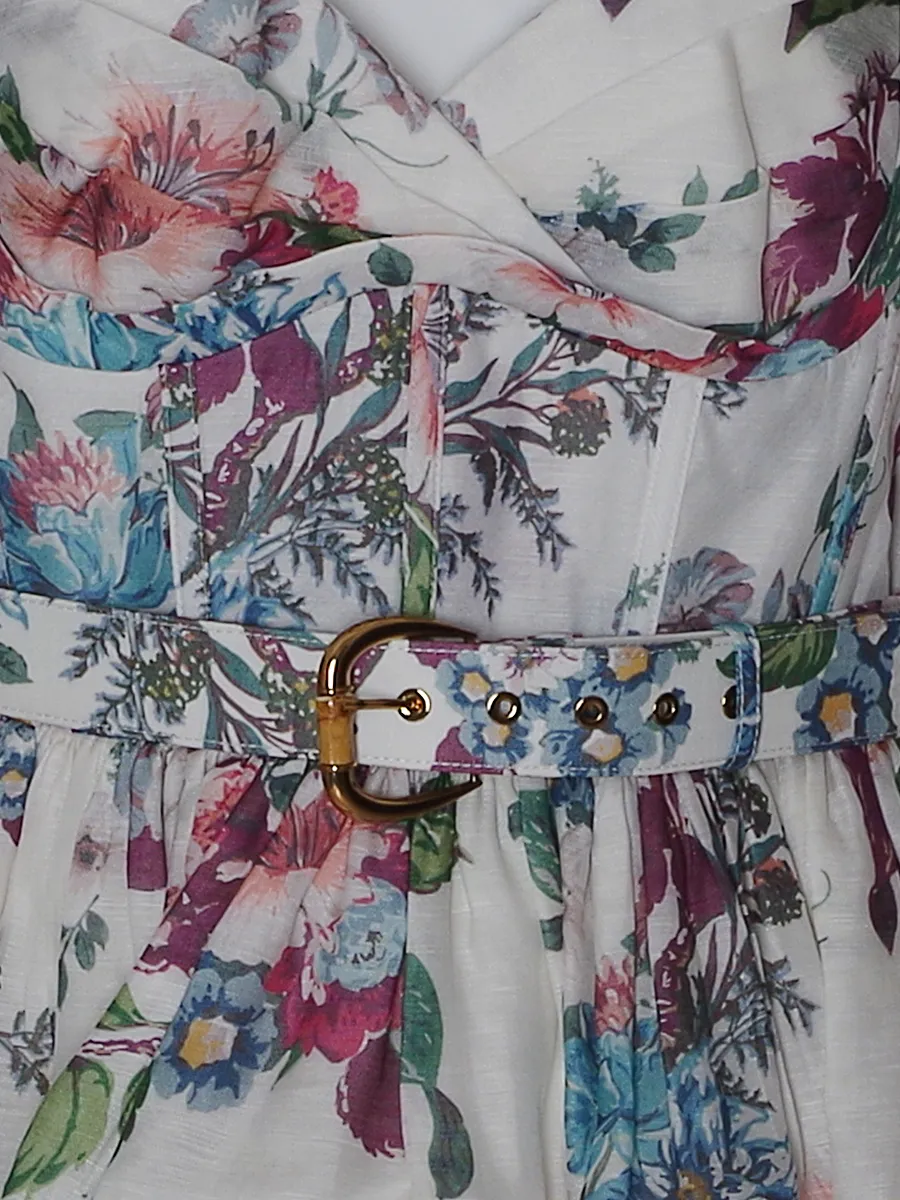 Платье Zimmermann из легкой ткани с ярким цветочным принтом на белом фоне — сочетание романтики и стиля. Модель с открытыми плечами, глубоким V-образным вырезом и пышной юбкой подчеркивает женственность. Узкий пояс с золотистой пряжкой акцентирует талию, добавляя изысканности. Детали: завязки на бретелях и складки в лифе придают объем и комфорт. Идеальный выбор для летних выходов и повседневного образа с ноткой элегантности.