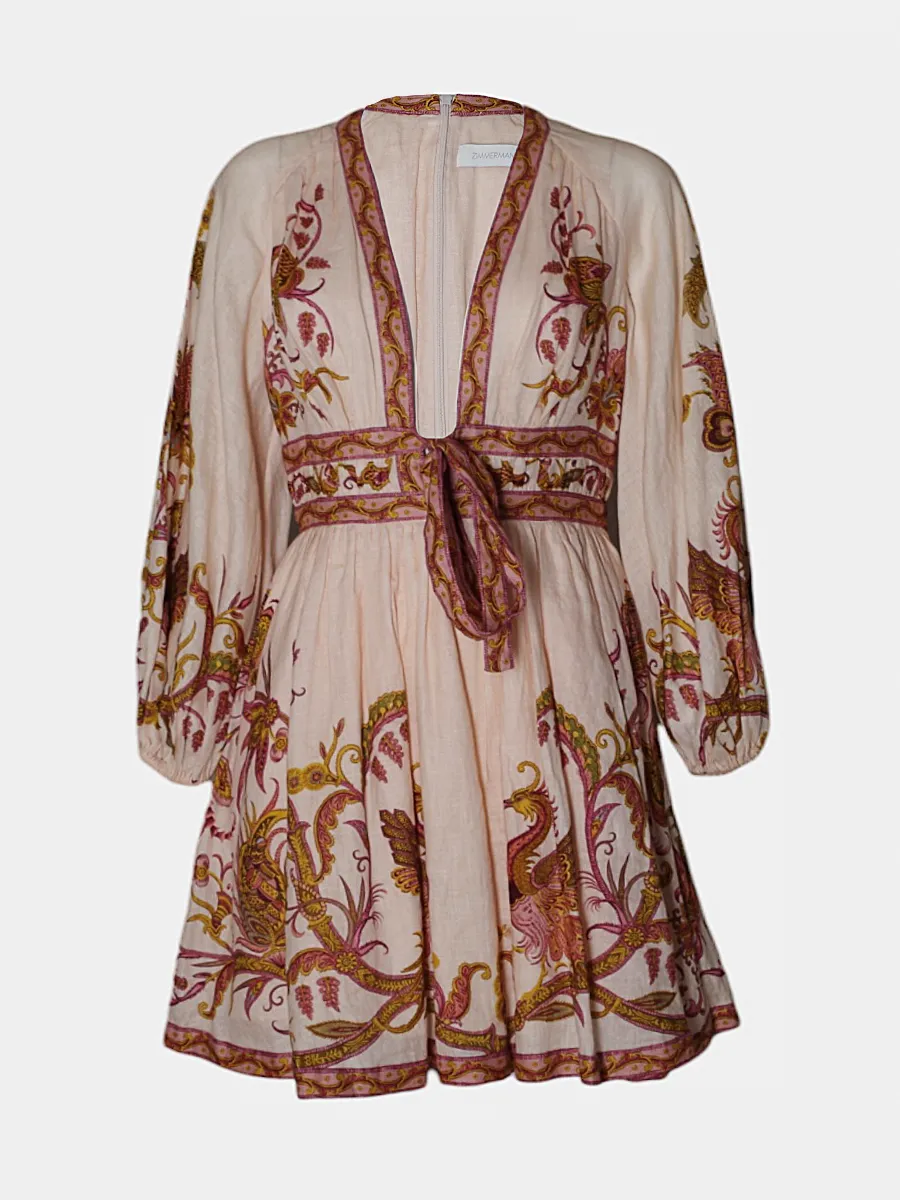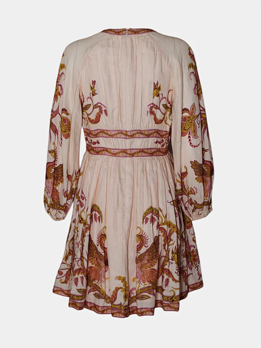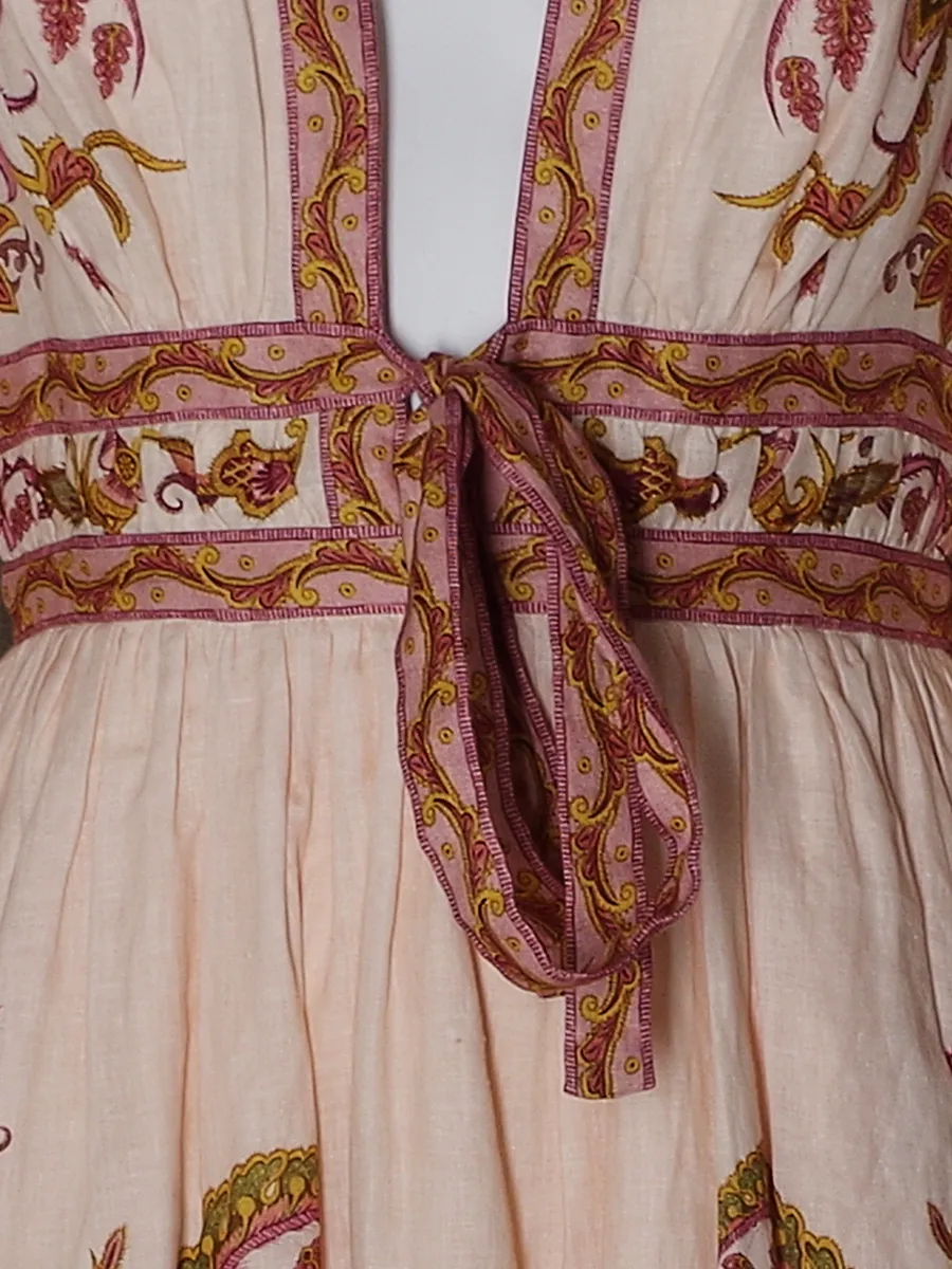 Платье Zimmermann выполнено из лёгкой ткани нежно-бежевого оттенка с ярким этническим принтом в стиле пейсли, сочетает романтичный крой и богатую детализацию: глубокий V-образный вырез, длинные расклешённые рукава и пояс на завязках подчёркивают женственность — идеальный выбор для летнего или праздничного образа.