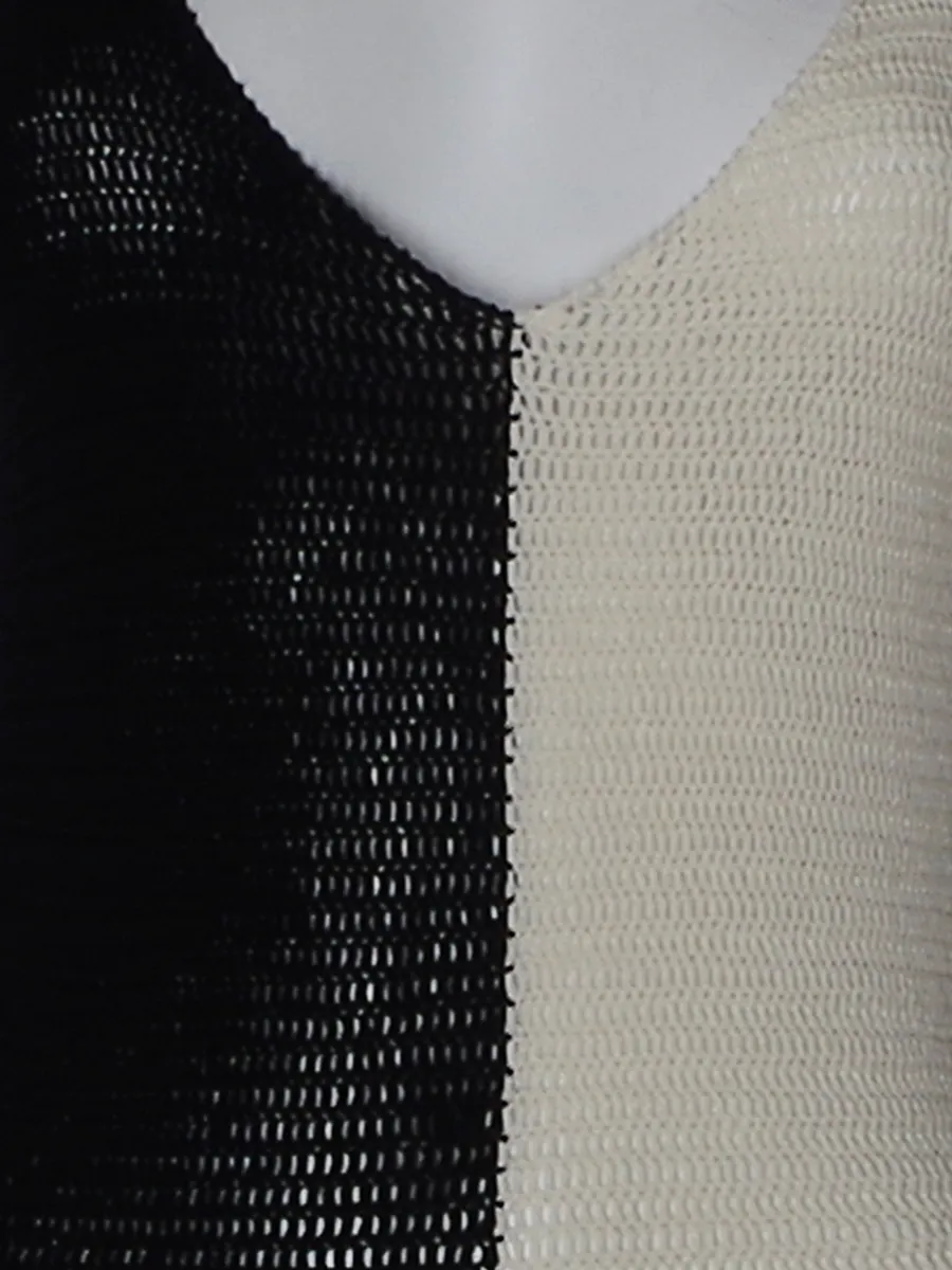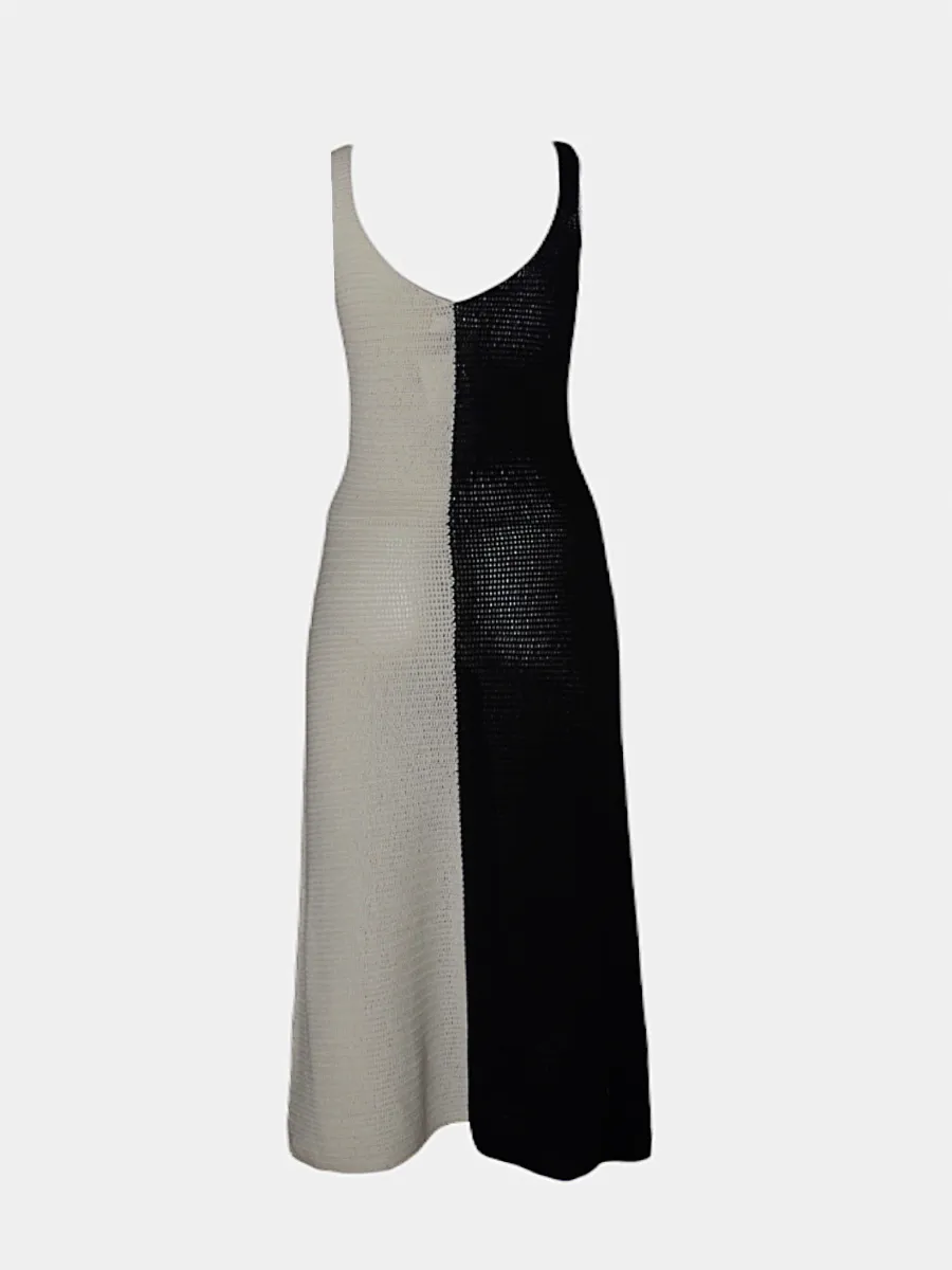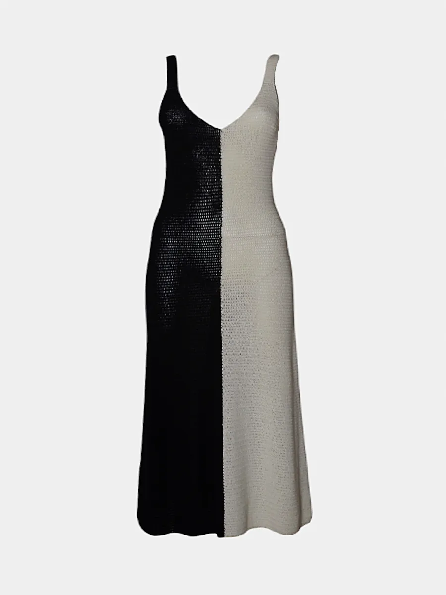 Платье Zimmermann выполнено из двух видов ткани: черной сетчатой и светло-серой фактурной — сочетание контраста и минимализма. Модель с тонкими бретелями, глубоким V-образным вырезом и прямым кроем подчеркивает силуэт. Детали: четкая линия раздела по центру и текстурный рисунок создают визуальный интерес. Идеальный выбор для вечернего образа или смелого повседневного стиля, где важна индивидуальность и качество исполнения.