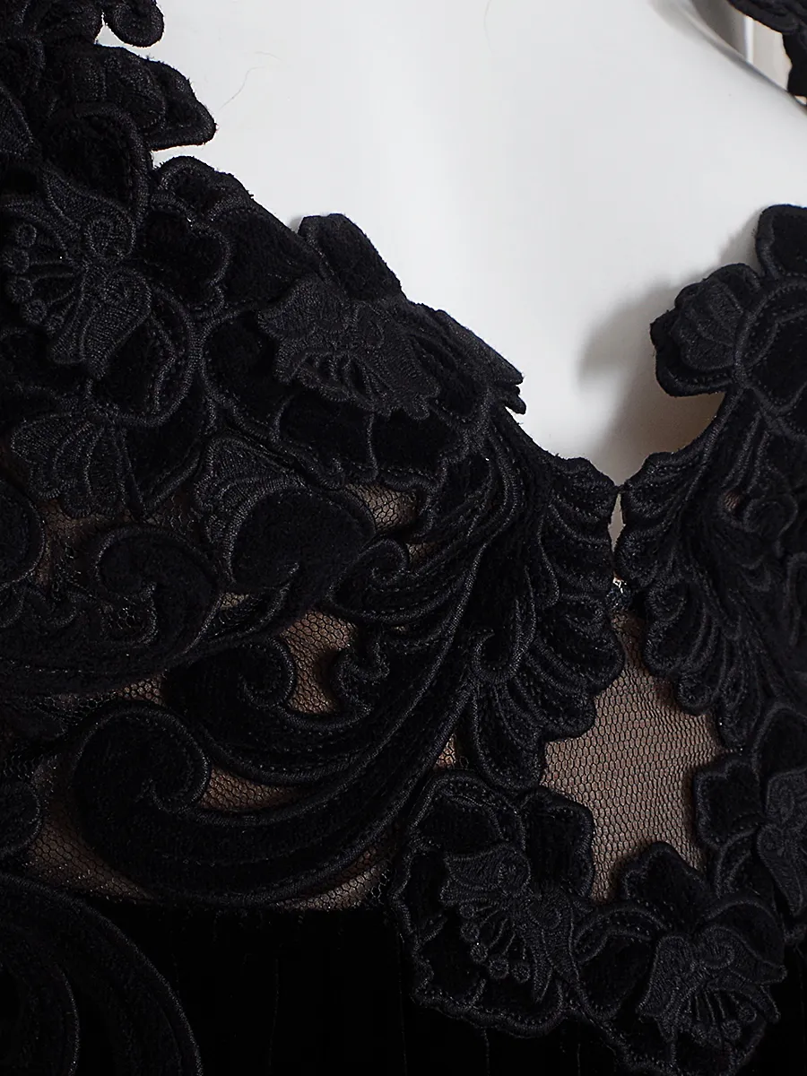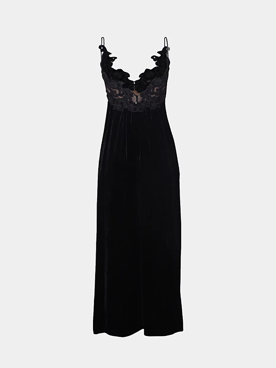 Платье Zimmermann выполнено из гладкого черного бархата с изысканной кружевной отделкой на лифе, сочетающей роскошь и чувственность. Модель с тонкими бретелями и глубоким V-образным вырезом подчеркивает женственность и элегантность — идеальный выбор для торжественных вечерних образов в духе австралийской утончённости.