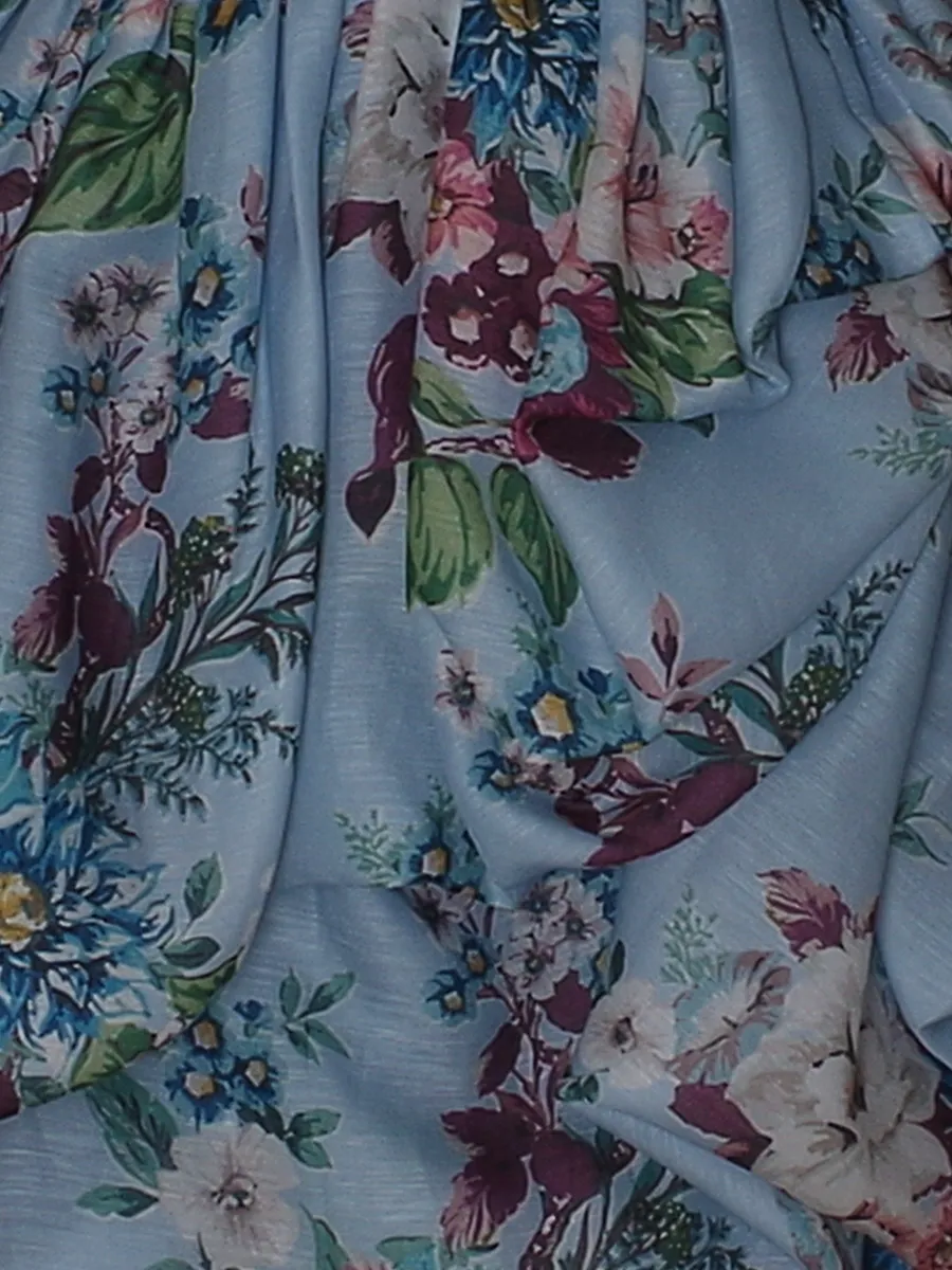 Платье Zimmermann из легкой ткани с нежным голубым фоном и насыщенным цветочным принтом — сочетание романтики и современного кроя. Модель с открытыми плечами, глубоким V-образным вырезом и асимметричной юбкой с драпировками создает эффект объема и движения. Утонченный силуэт подчеркивает женственность, а качественная отделка и текстура ткани подтверждают высокий уровень исполнения. Идеальный выбор для летних мероприятий и образов, где важна индивидуальность и стиль.