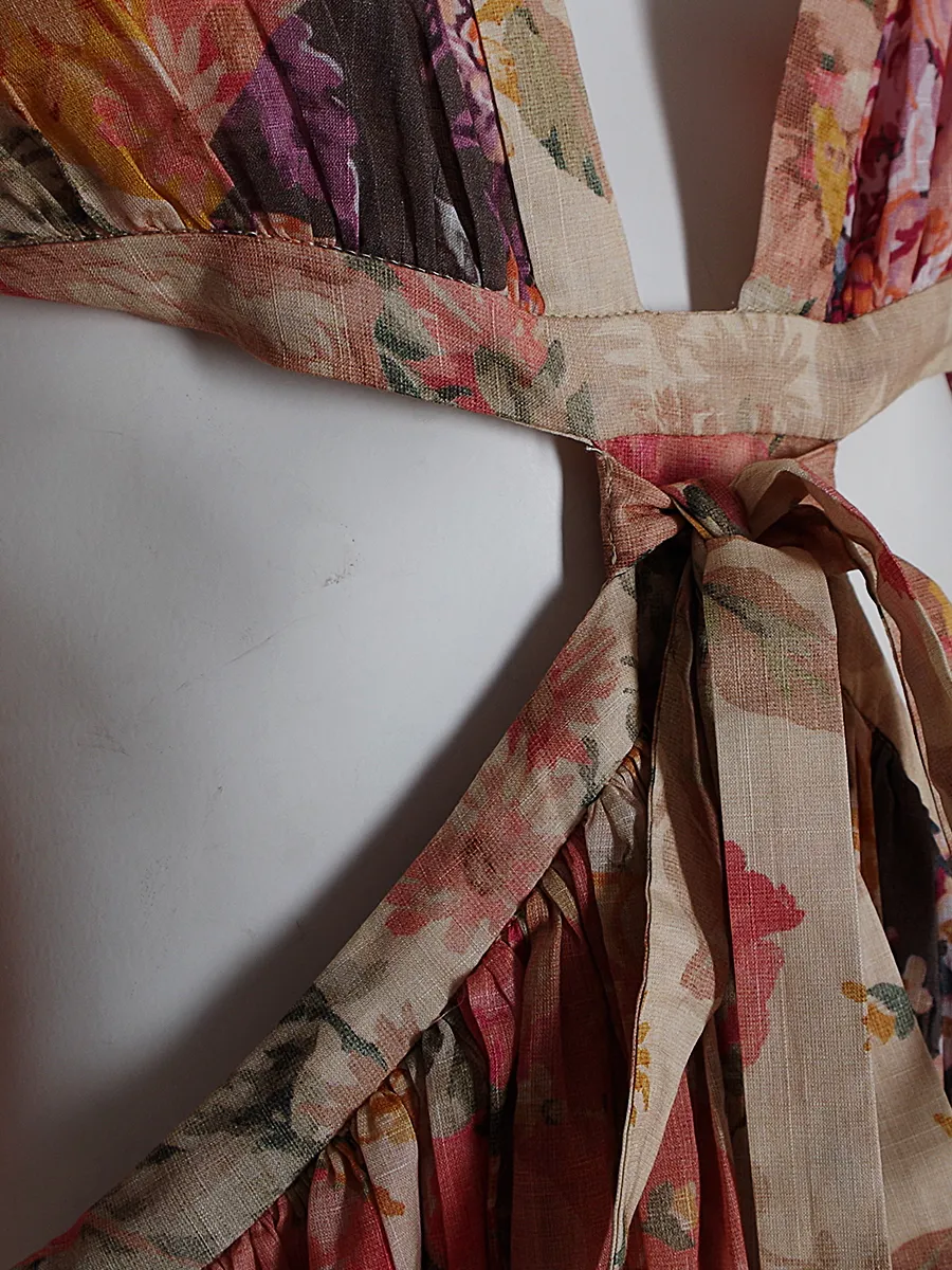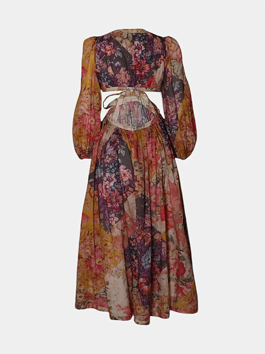 Платье Zimmermann выполнено из легкой ткани с богатым цветочным принтом в стиле коллажа — сочетание романтики и арт-экспрессии. Модель макси с глубоким V-образным вырезом, длинными пышными рукавами и поясом на талии подчеркивает женственность. Детали: завязка спереди и драпировка придают изделию объем и индивидуальность. Идеальный выбор для летних мероприятий, где важна уникальность и качество исполнения.