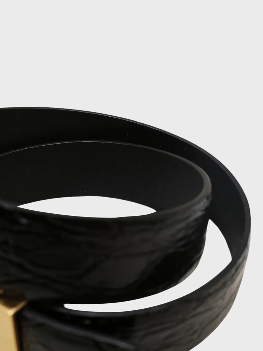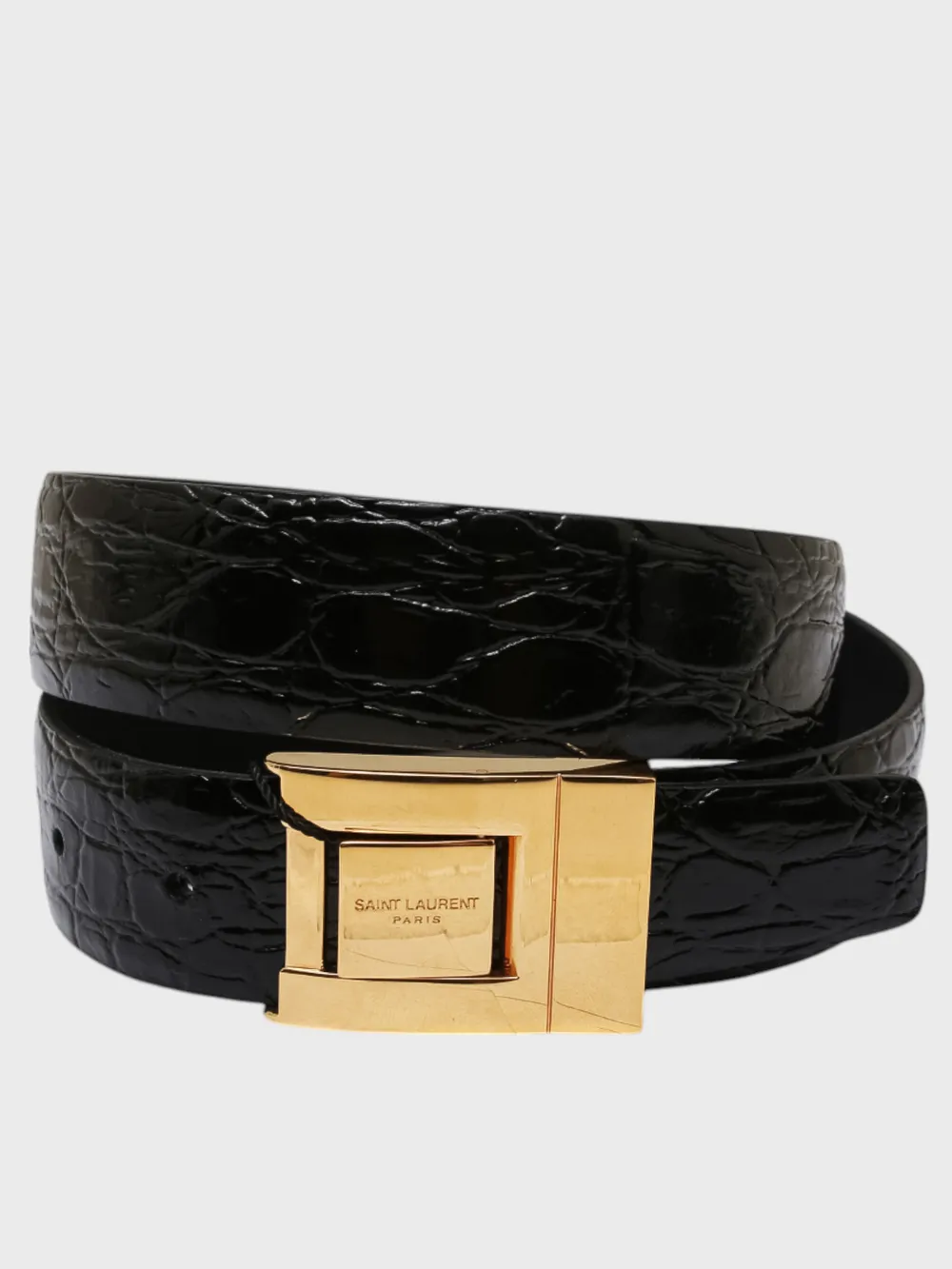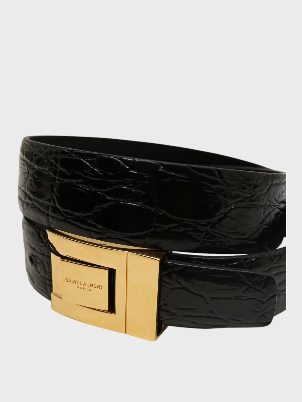 Ремень Saint Laurent выполнен из черной кожи с текстурой крокодила, дополненной золотистой металлической пряжкой в форме прямоугольника. Модель сочетает классический дизайн и современные акценты, создавая эффектный аксессуар для завершения делового или вечернего образа. Качественная отделка и безупречное исполнение подчеркивают высокий уровень брендовой роскоши.