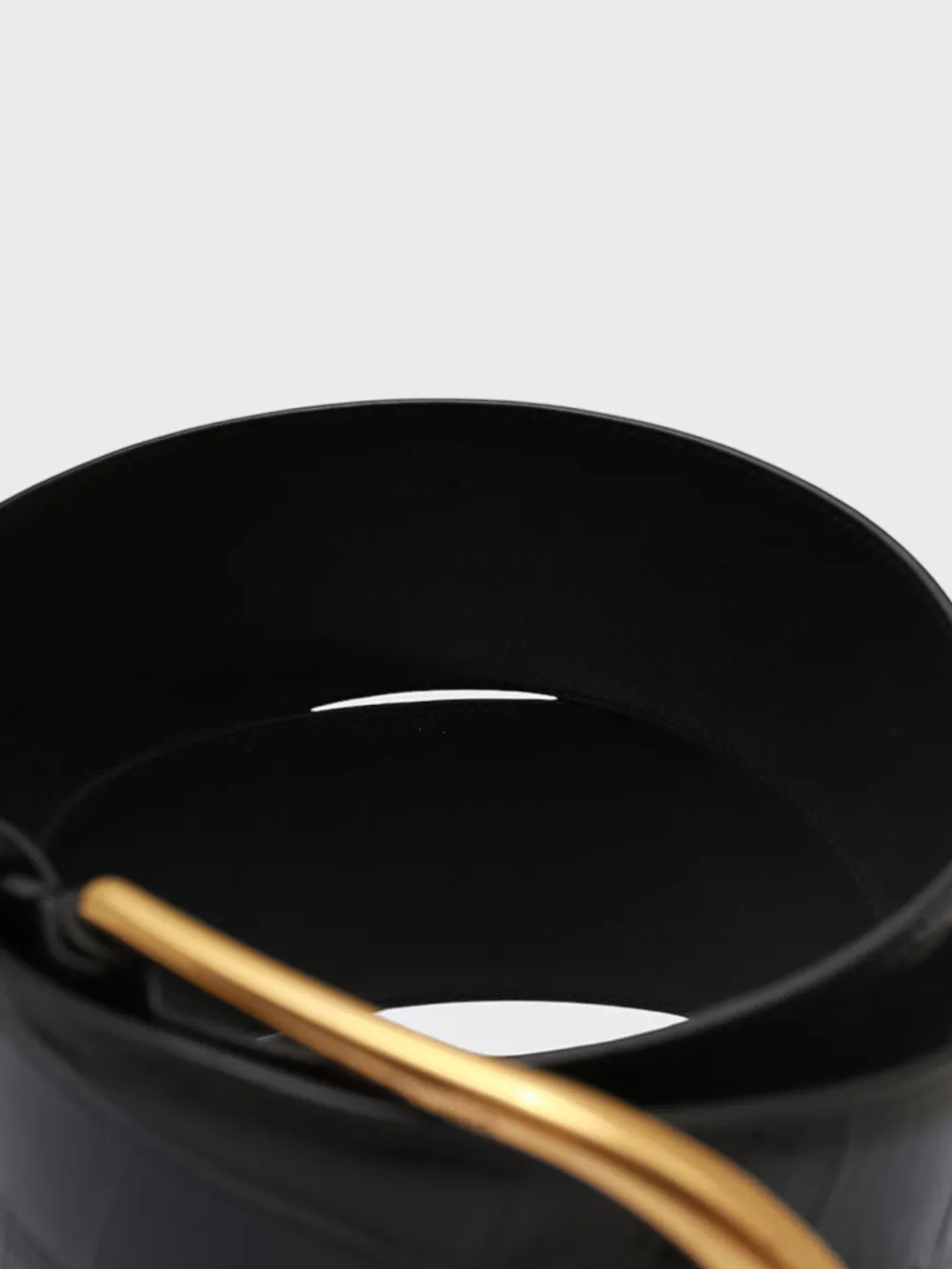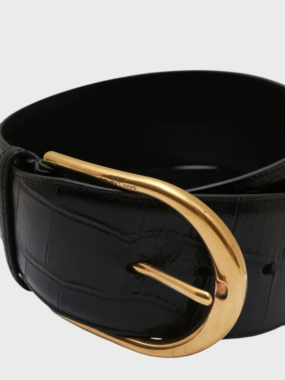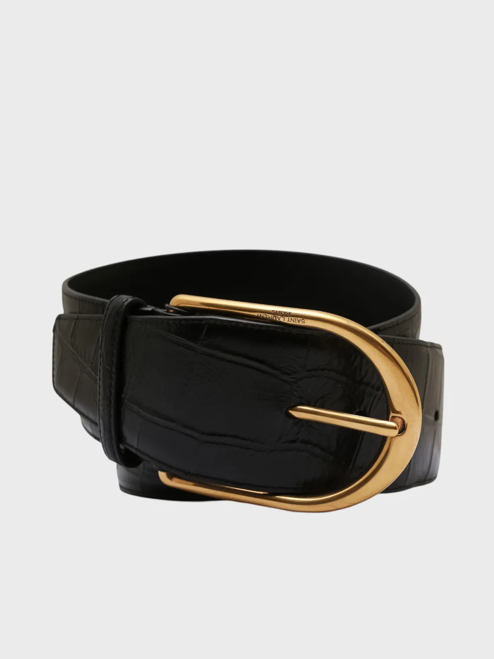 Ремень Saint Laurent выполнен из черной кожи с текстурой крокодила, дополненной золотистой металлической пряжкой в форме полумесяца. Модель сочетает классический дизайн и современные акценты, создавая эффектный аксессуар для завершения делового или вечернего образа. Качественная отделка и безупречное исполнение подчеркивают высокий уровень брендовой роскоши.