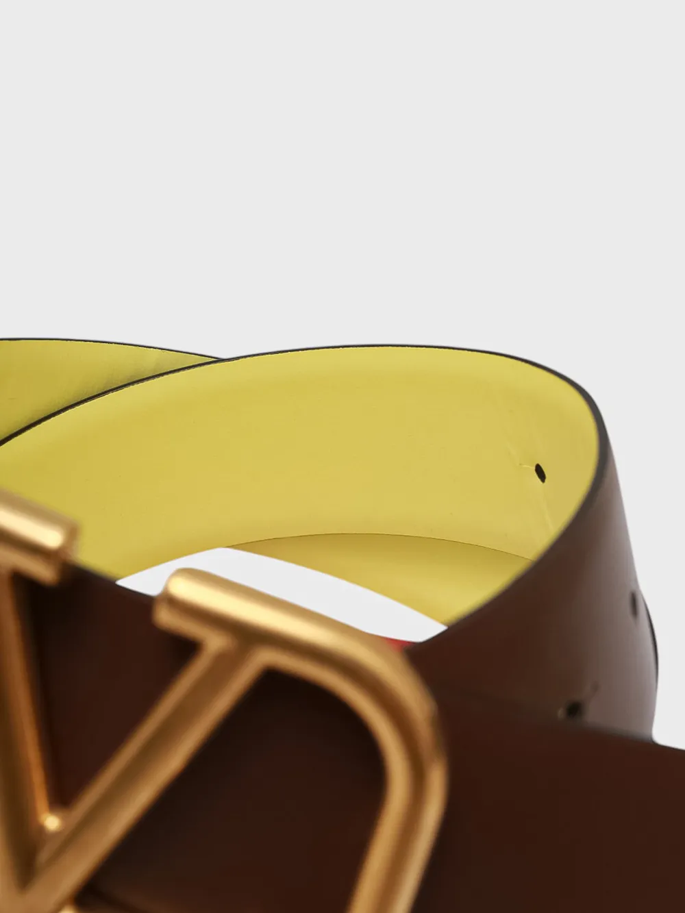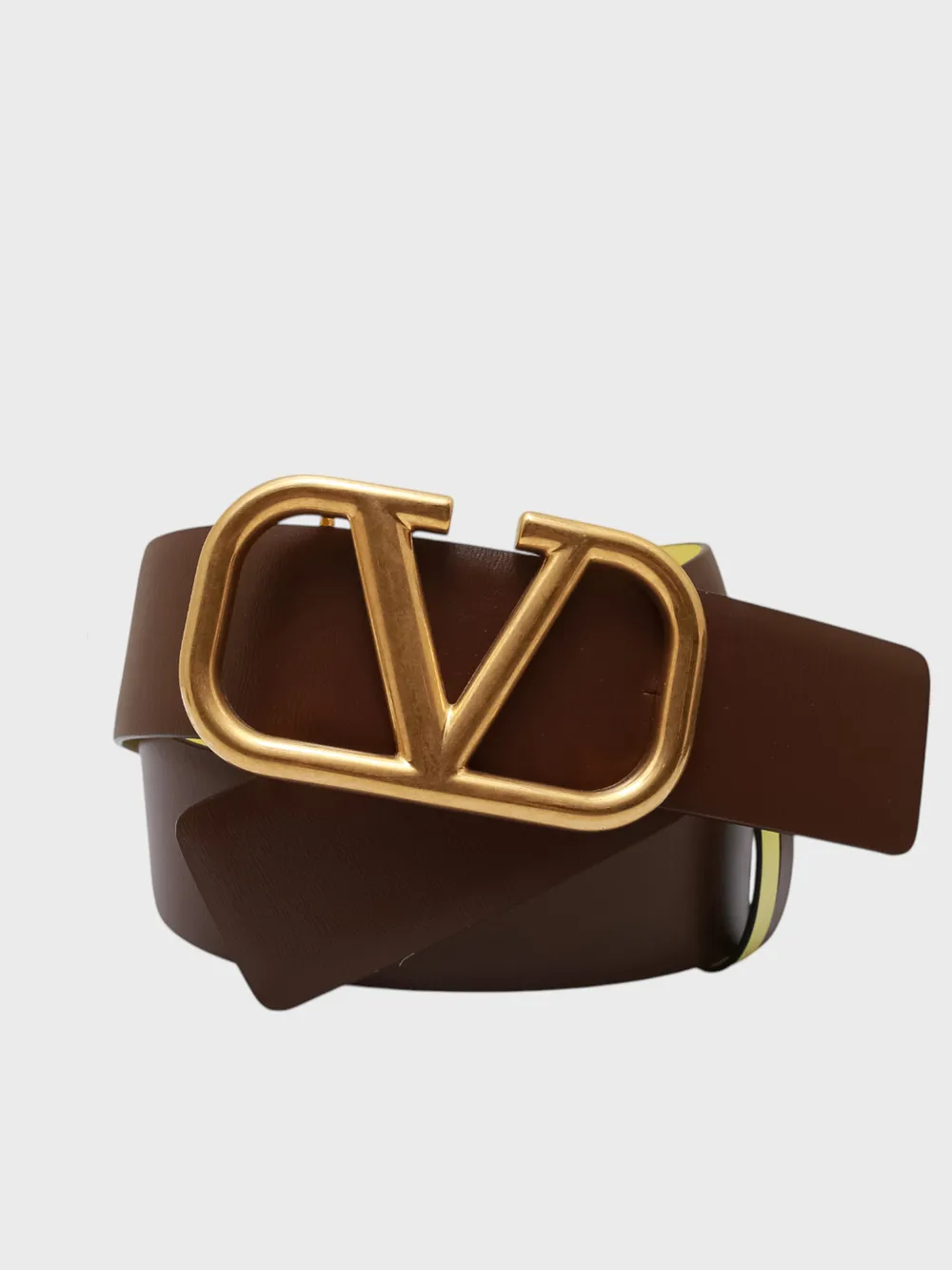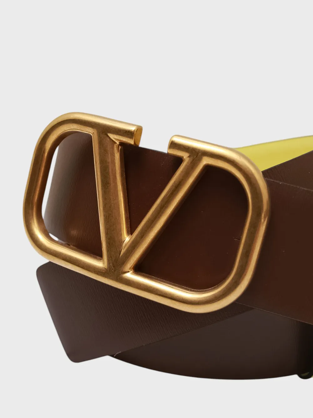 Ремень Valentino выполнен из качественной коричневой кожи с контрастной желтой окантовкой. Модель дополнена крупным золотым логотипом "V" в виде объемного бутика, который становится центральным акцентом. Классическая форма и высокое качество материалов обеспечивают долговечность и комфорт при использовании. Идеально подходит для завершения элегантных образов или создания современного стиля.