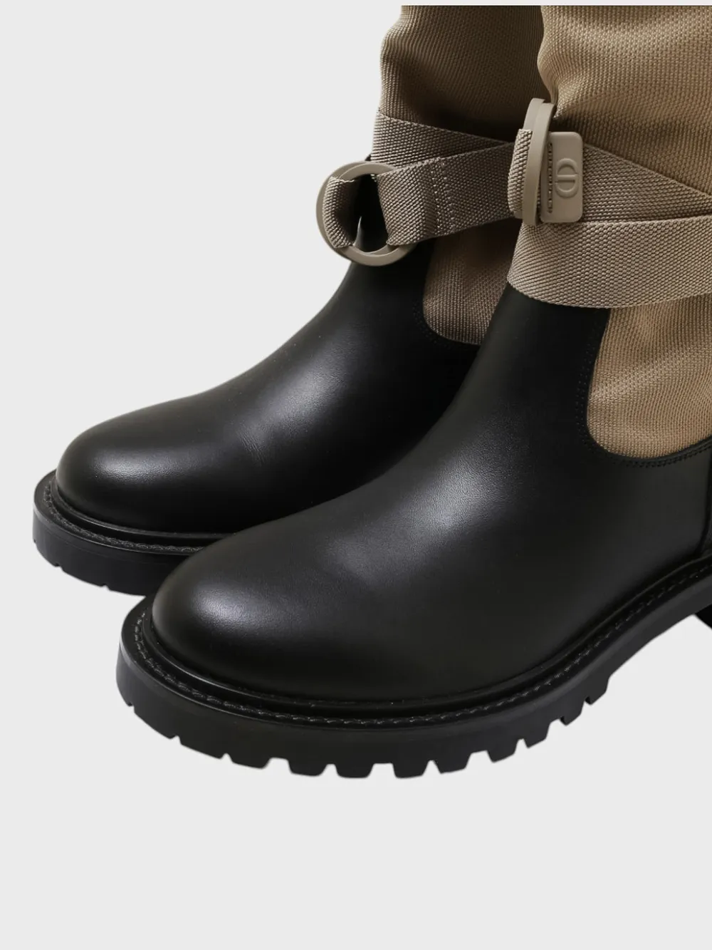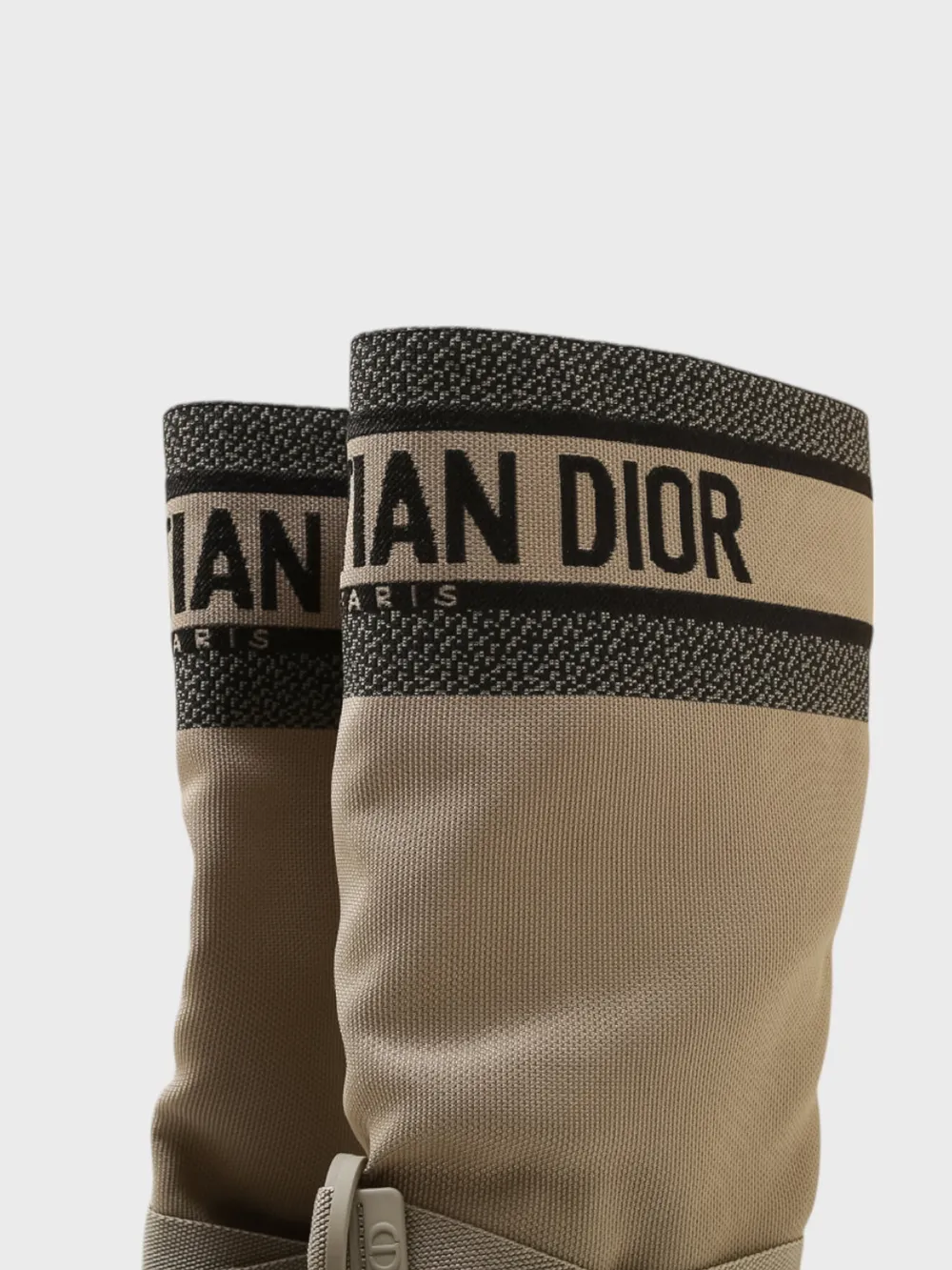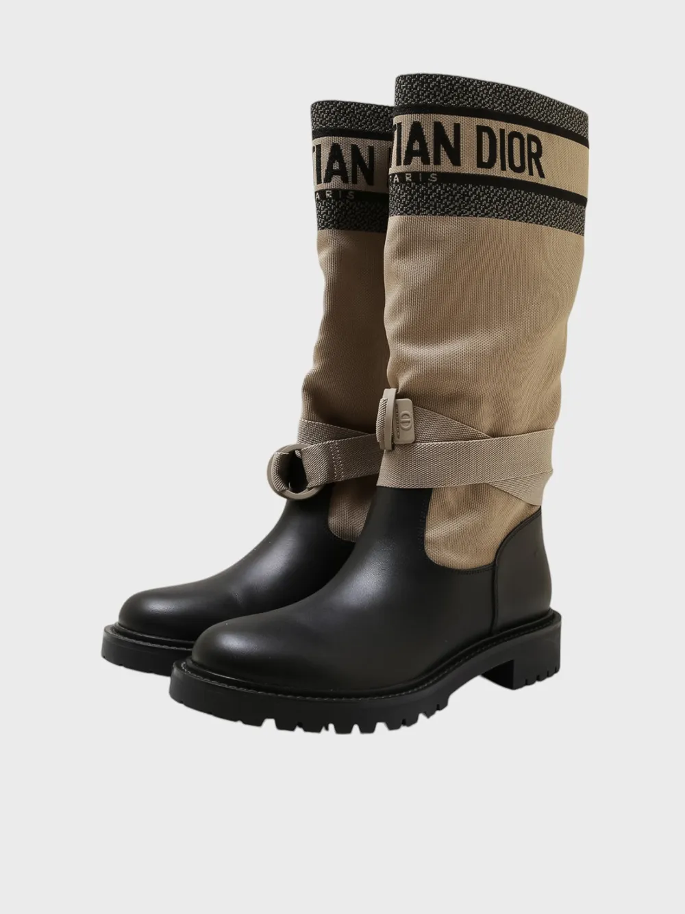 Сапоги Dior выполнены из комбинации высококачественной кожи и текстурированного материала в нейтральной палитре. Модель сочетает черный цвет нижней части с бежевым верхом, украшенным контрастной полосой с логотипом "DIOR PARIS". Эластичная конструкция обеспечивает комфортную посадку, а регулируемый ремешок на щиколотке позволяет подогнать обувь по фигуре. Плотная подошва с рифленой поверхностью гарантирует устойчивость и надежность даже при ходьбе по сложным поверхностям. Современный дизайн и премиальное качество делают эти сапоги идеальным выбором для стильных образов в холодное время года.