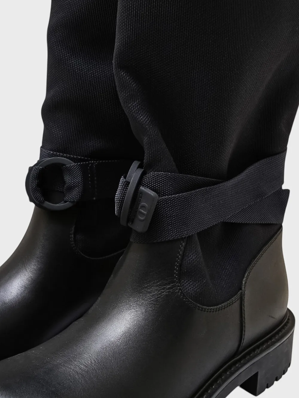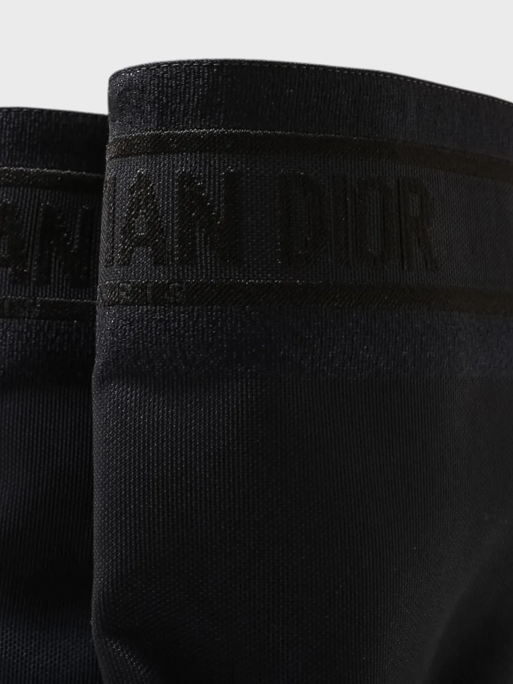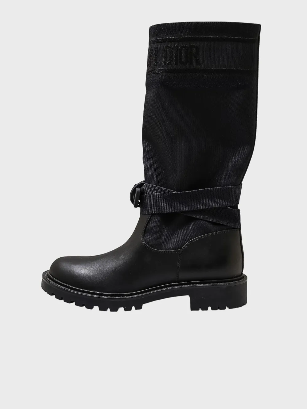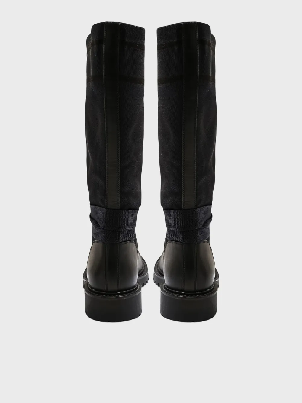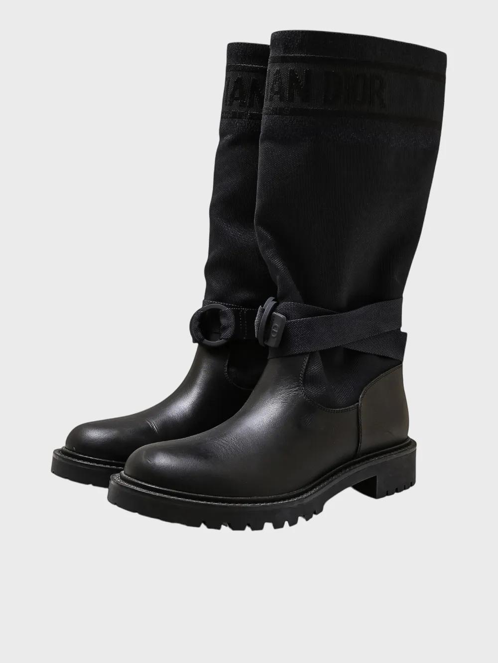 Сапоги Dior выполнены из комбинации черной кожи и текстурированного материала с контрастным логотипом "DIOR" на верхней части. Модель дополнена эластичными ремешками на щиколотке, обеспечивающими комфортную посадку и регулируемость. Плотная подошва с рифленой поверхностью гарантирует устойчивость и надежность даже при ходьбе по сложным поверхностям. Современный дизайн и премиальное качество делают эти сапоги идеальным выбором для стильных образов в холодное время года.