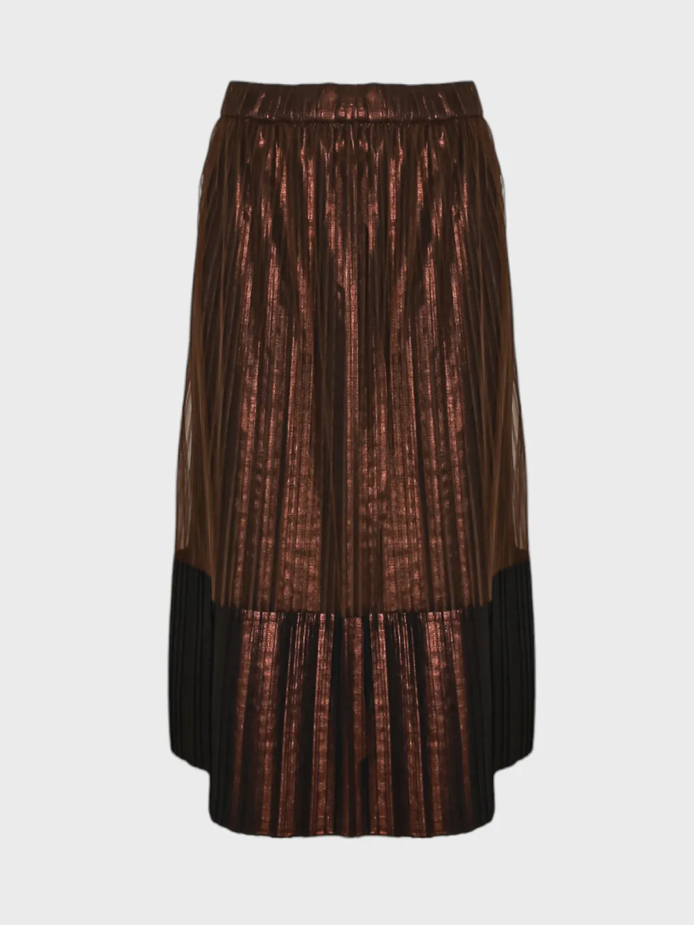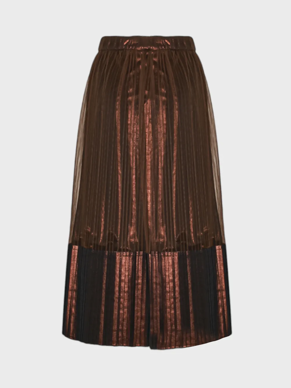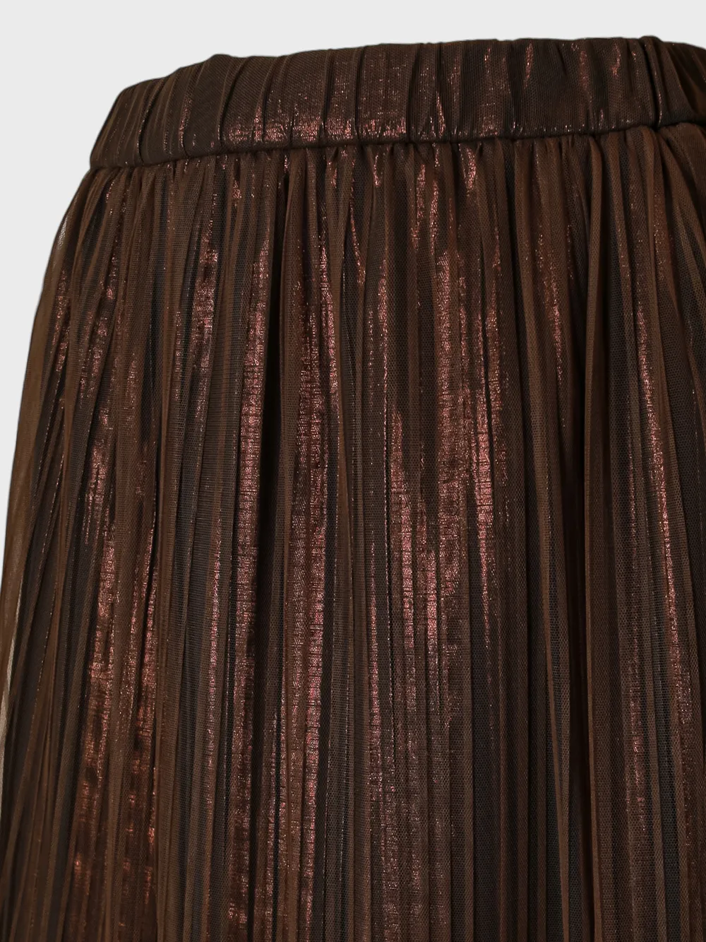 Юбка Brunello Cucinelli выполнена из качественного темно-коричневого материала с эффектом металлизации. Модель дополнена складками, которые придают юбке объем и текстуру. Простой дизайн и элегантные детали делают юбку идеальным выбором для вечерних мероприятий или особенных случаев.